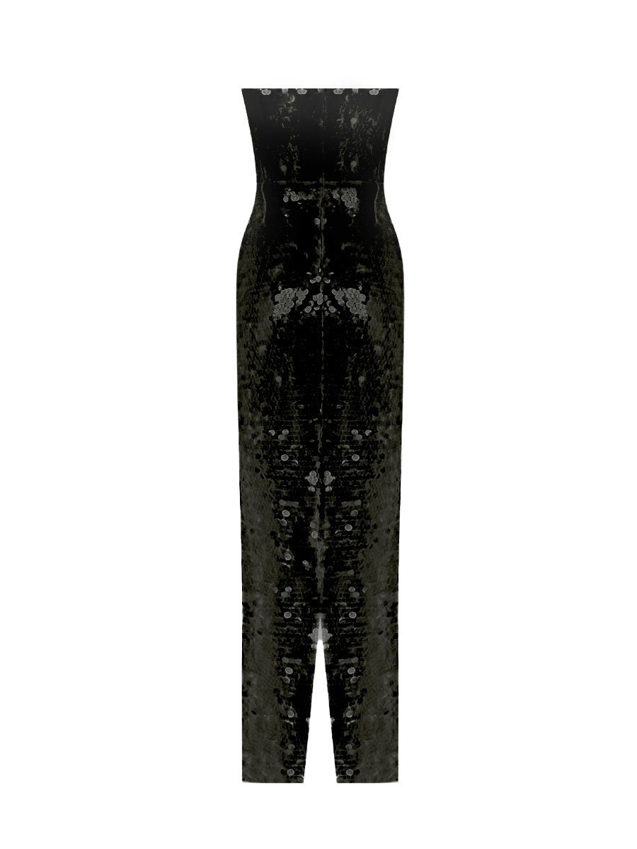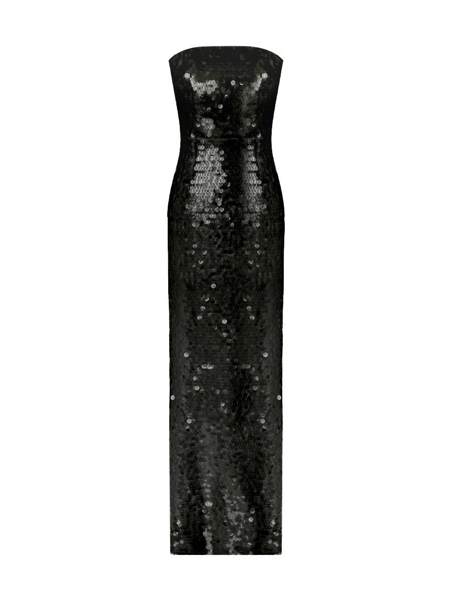 Exude dazzling elegance in the Loren Glam Dress by Gigii's. This strapless sequin gown is designed to captivate, with its shimmering black sequins that catch the light at every angle. The body-hugging silhouette enhances your natural curves, while the strapless design beautifully showcases your shoulders, offering a refined and sophisticated look.