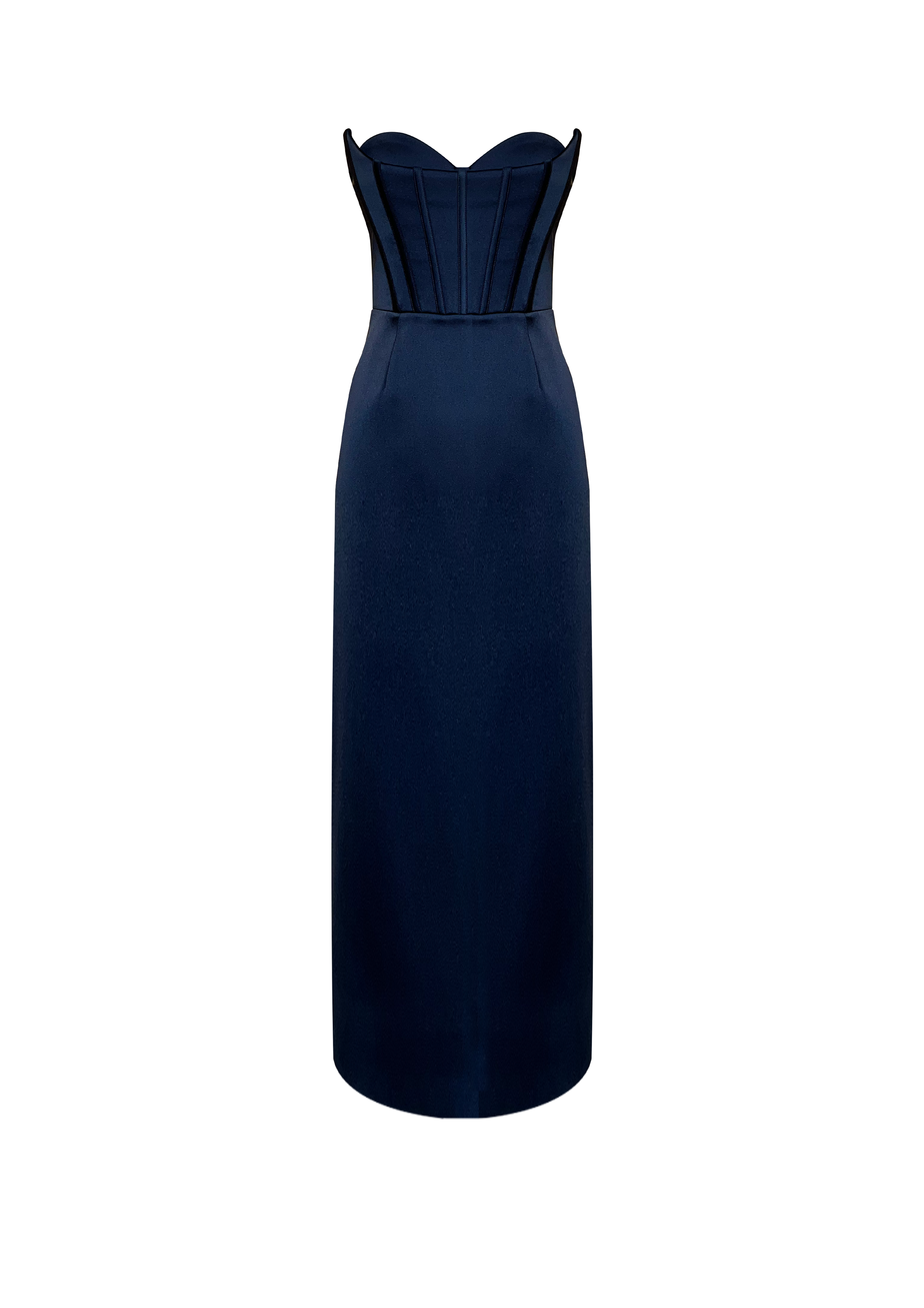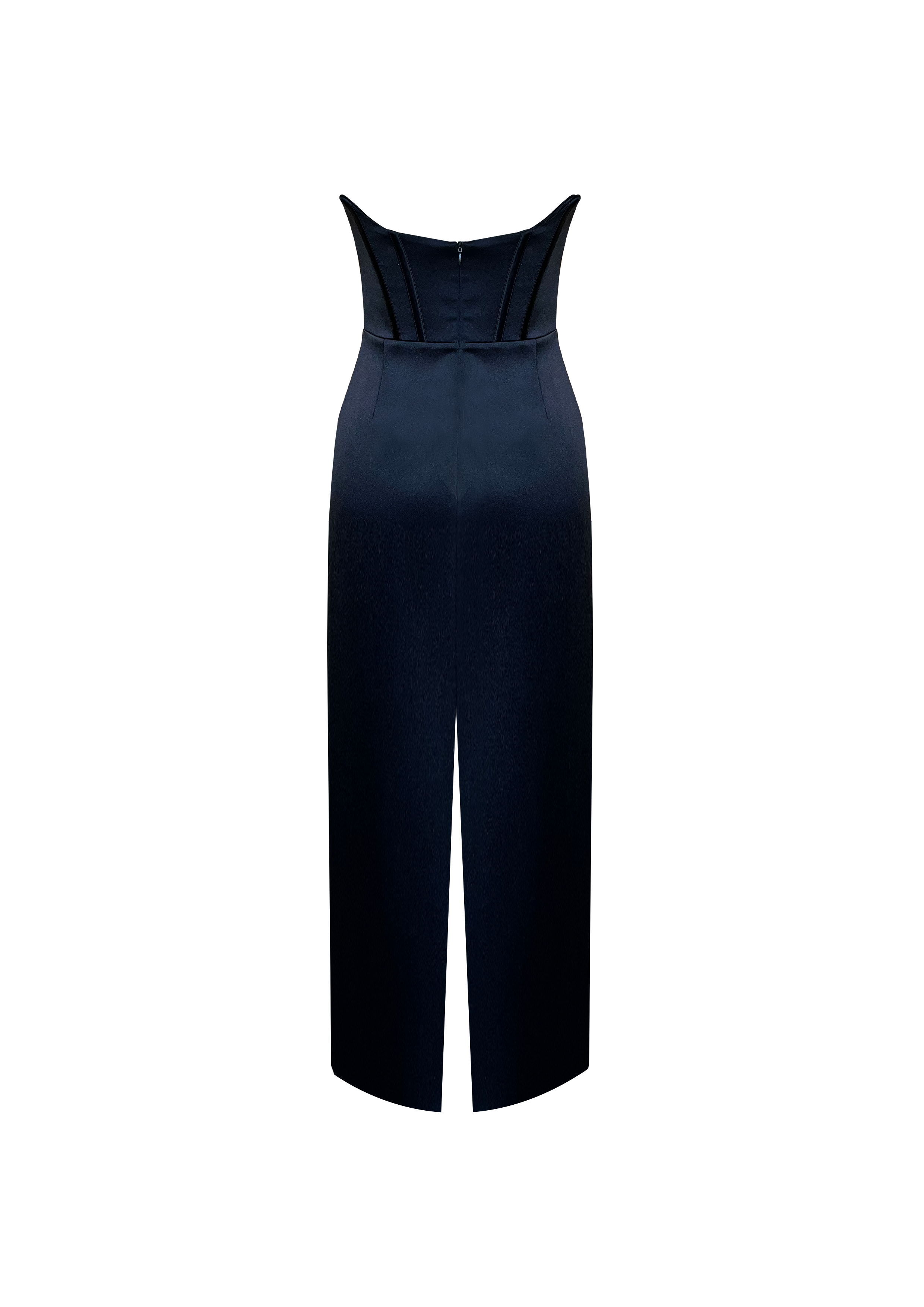 The dress features a corset-style, underwired bodice that provides structured support, eliminating the need for a bra and ensuring a flawless fit. Its sheath silhouette gently contours the body, highlighting natural curves, while the midi length strikes a timeless balance between classic charm and modern allure.
