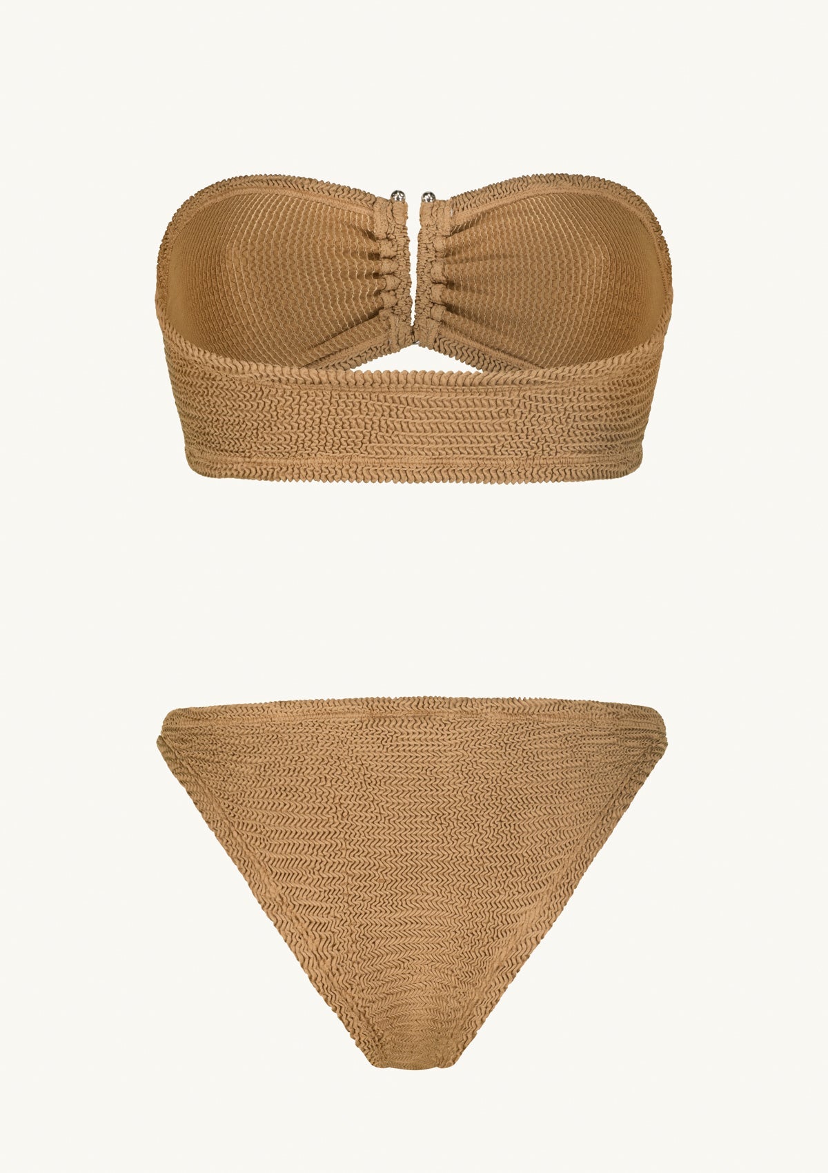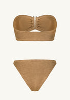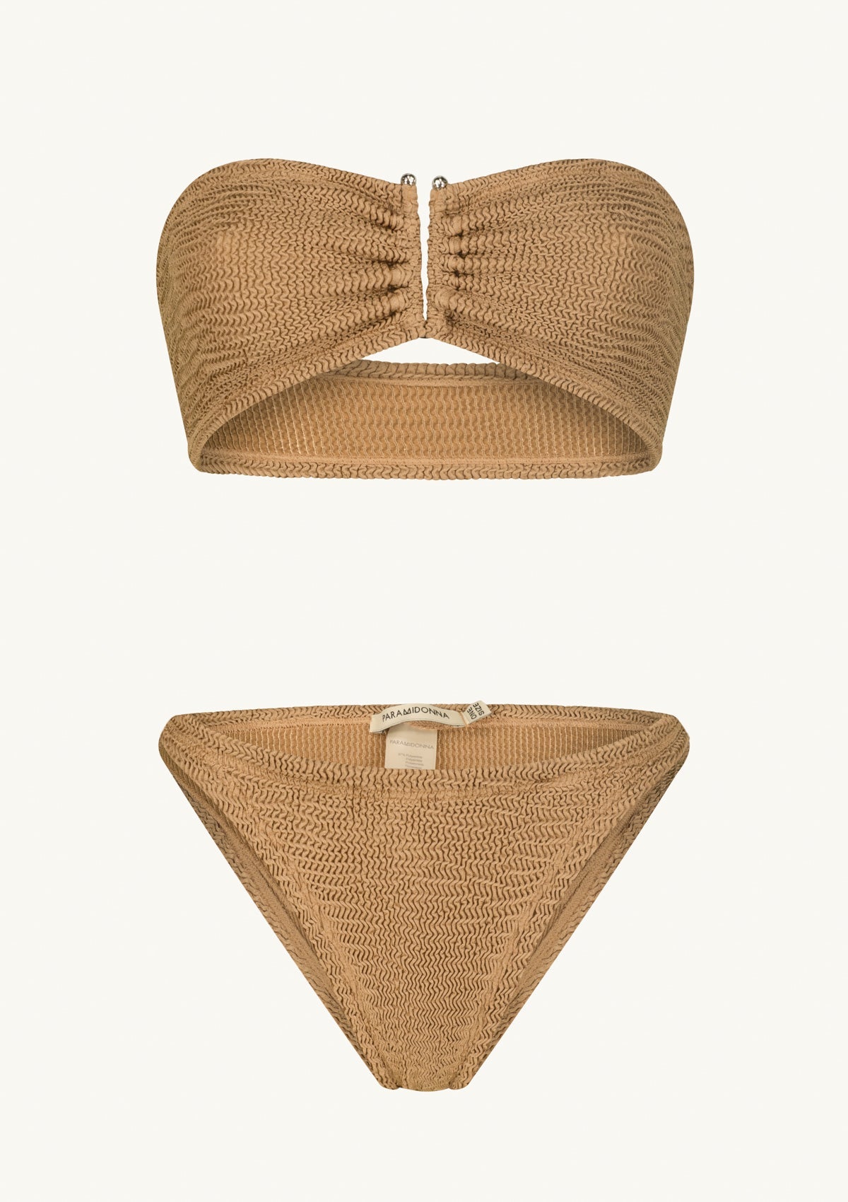 Two-piece FRIDA CAMEL swimsuit by PARAMIDONNA. The one size model is designed to flatter sizes from XS to 2XL. The strapless bustier top features a stylish cut-out in the middle, accentuated by a metallic accessory, while the moderate cut, low-waisted bikini bottom ensures a comfortable fit. This swimsuit is perfect for achieving an even tan. FRIDA's adaptable design suits women of all bust sizes, ensuring a great fit every time. The beige swimsuit pairs perfectly with the GRACE crystal skirt in the same colour.