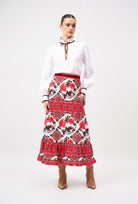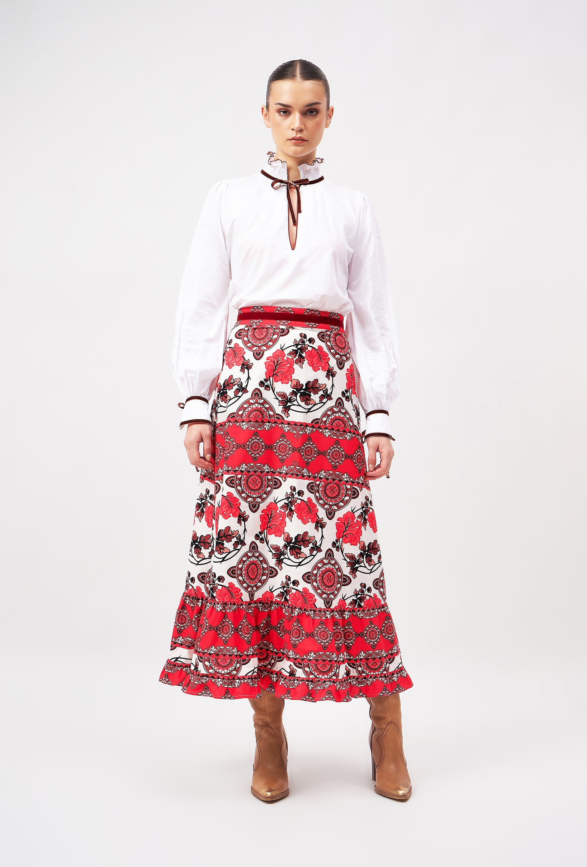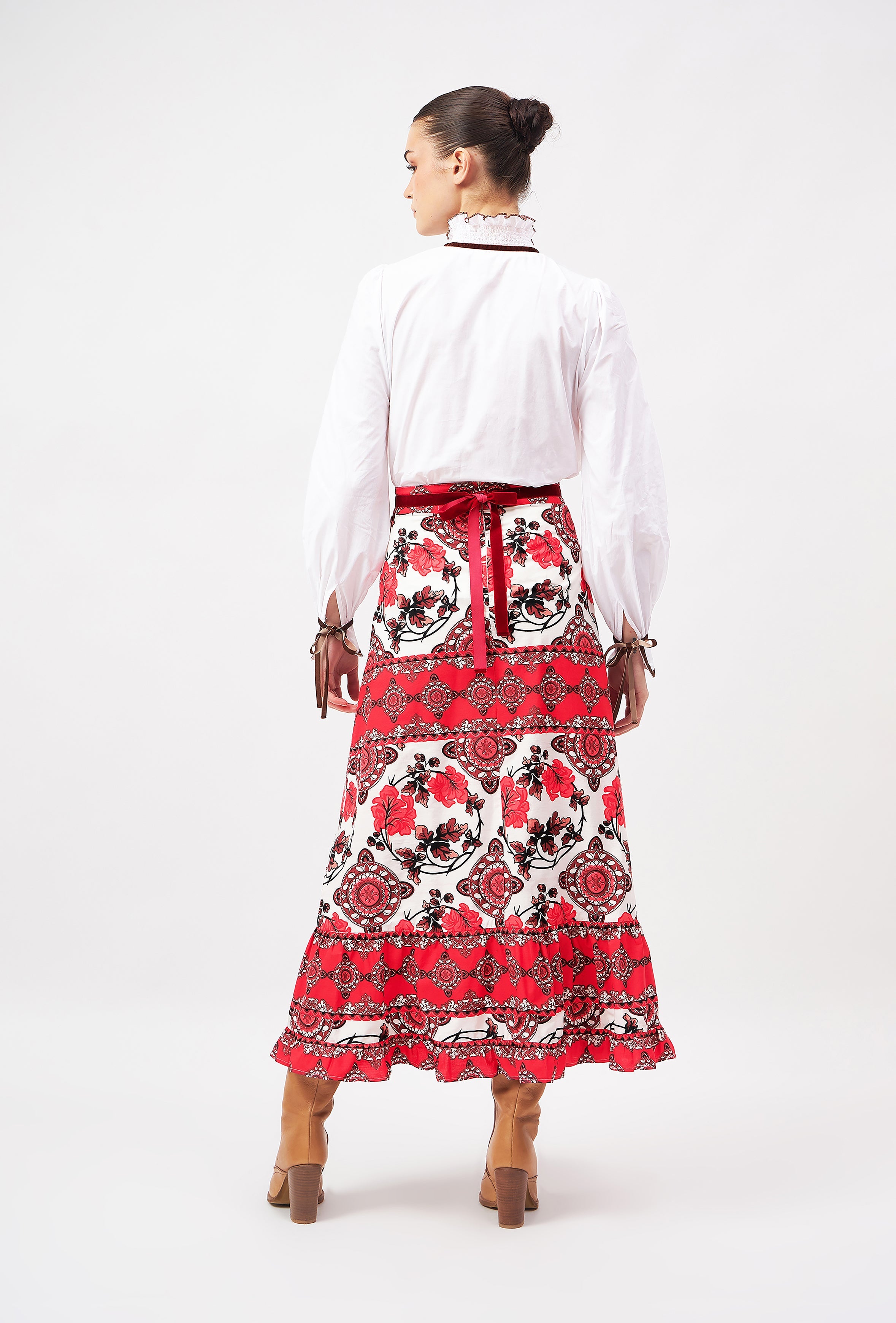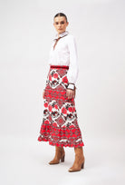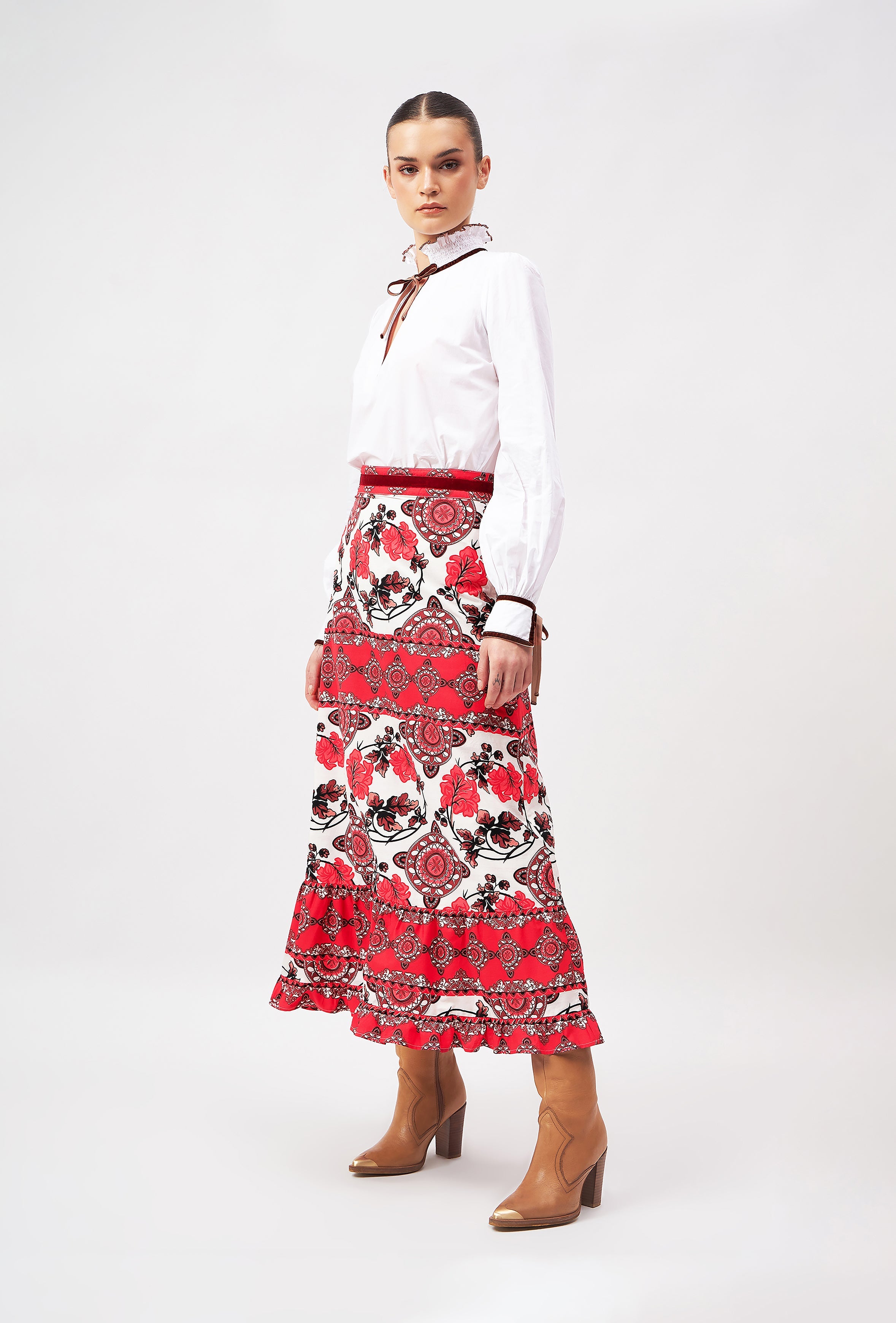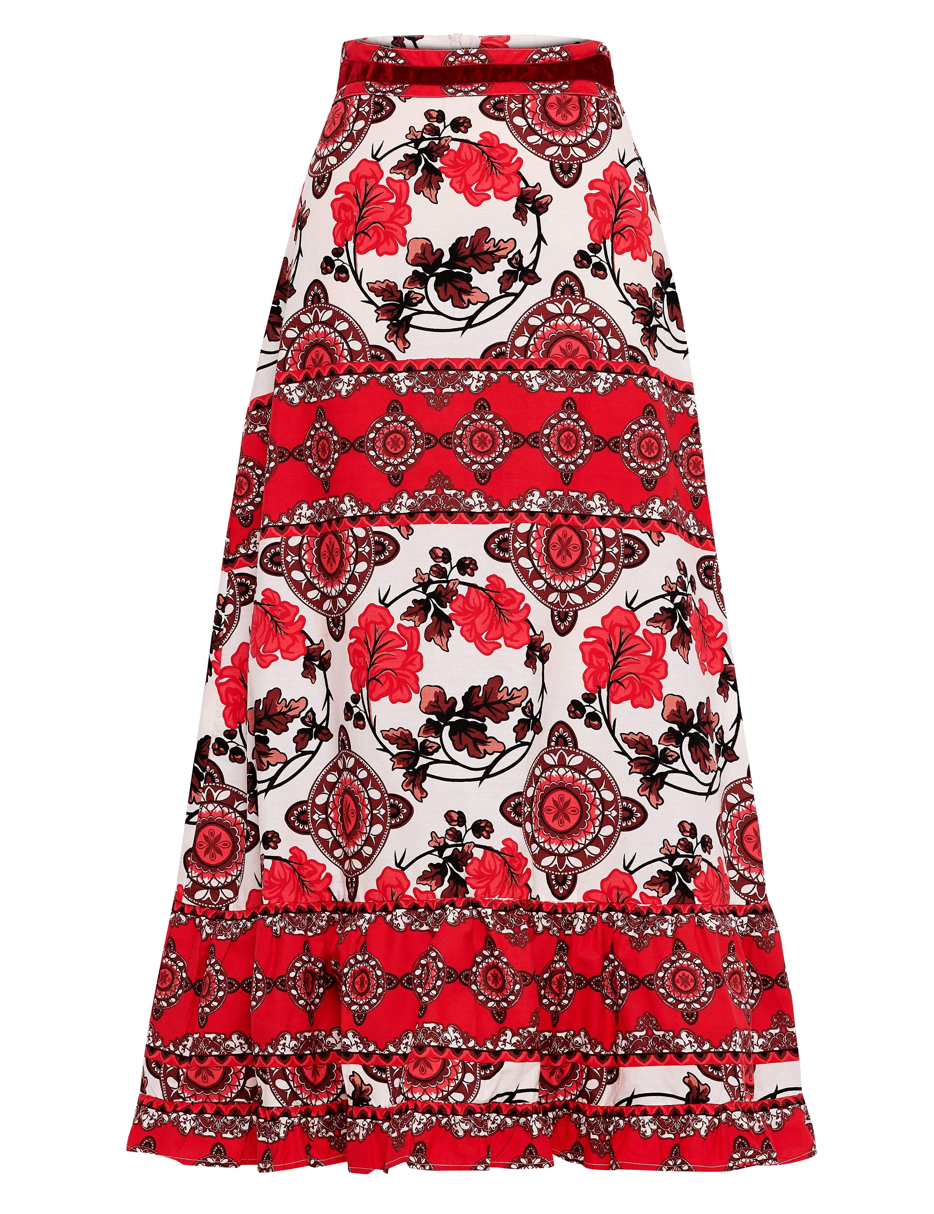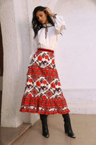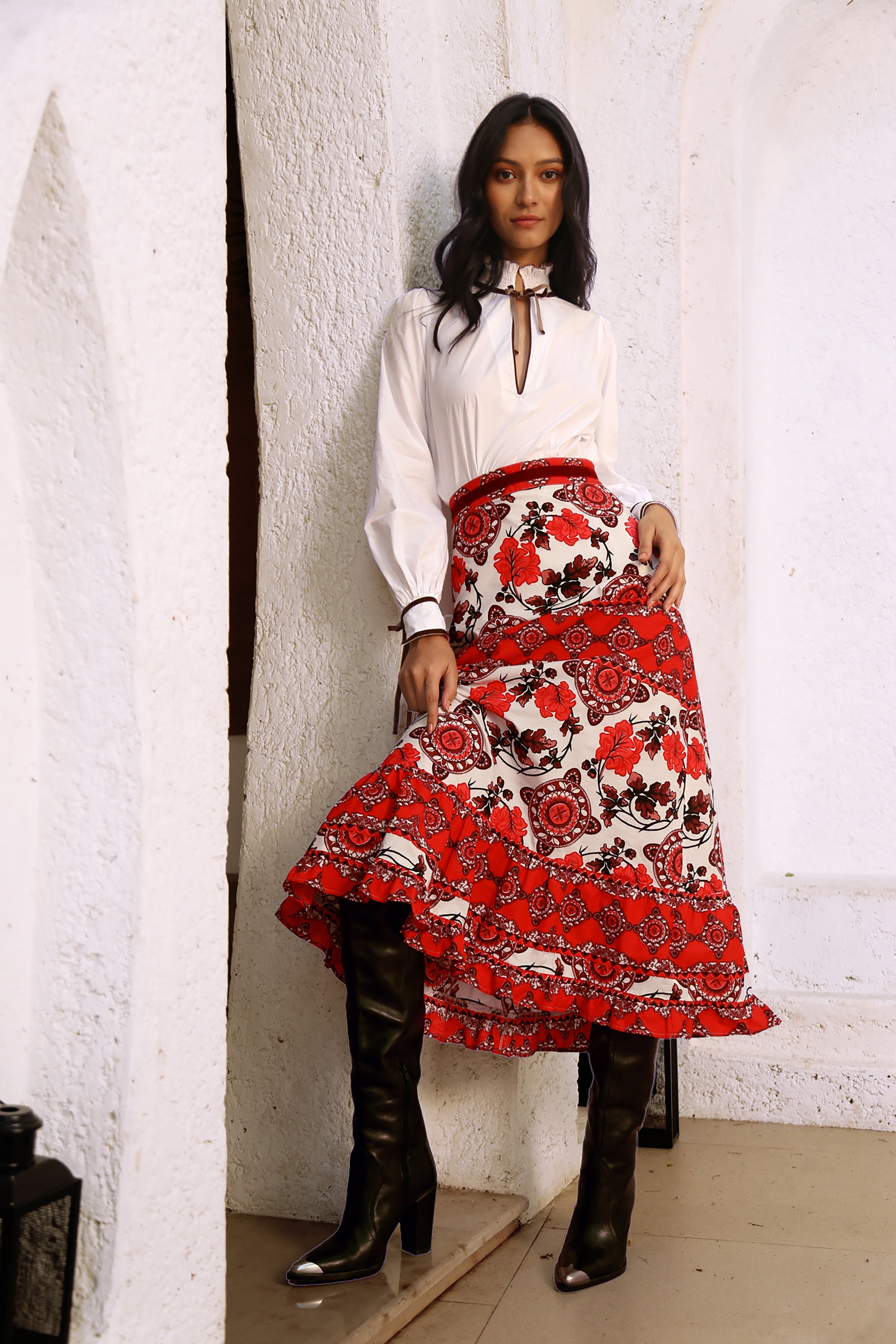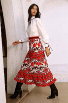 Introducing the Aurora - a flattering midi skirt for all occasions. Her high waist and adjustable velvet belt guarantee a flawless fit. The slender A-line falls to an elegant ruffled hem. Style her casually with flats or pair the Aurora with heels for a festive flair. Inspired by the rugged charm of the Atlas Mountains, this print references the diverse foliage and the terracotta landscapes of Morocco's iconic mountain range.