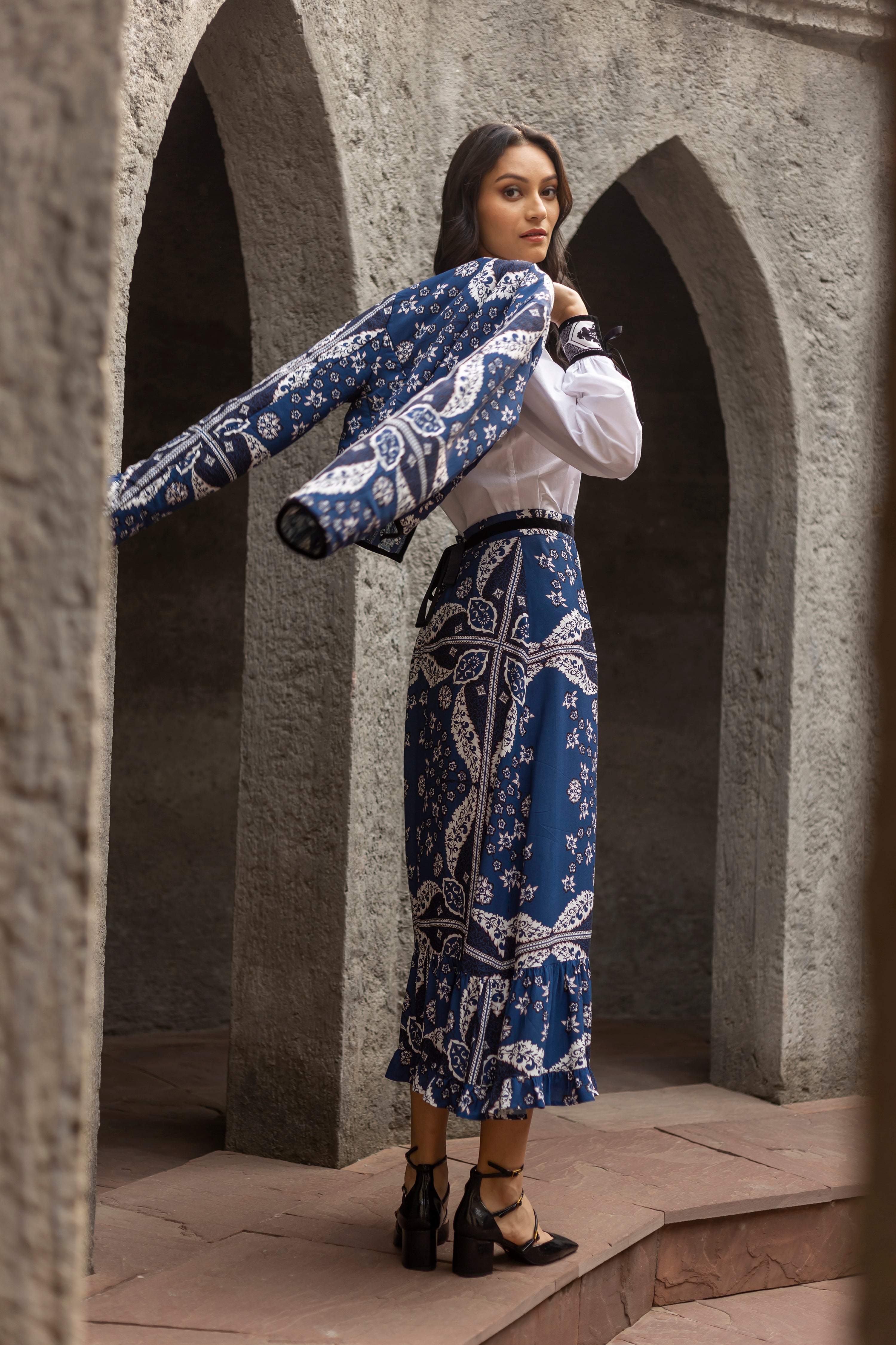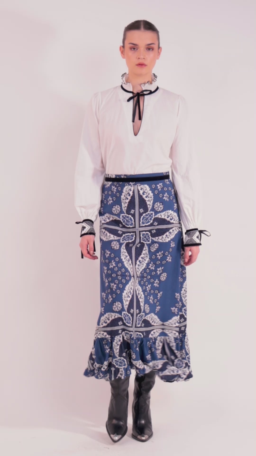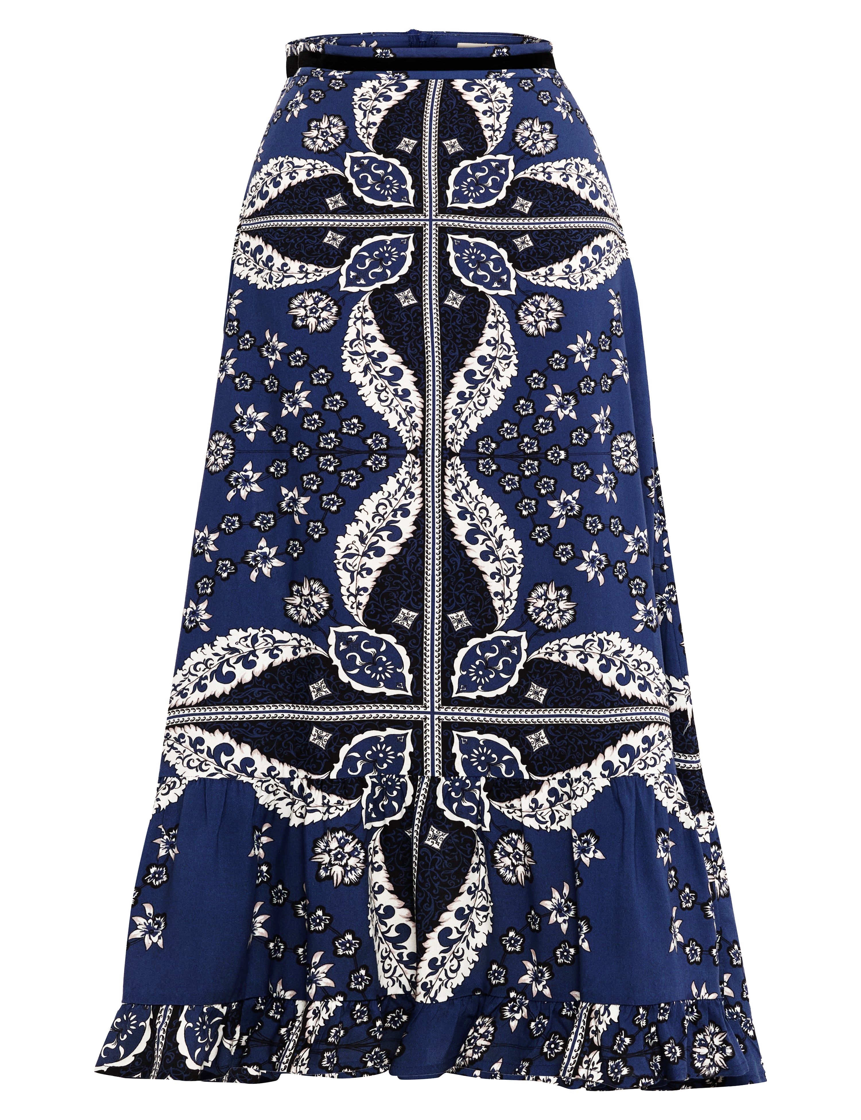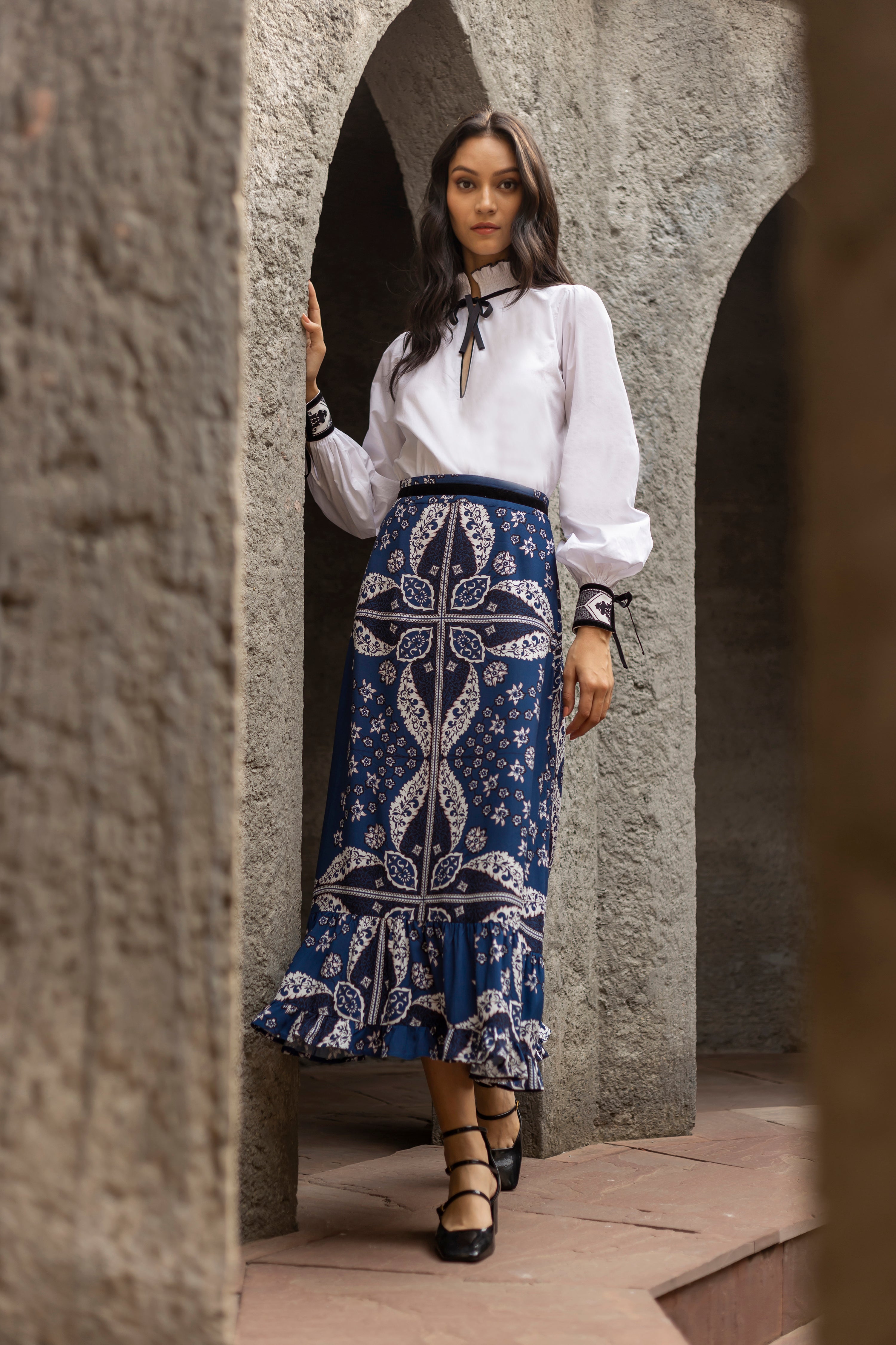 Introducing the Aurora, a flattering midi skirt for all occasions. Her high waist and adjustable velvet belt guarantee a flawless fit. The slender A-line falls to an elegant ruffled hem. Style her casually with flats or pair the Aurora with heels for a festive flair. Reflecting the charm of Bahia Palace in Marrakesh, this print design draws inspiration from the grand tiles of the palace, blending geometric elegance with whimsical ornaments in celebration of Moroccan mosaic artistry.