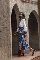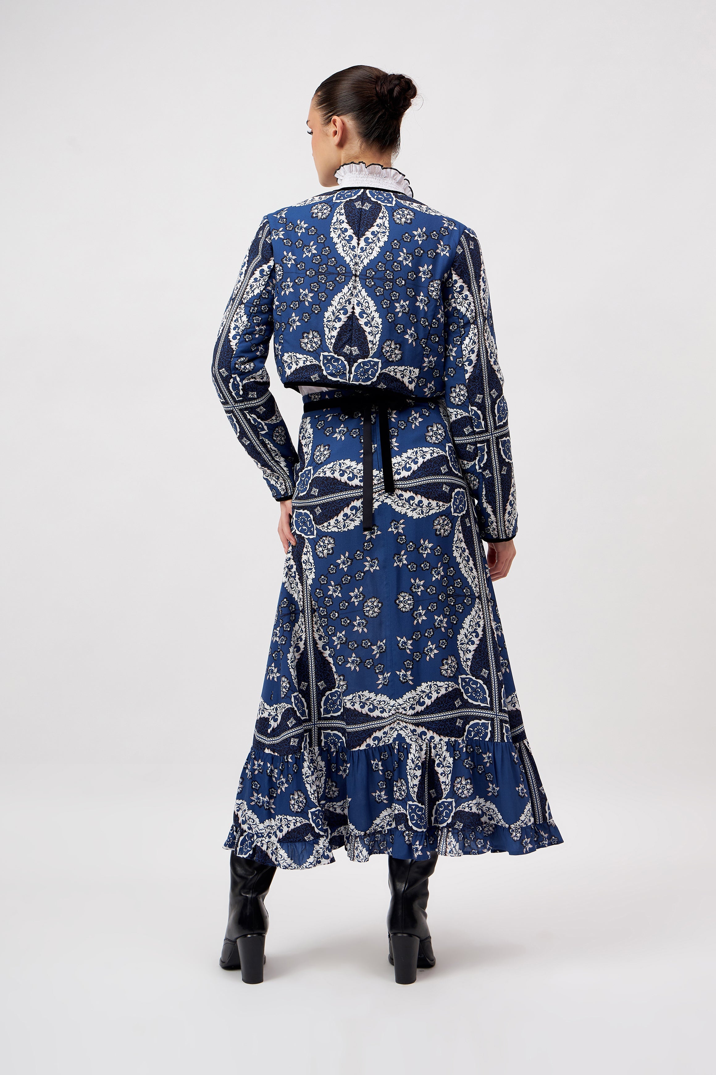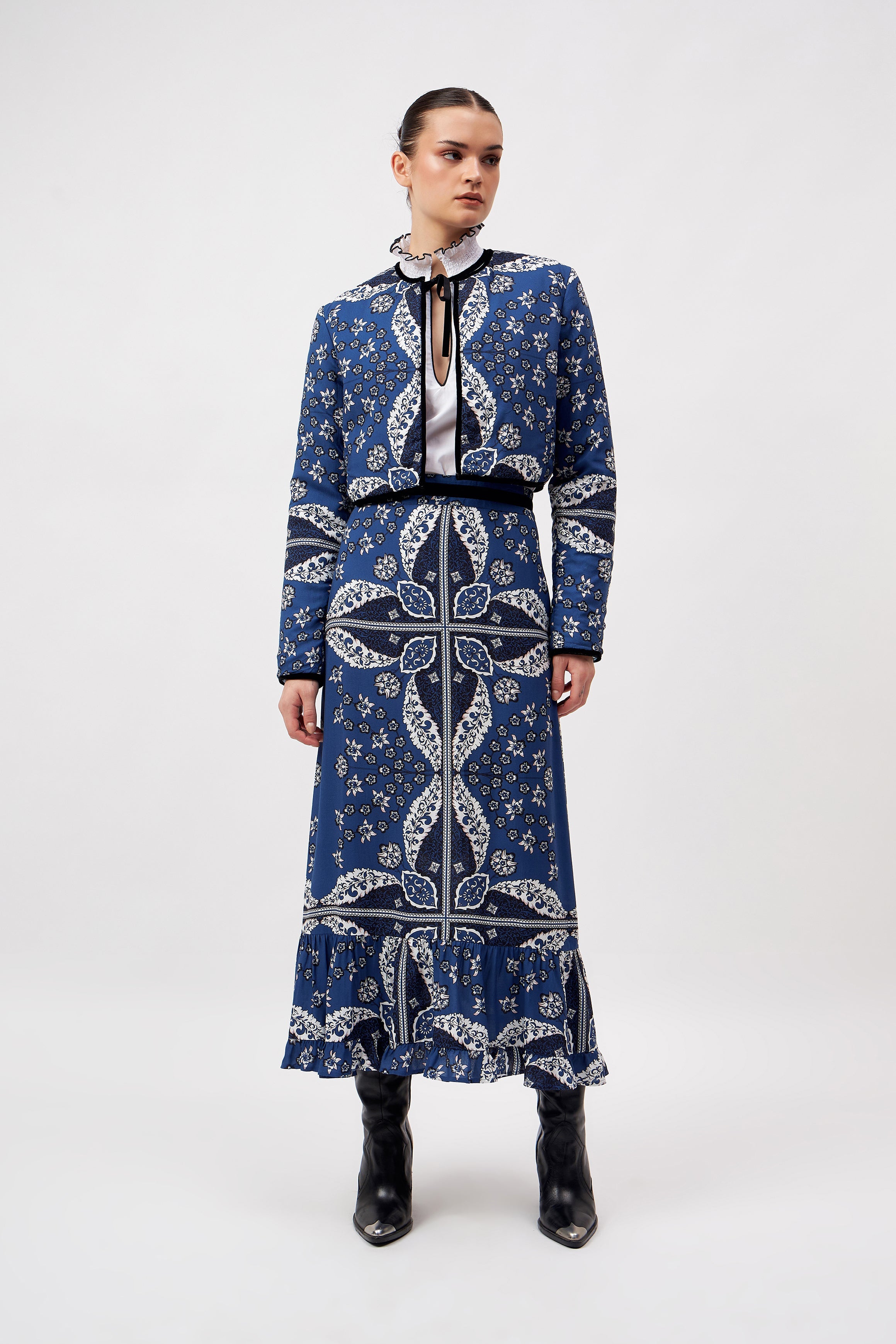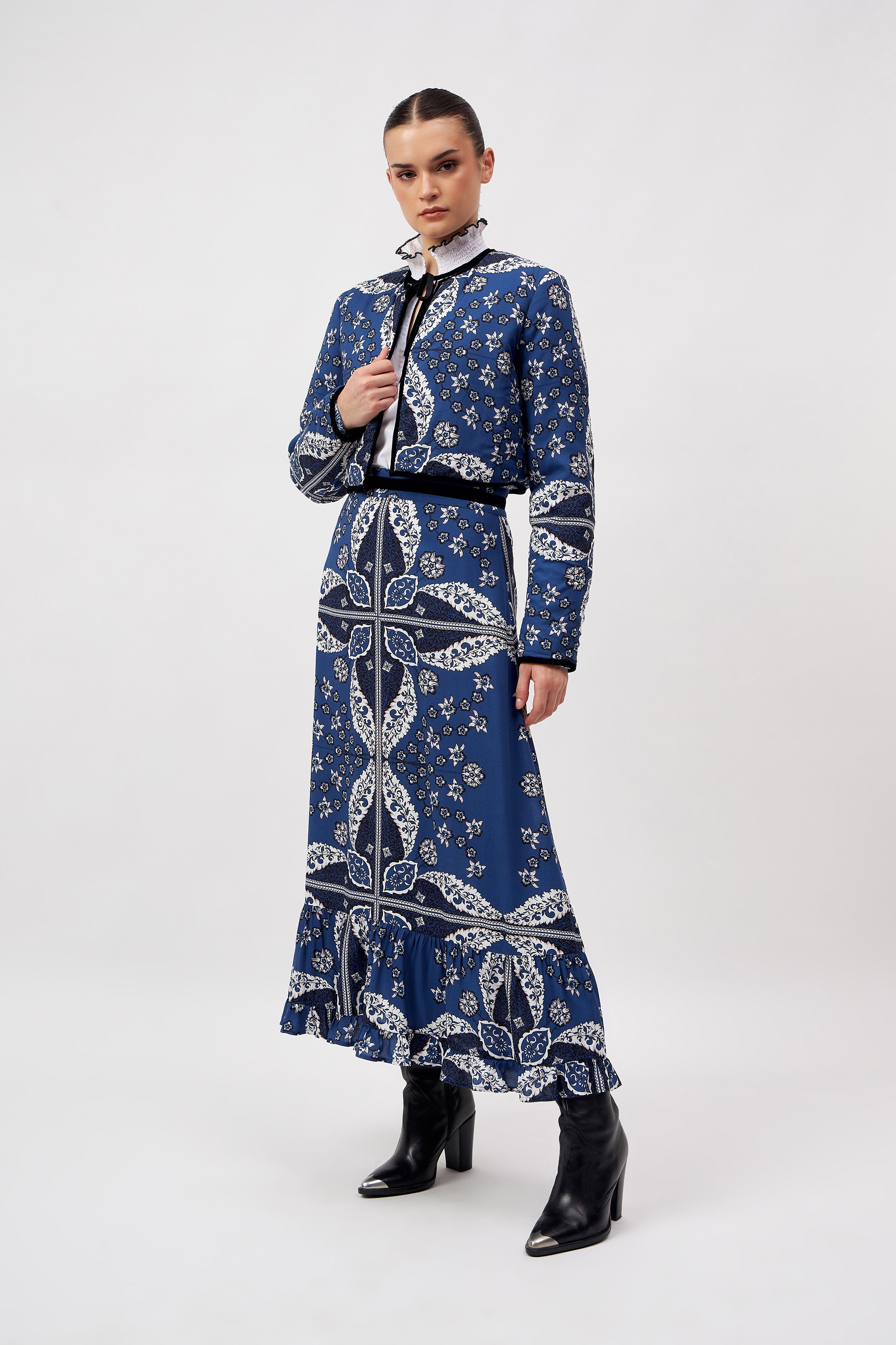Introducing the Aurora, a flattering midi skirt for all occasions. Her high waist and adjustable velvet belt guarantee a flawless fit. The slender A-line falls to an elegant ruffled hem. Style her casually with flats or pair the Aurora with heels for a festive flair. Reflecting the charm of Bahia Palace in Marrakesh, this print design draws inspiration from the grand tiles of the palace, blending geometric elegance with whimsical ornaments in celebration of Moroccan mosaic artistry.