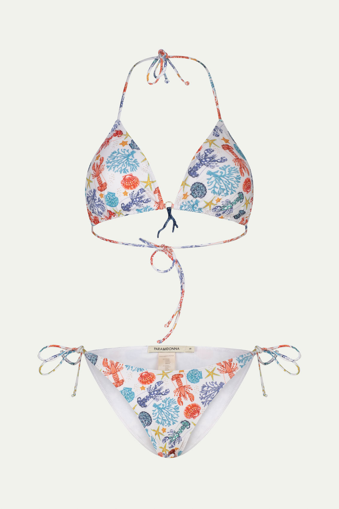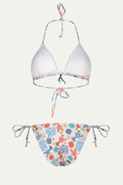 KOURTNEY White Coral Set from PARAMIDONNA, a perfect fusion of style and practicality. Available in sizes S, M, and L, this set features a classic triangular top and a mid-cut bottom with a low waist. Both pieces are adjustable with ties, ensuring a comfortable fit for ladies of all bust and hip measurements. Made from high-quality, quick-drying fabric, the KOURTNEY White Coral Set combines perfectly with PARAMIDONNA's beachwear for a chic, coordinated look.