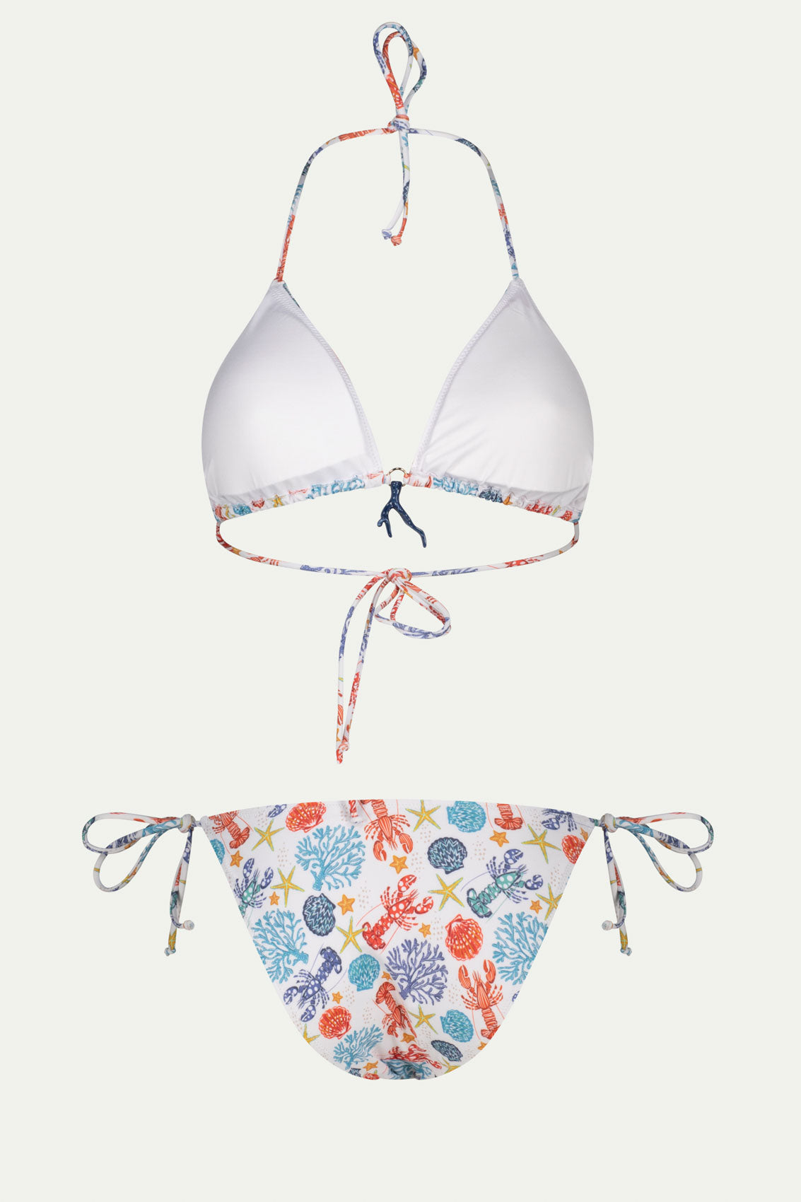 Details: triangular bra cups, ties, low waist