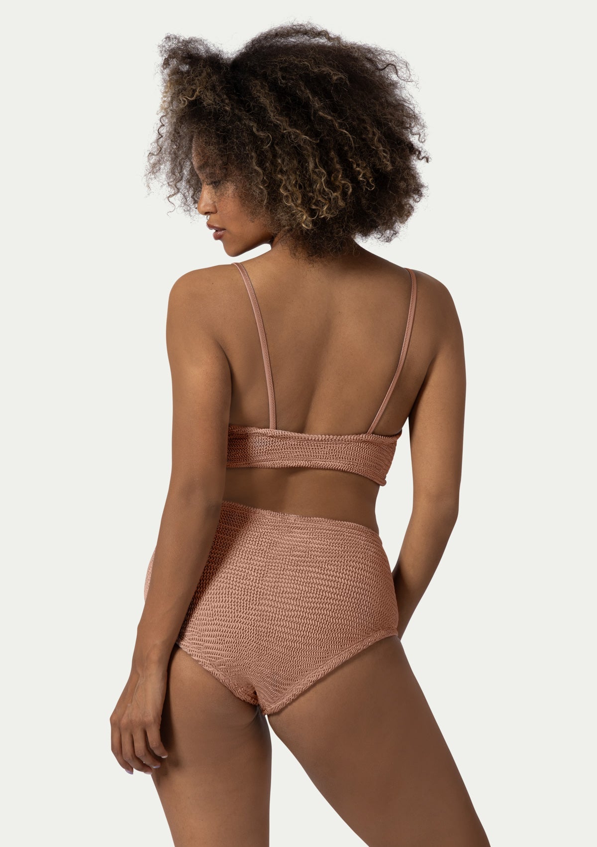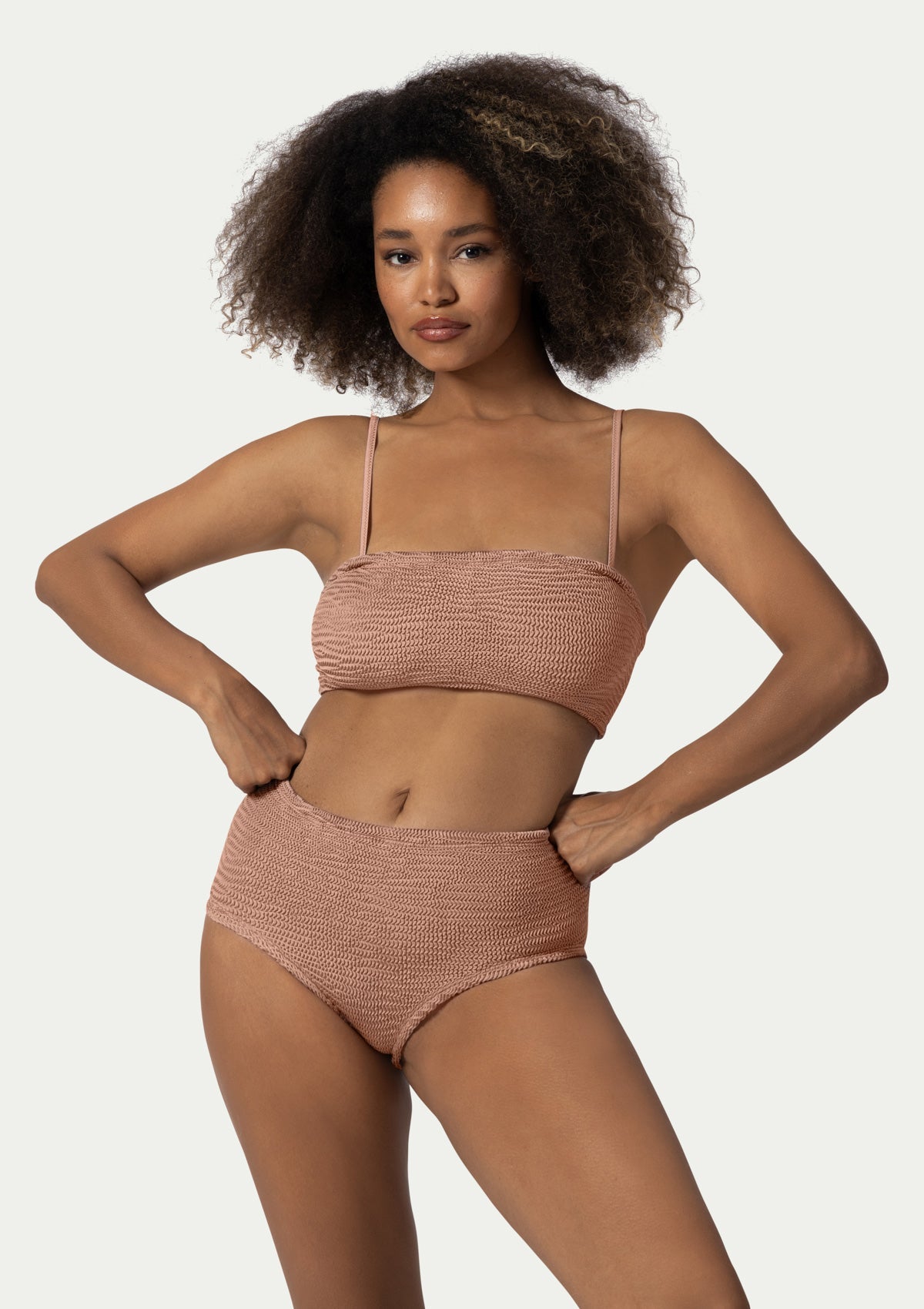 Two-piece MARIE ROSE BEIGE swimsuit by PARAMIDONNA. Crafted from high-quality, highly elastic fabric, it fits sizes from XS to 2XL. The bustier-style top features thin straps, while the high-waisted bikini bottom offers a flattering fit. The MARIE model contours the body, ensuring comfort and confidence.