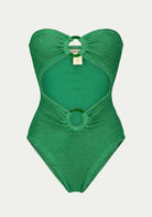 One-piece RENE EMERALD by PARAMIDONNA. Designed in a universal size fitting XS to 2XL, this model features a strapless design. It includes two metal rings in caramel and a cut-out element in the front. The RENE model offers a stylish silhouette, accentuating the waist while providing coverage and support.