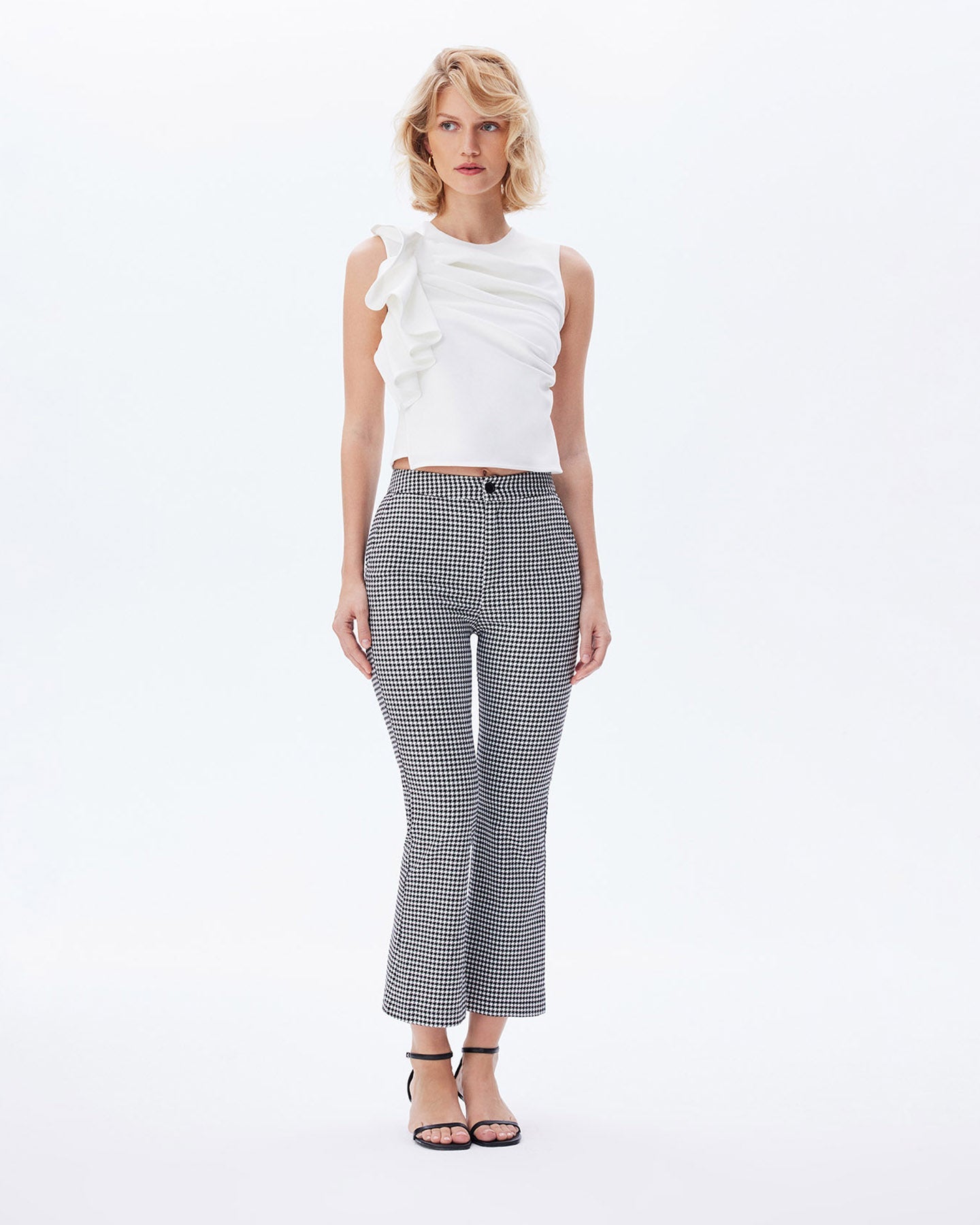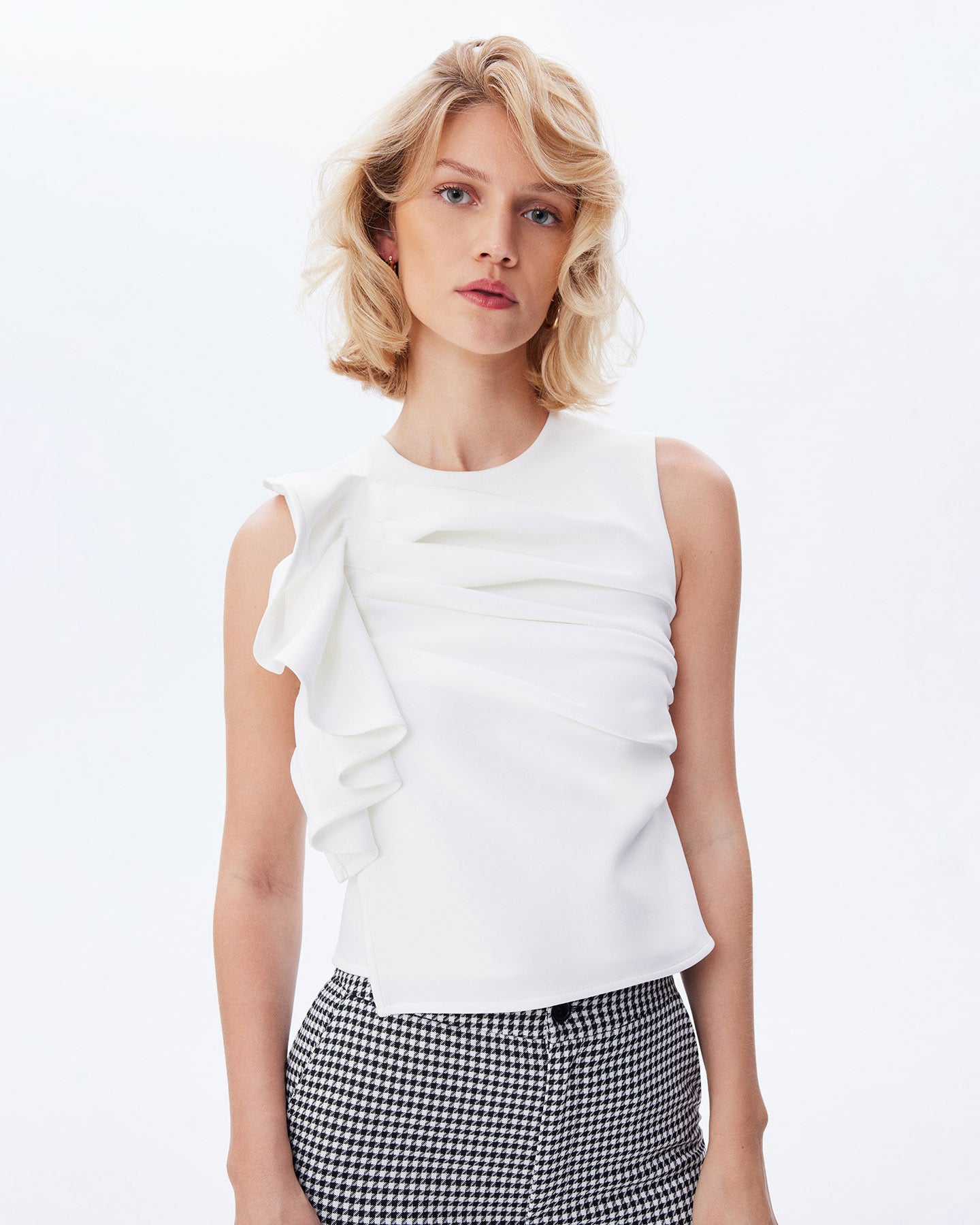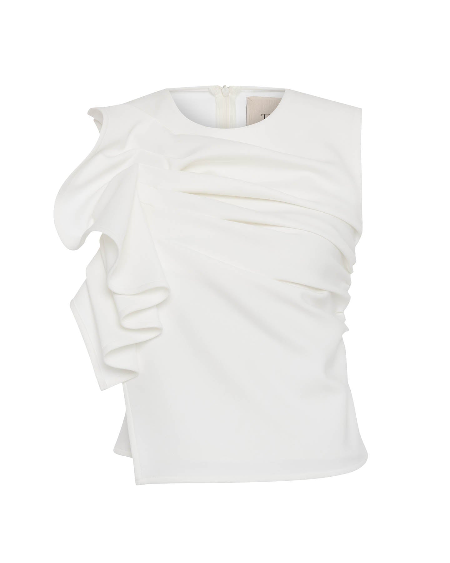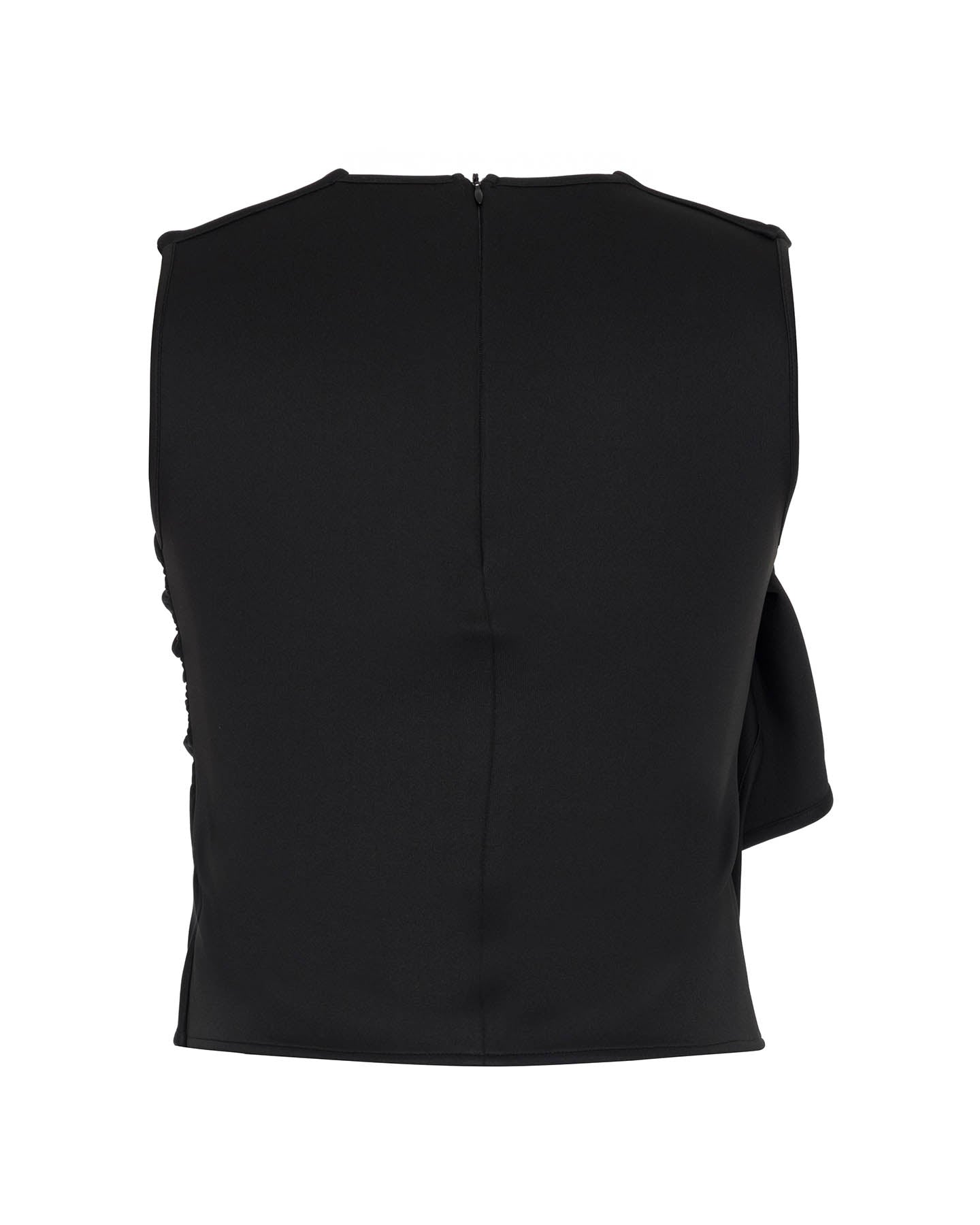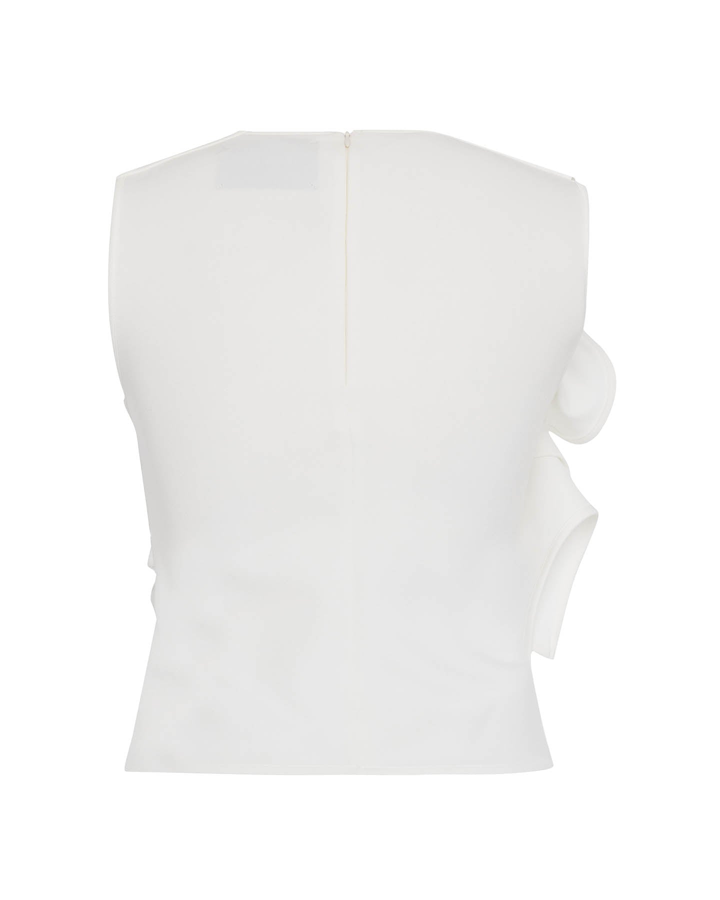 The Atlas Bow Scuba Top redefines modern elegance with its faux wrap design, side ruching, and asymmetrical hem. Crafted from stretch scuba fabric, this sleeveless top is as comfortable as it is stylish.