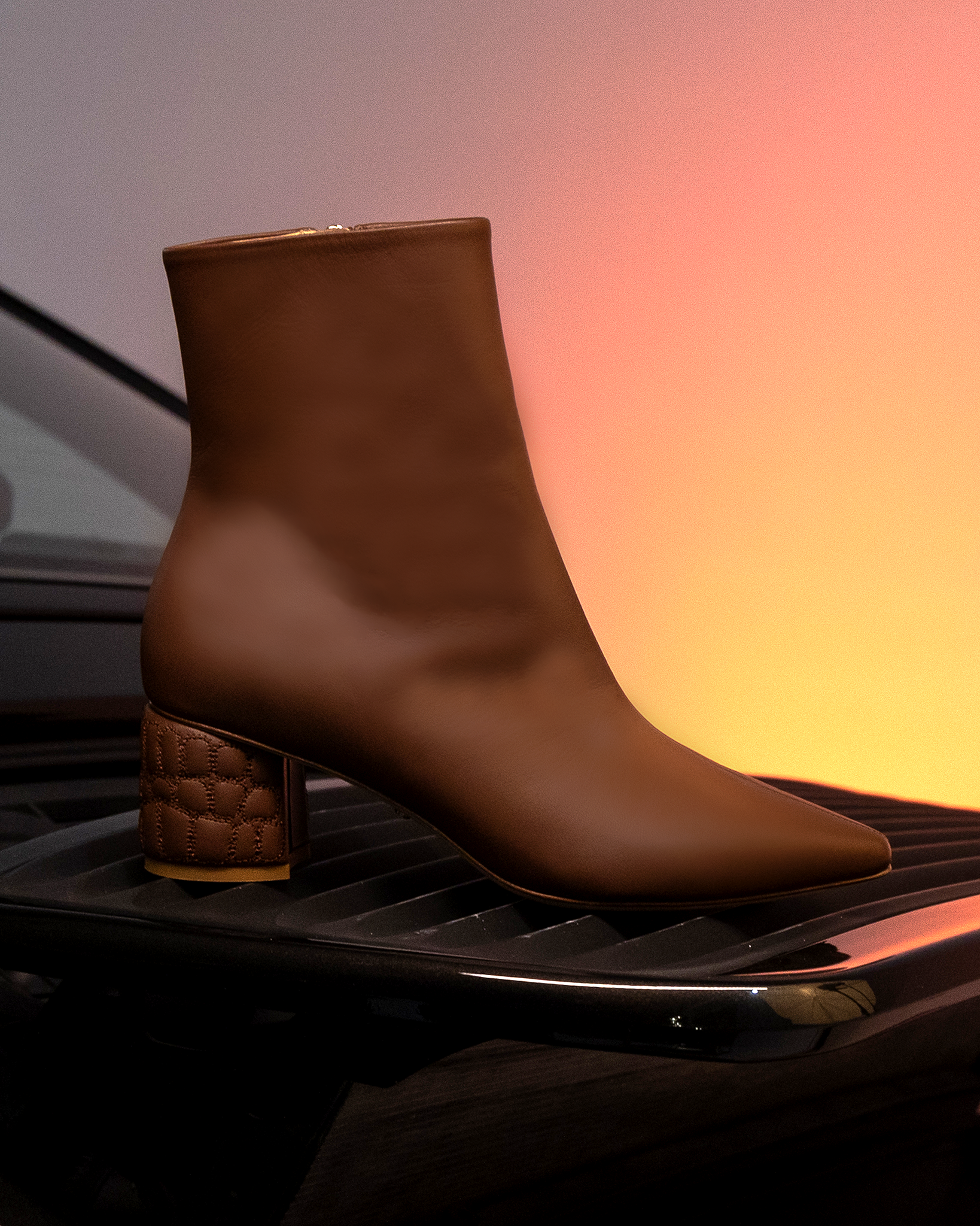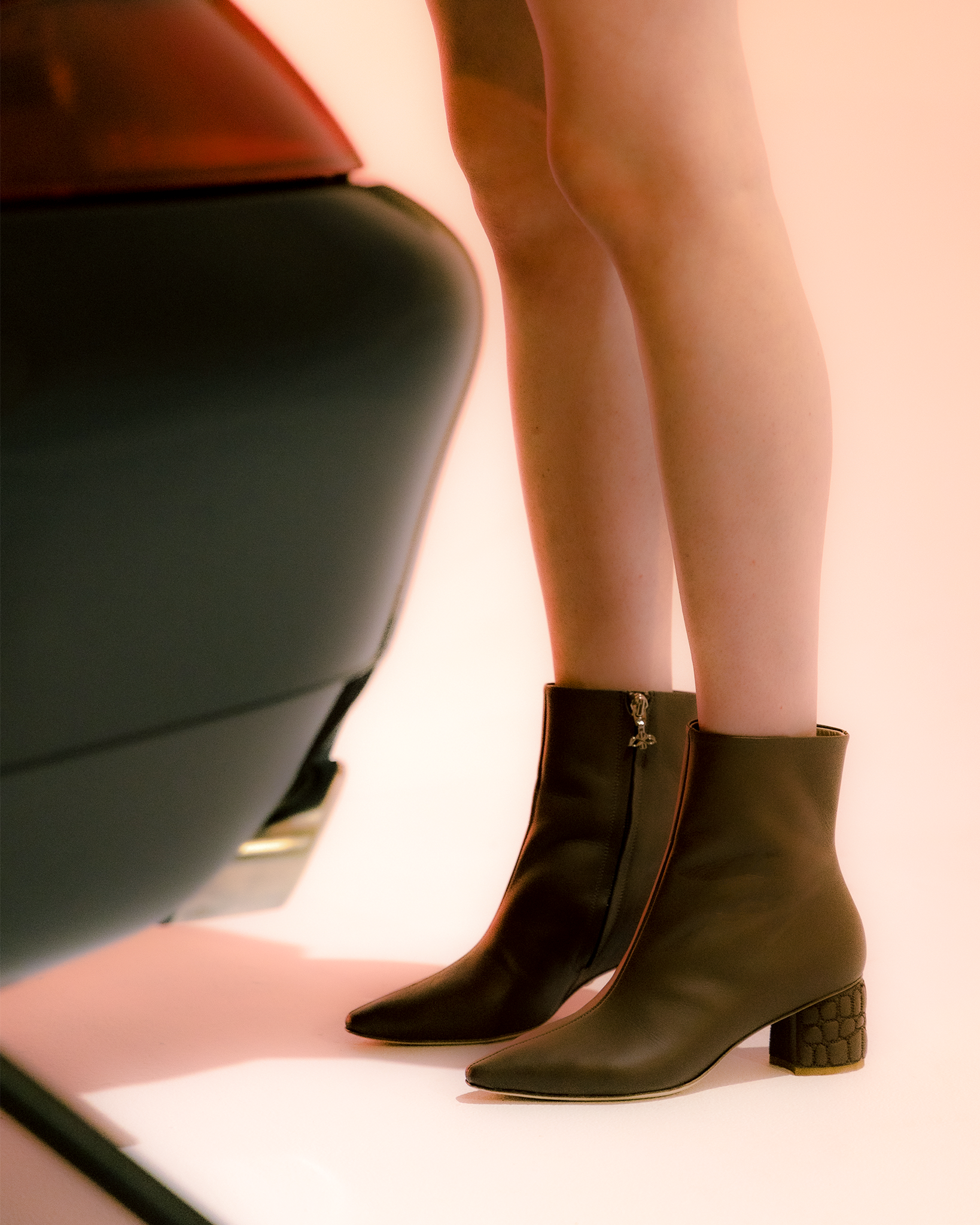 ATANA’s Croc Heel ankle boot is made of luxe Italian leather and features a contemporary raised croc-like embroidery round the heel. The column heel brings stability and comfort. They are truly versatile and easy to style.