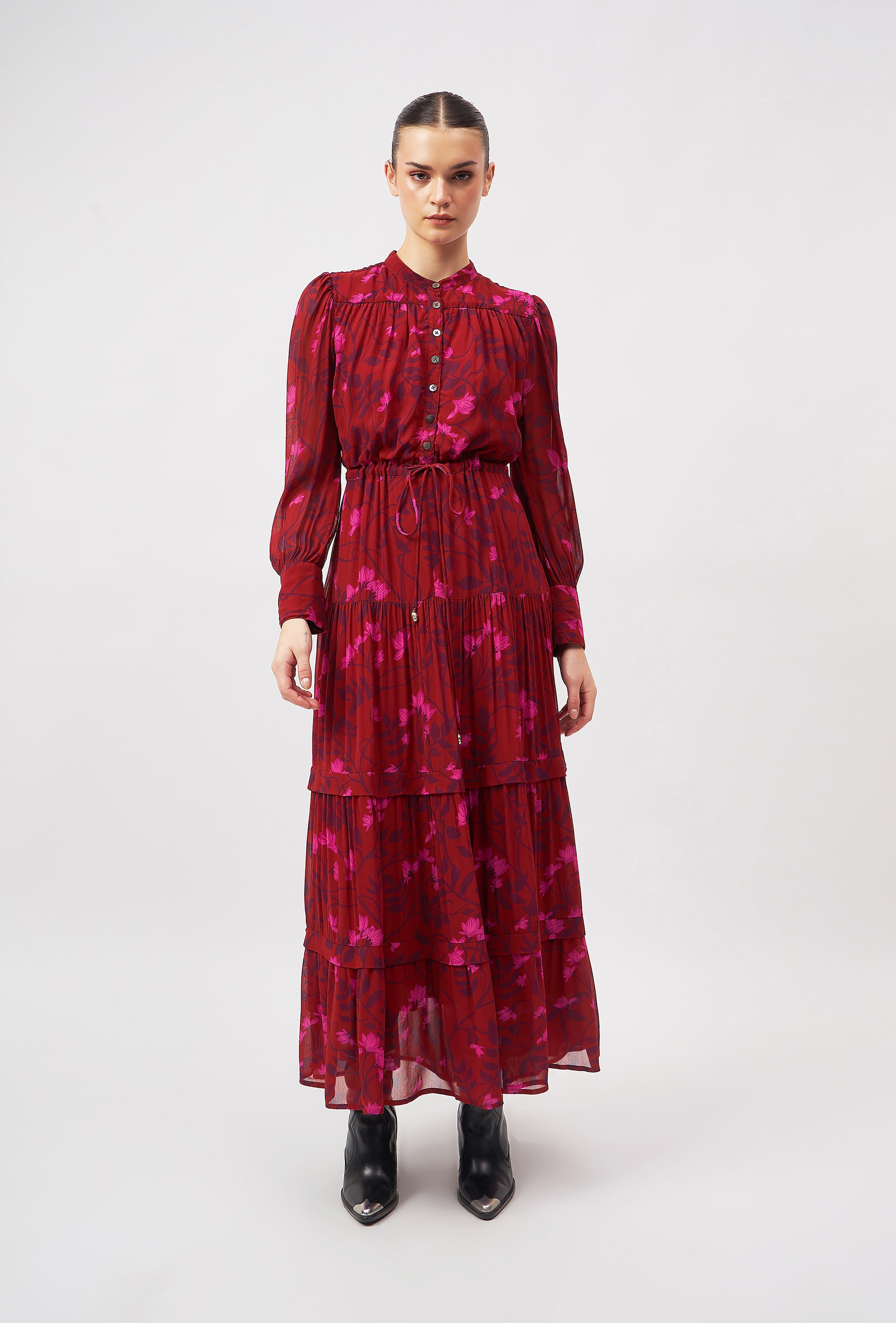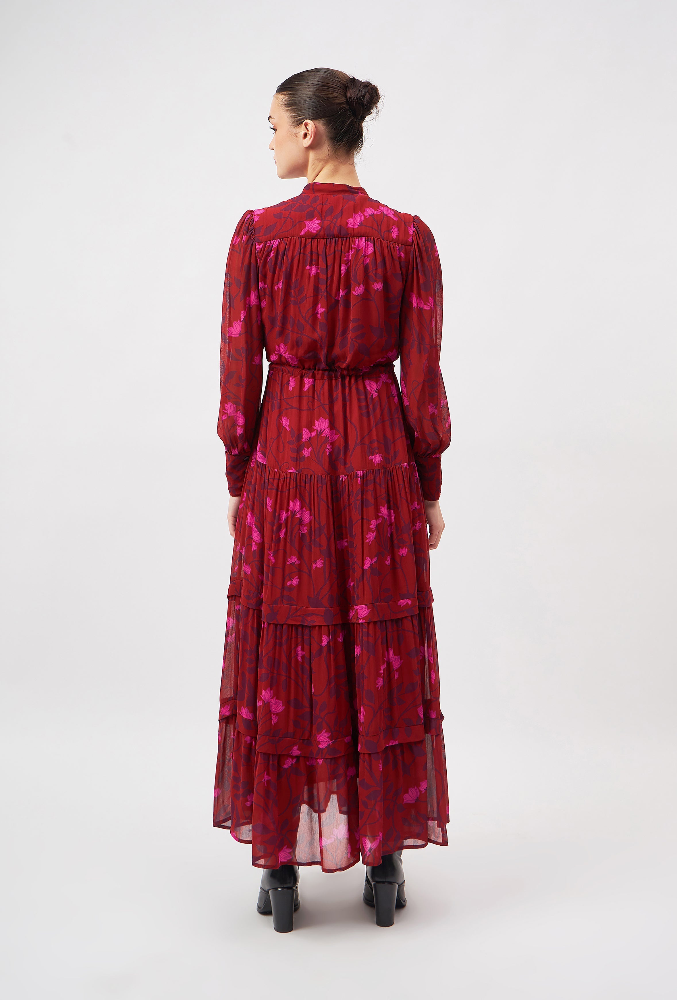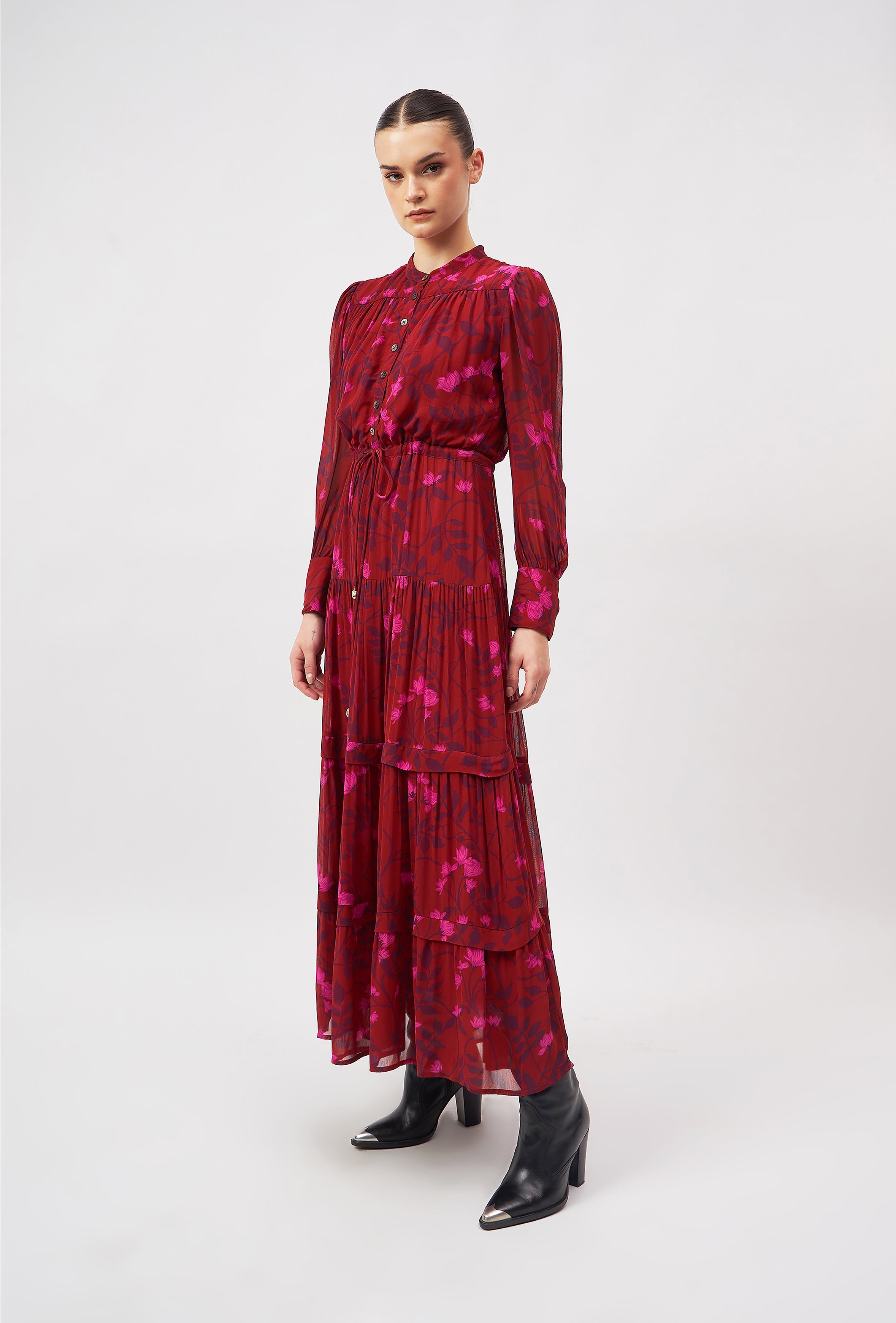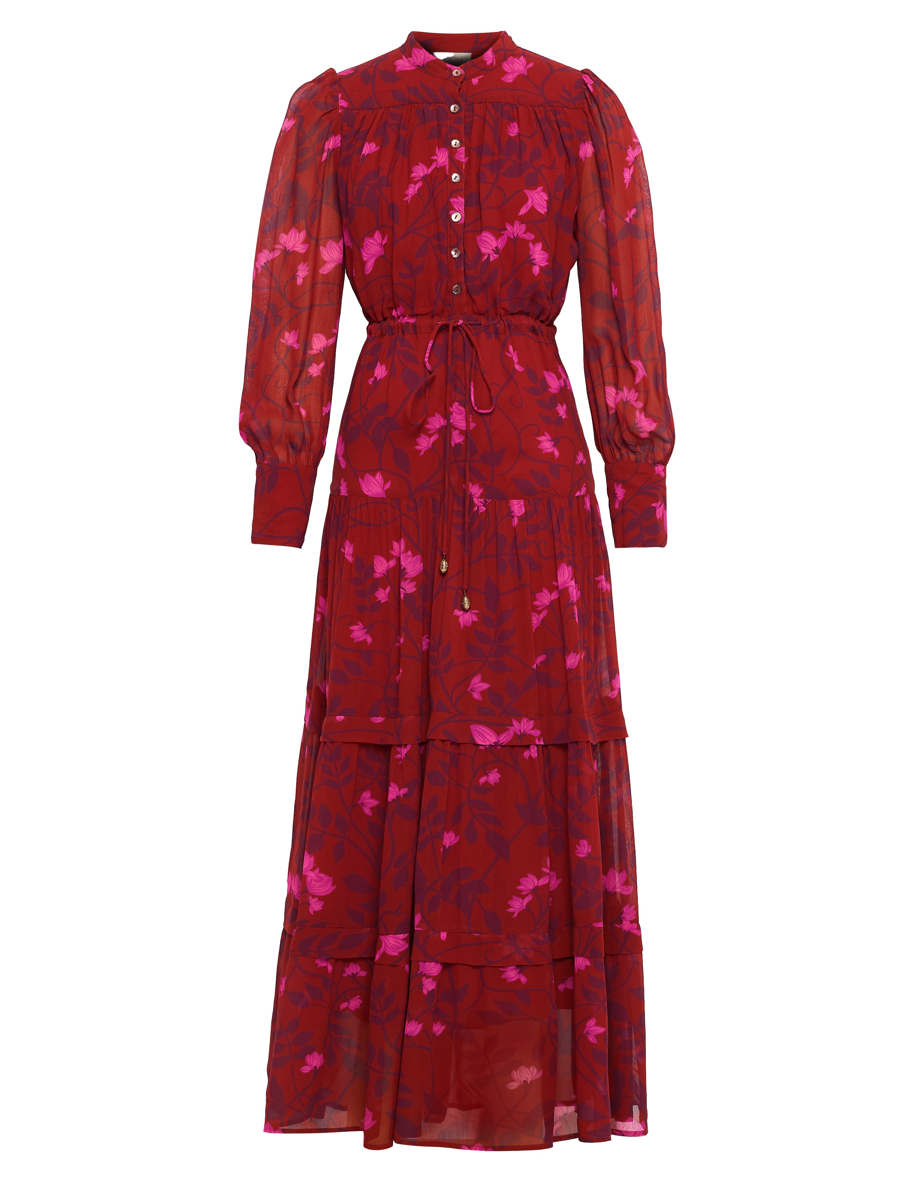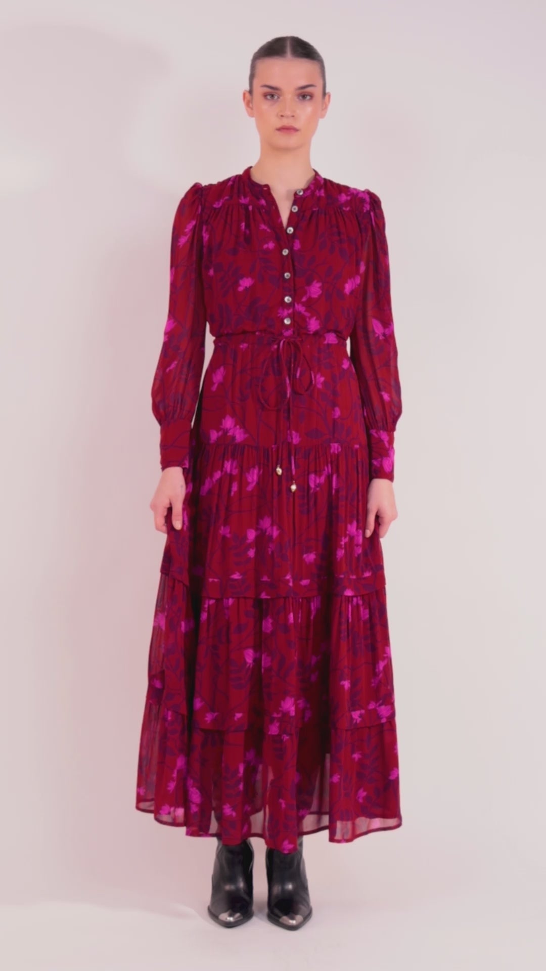 The structured sleeves, together with a romantic tiered A-line make the Sissi dress an instant icon. The self-tie cinch waist guarantees an impeccable fit. The collar ties feature custom brass embellishments with Moroccan engravings. The artwork references Jardin Majorelle, an iconic botanical garden in Marrakesh designed by a French painter. The print captures the vibrant hues of this Moroccan oasis.
