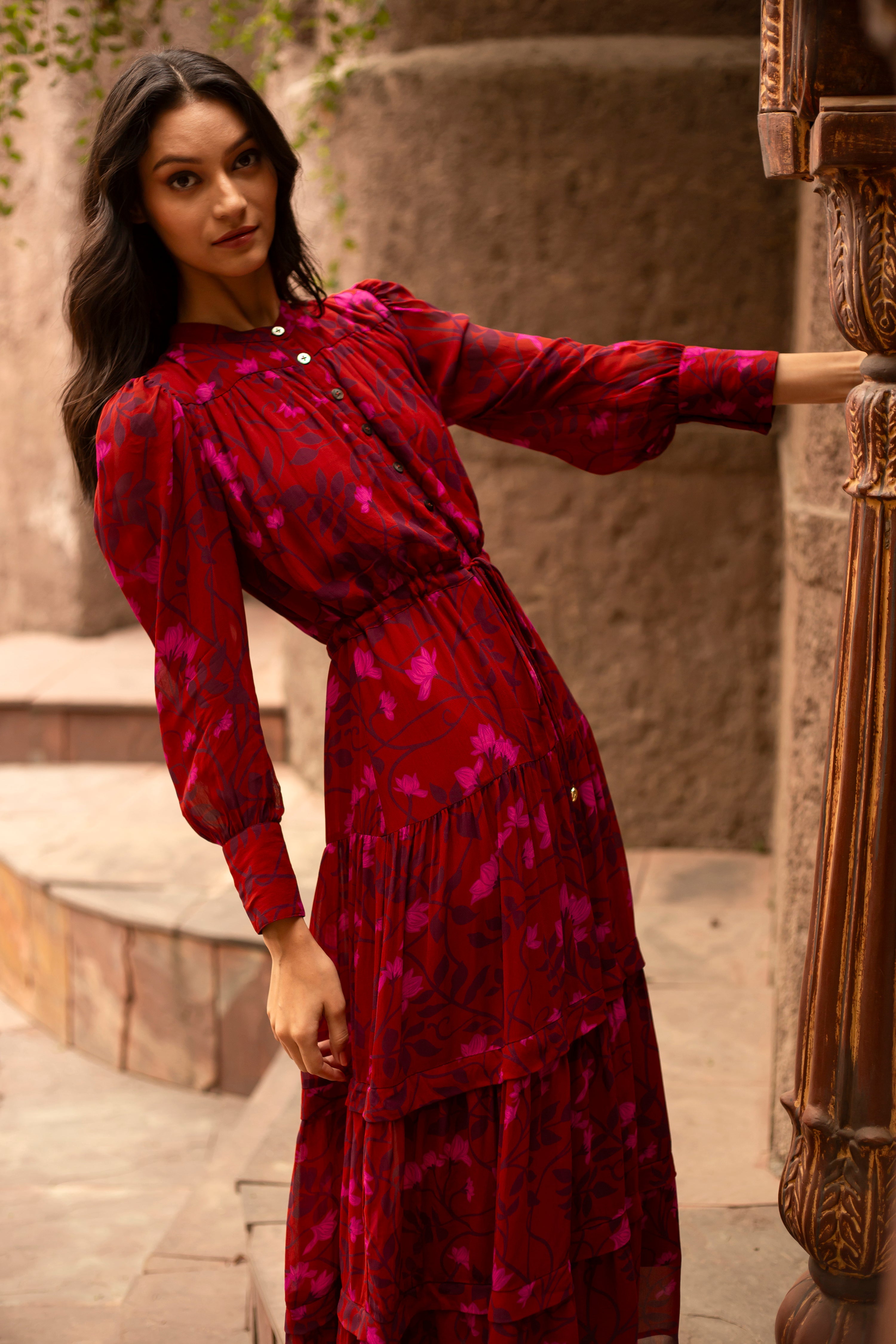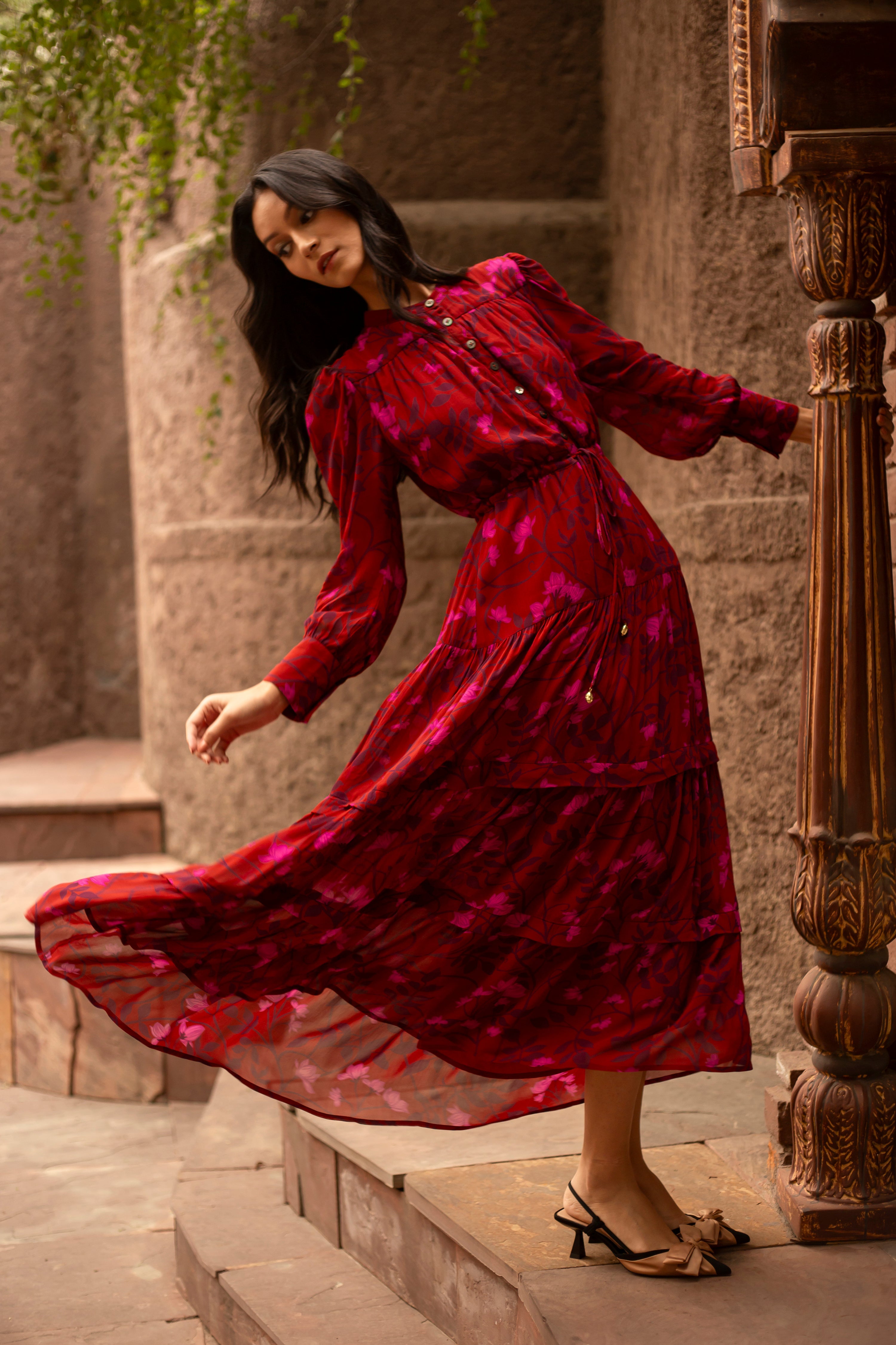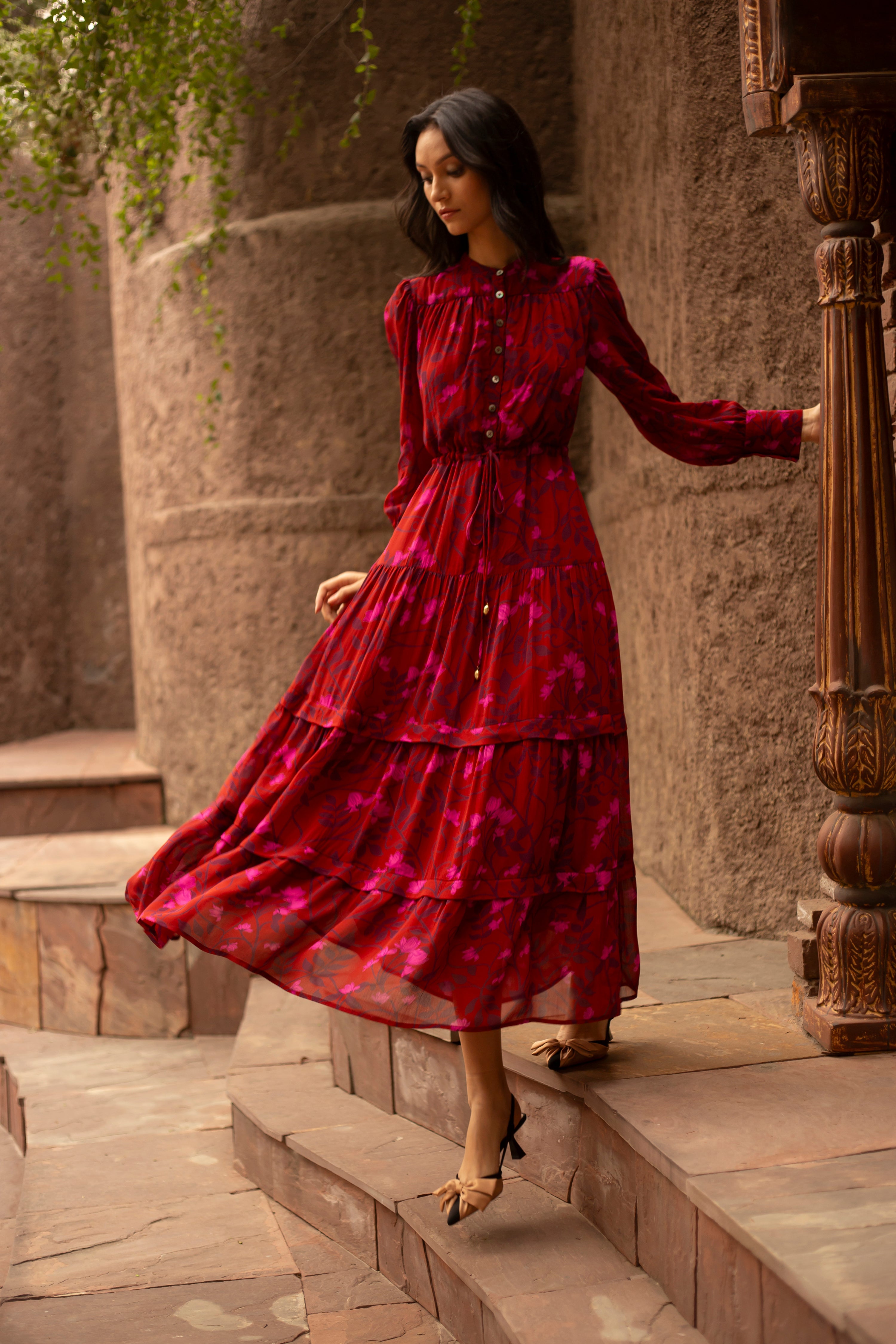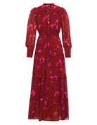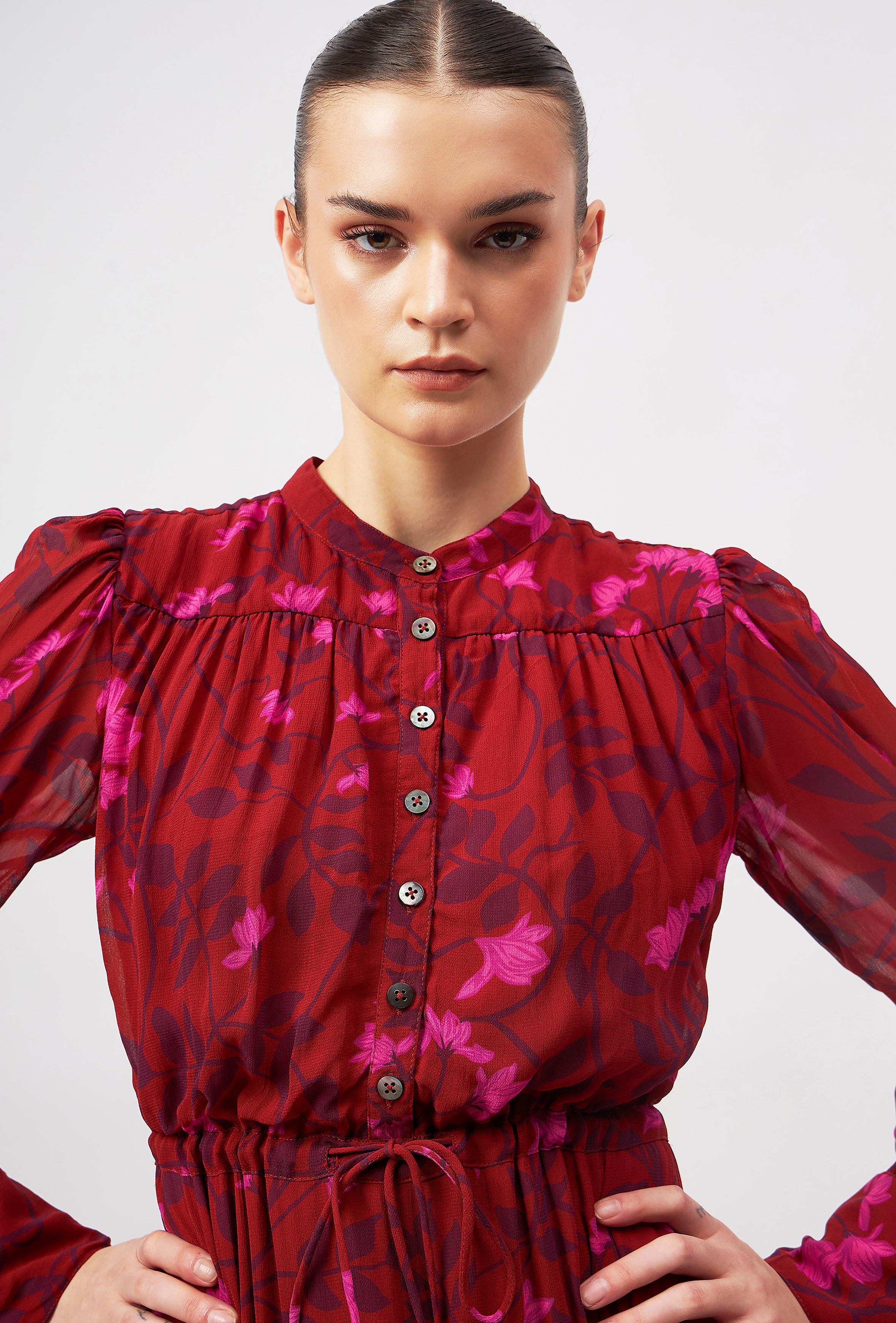 The structured sleeves, together with a romantic tiered A-line make the Sissi dress an instant icon. The self-tie cinch waist guarantees an impeccable fit. The collar ties feature custom brass embellishments with Moroccan engravings. The artwork references Jardin Majorelle, an iconic botanical garden in Marrakesh designed by a French painter. The print captures the vibrant hues of this Moroccan oasis.