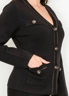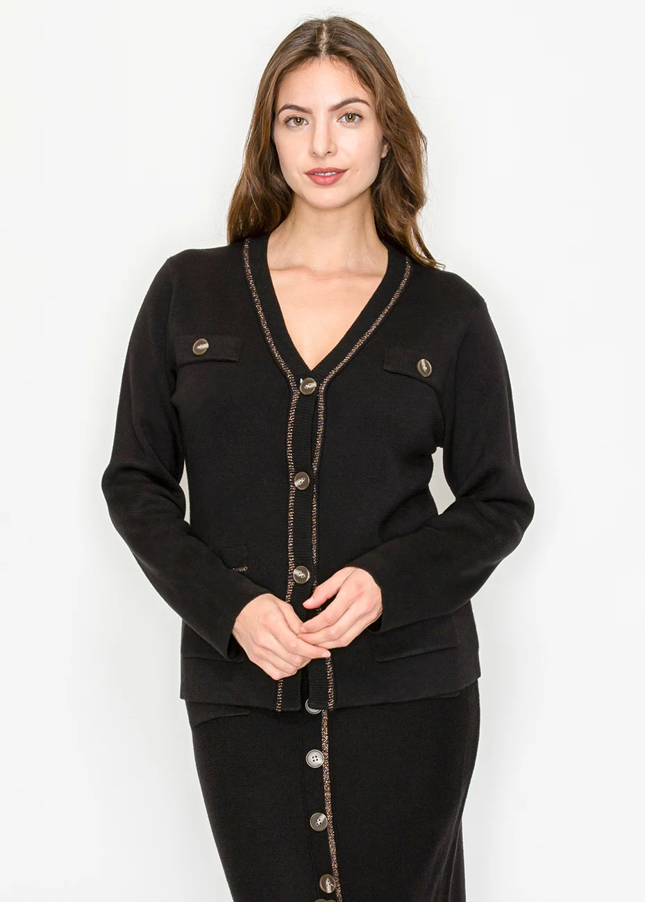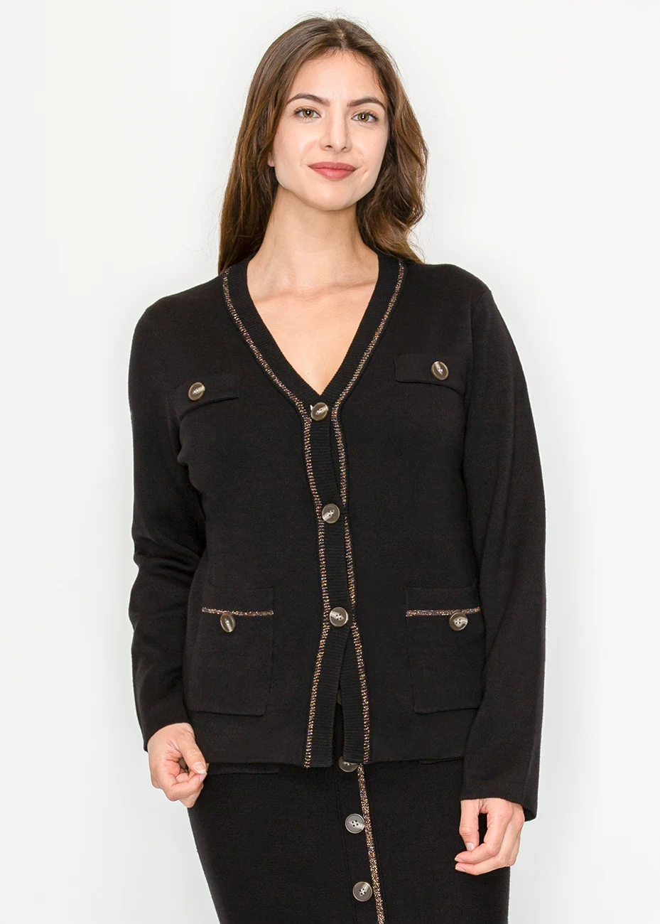 A modern cardigan with metallic edging, bold buttons, and functional pocket details. Chic enough for work, cozy enough for weekends.
