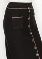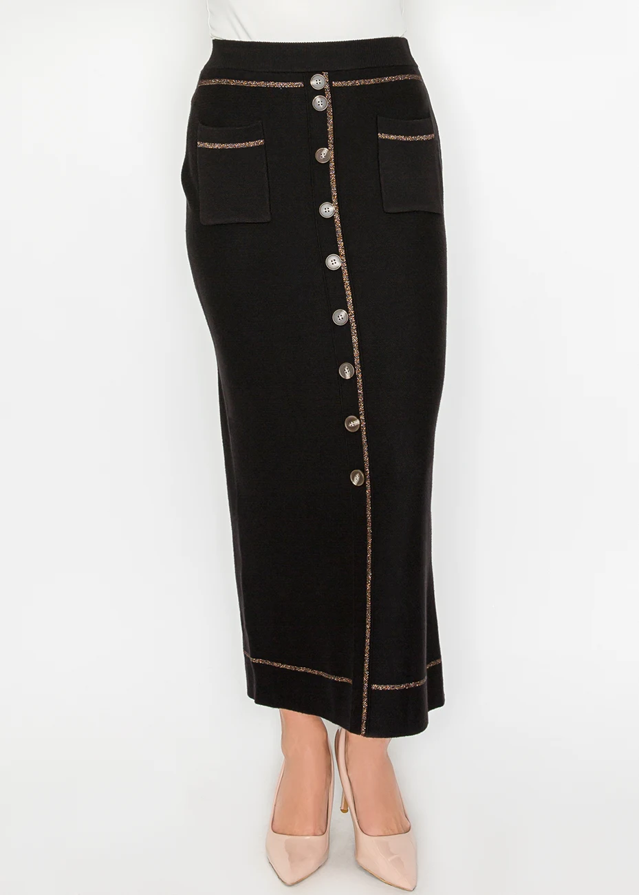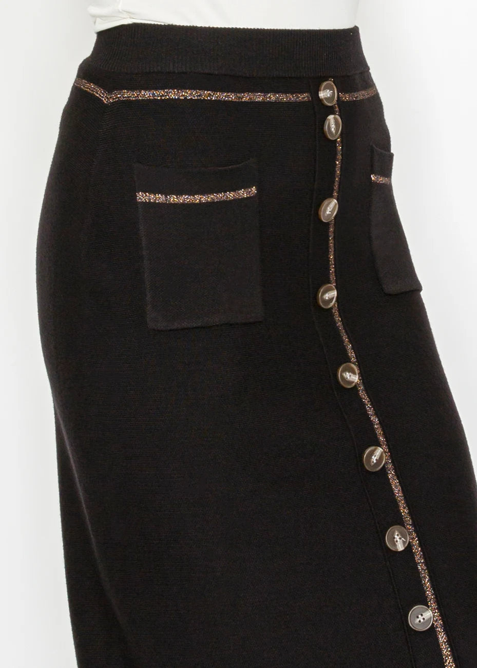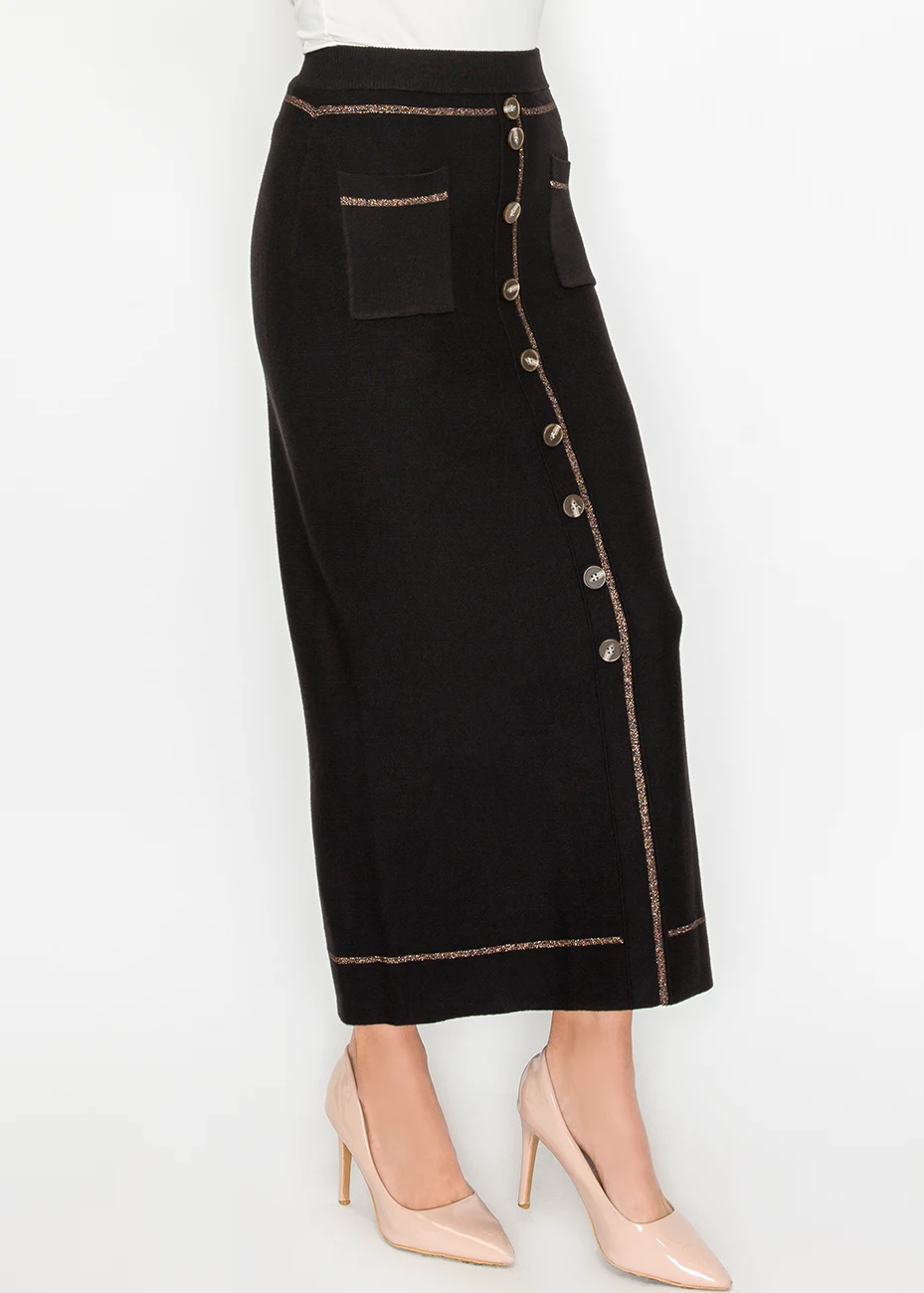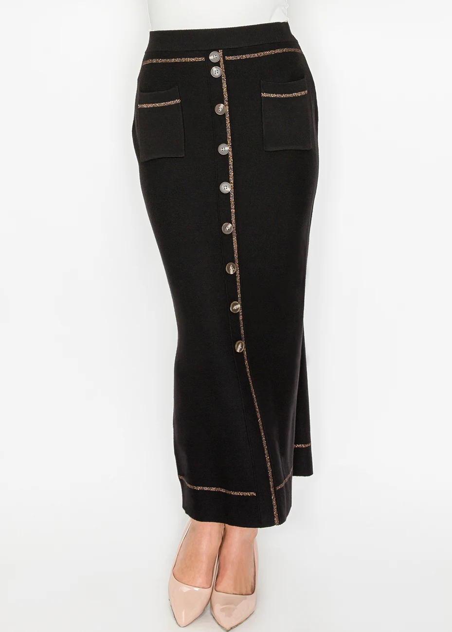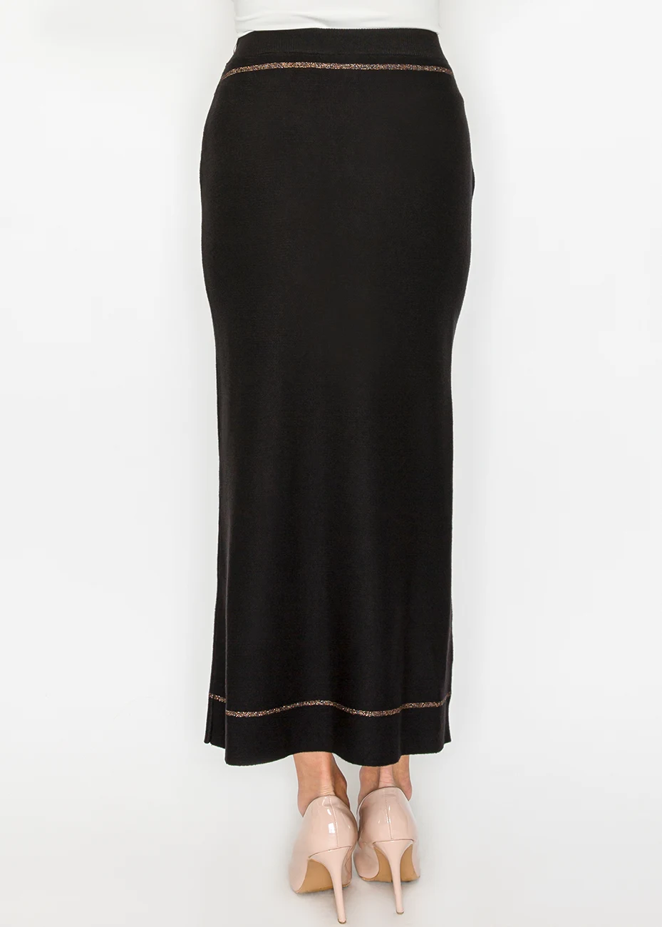 A sophisticated black knit skirt with a maxi length cut and metallic thread detailing. The refined design makes it easy to dress up while staying comfortable.
