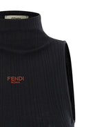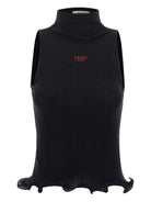 This sleek black polyester top from Fendi features a sophisticated turtleneck design with a fitted silhouette that flatters the figure. The ribbed knit construction adds texture and visual interest, while the distinctive ruffle hem detail creates a feminine touch.