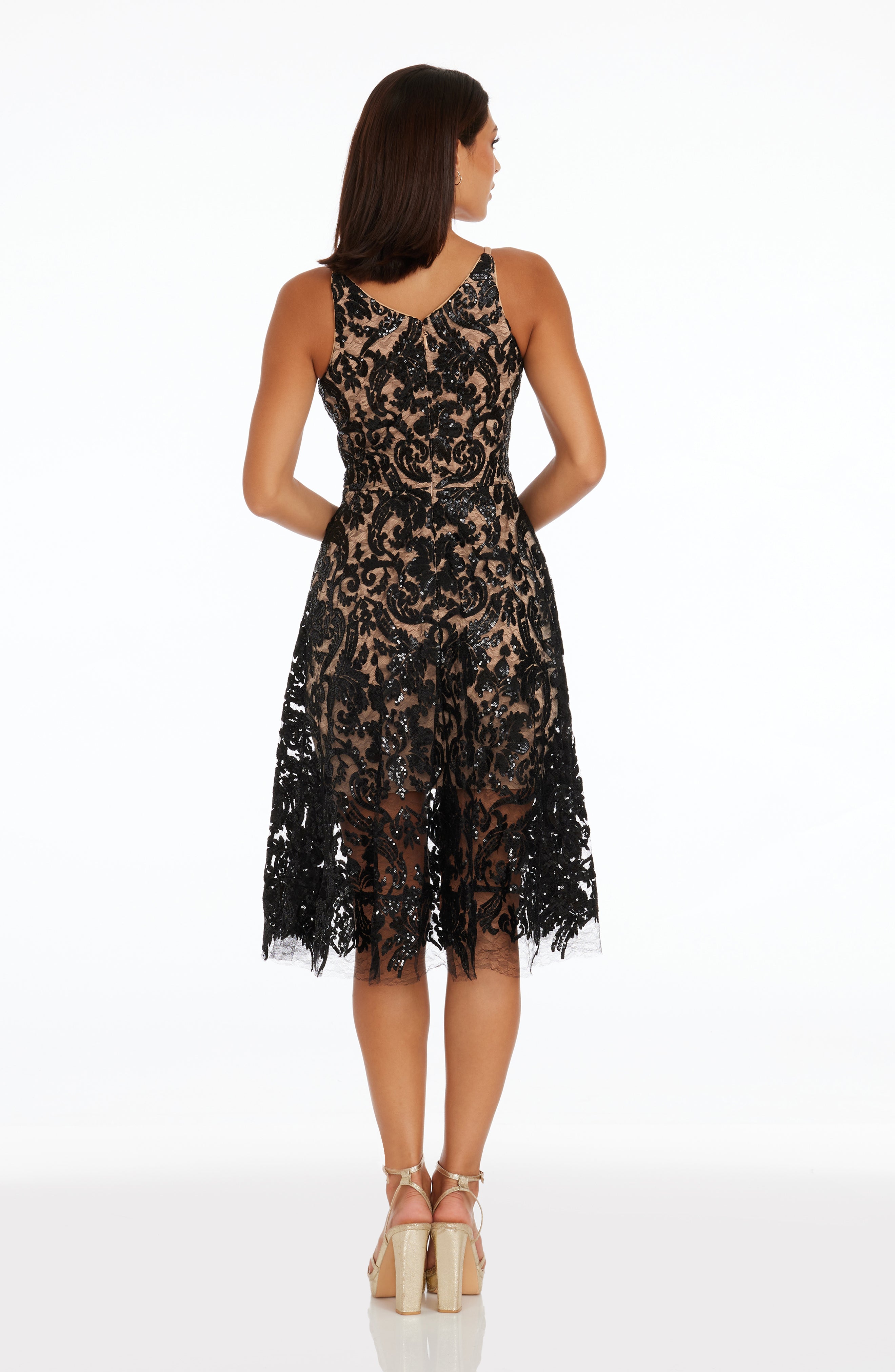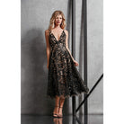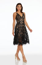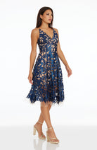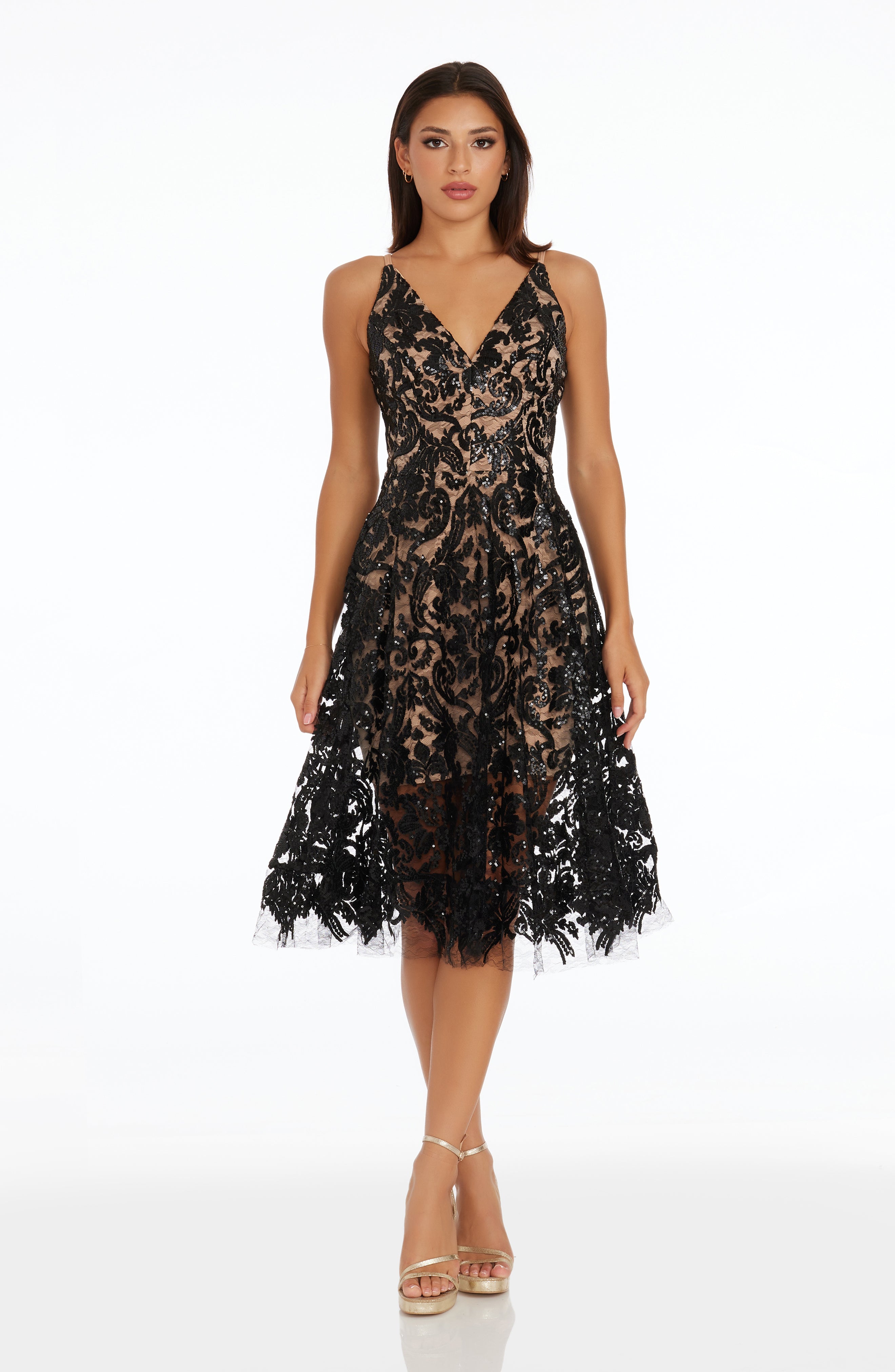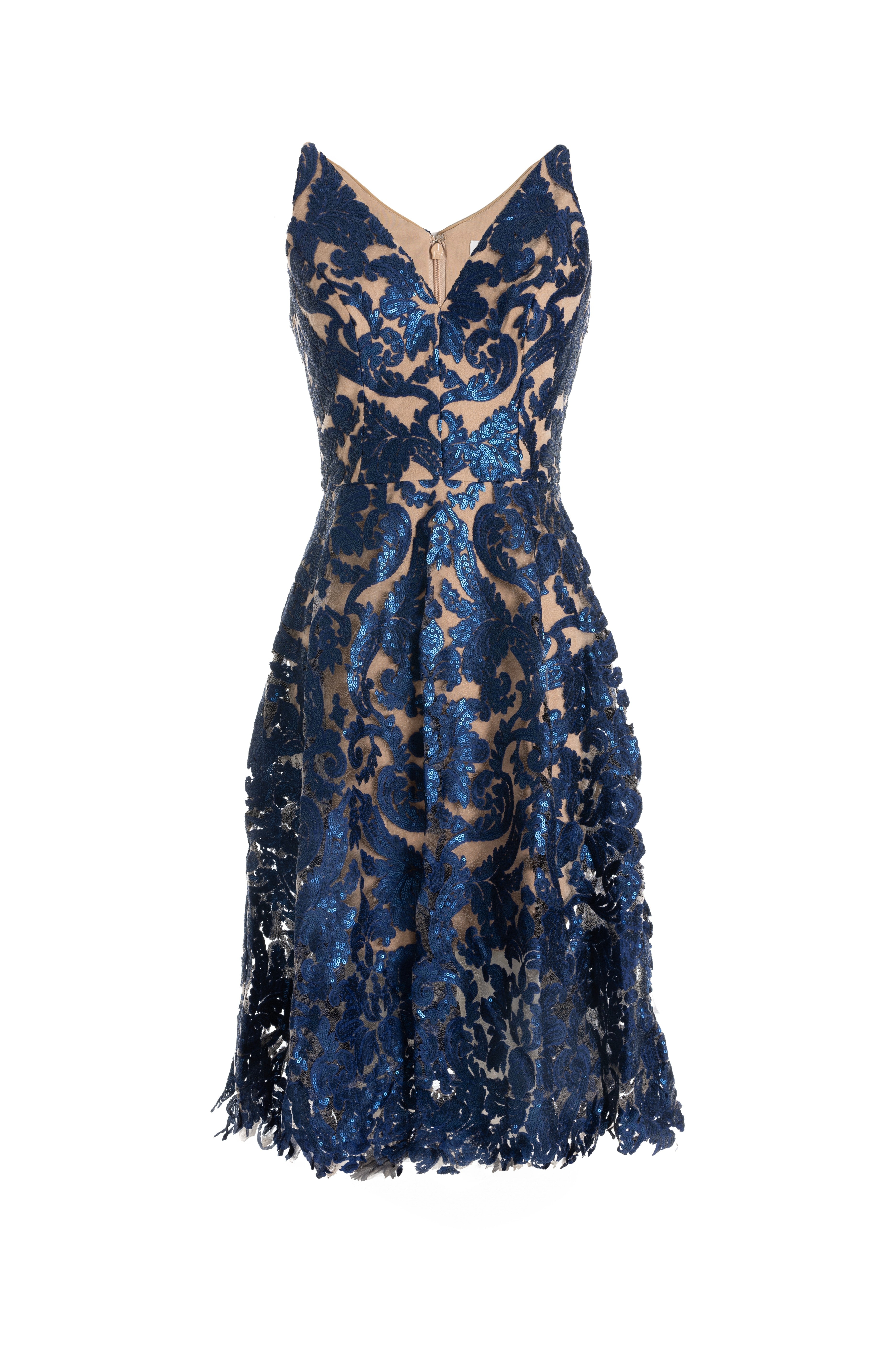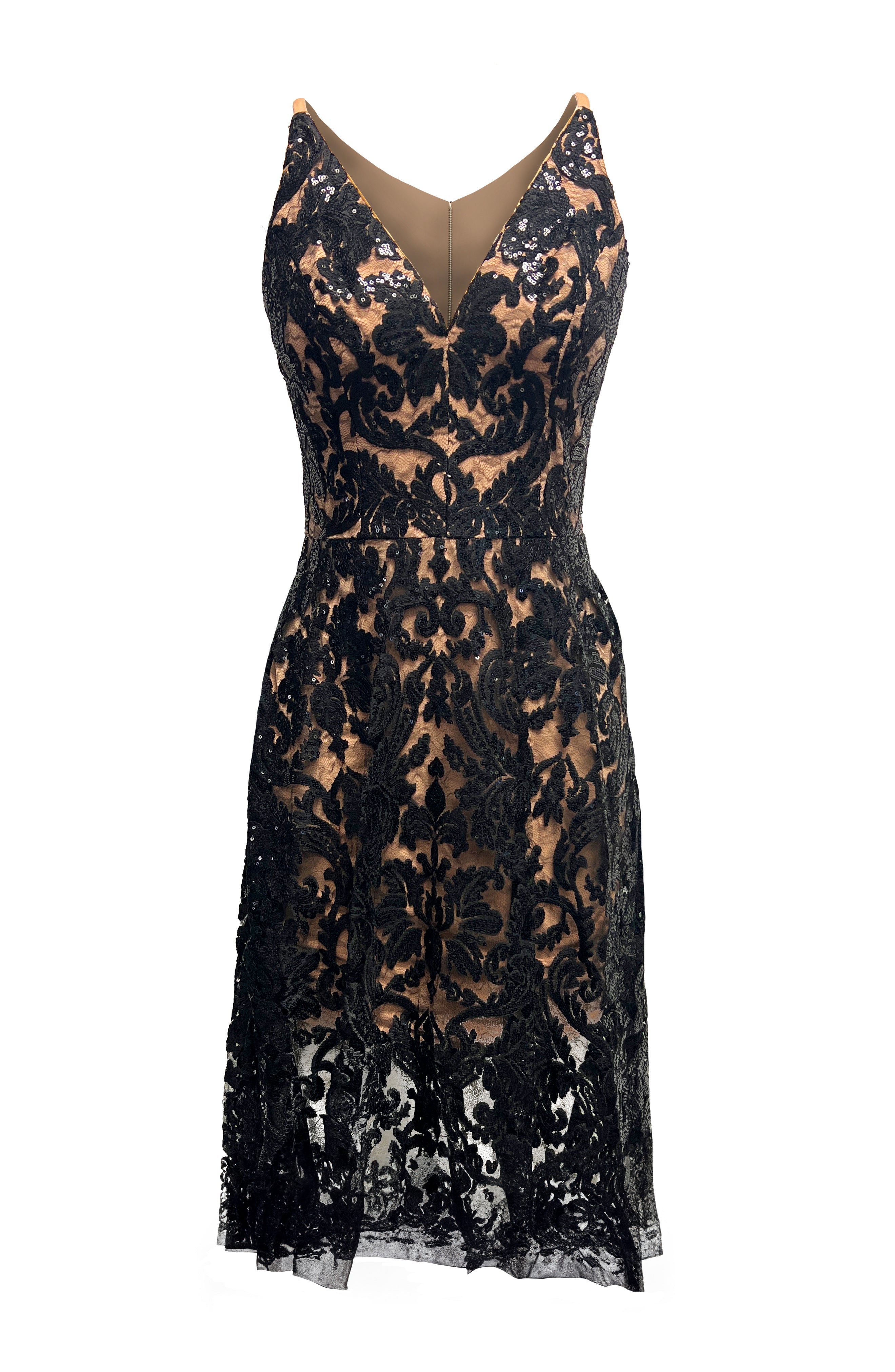 This floral lace overlay dress is chic and feminine. Blair has embroidered mesh lace detailing over a base with tiny sequins to add a subtle glimmer. This dress has a flattering classic silhouette, with a plunging neckline, delicate straps, and a curved v-back. This sleeveless dress is sophisticated with a flirty edge.