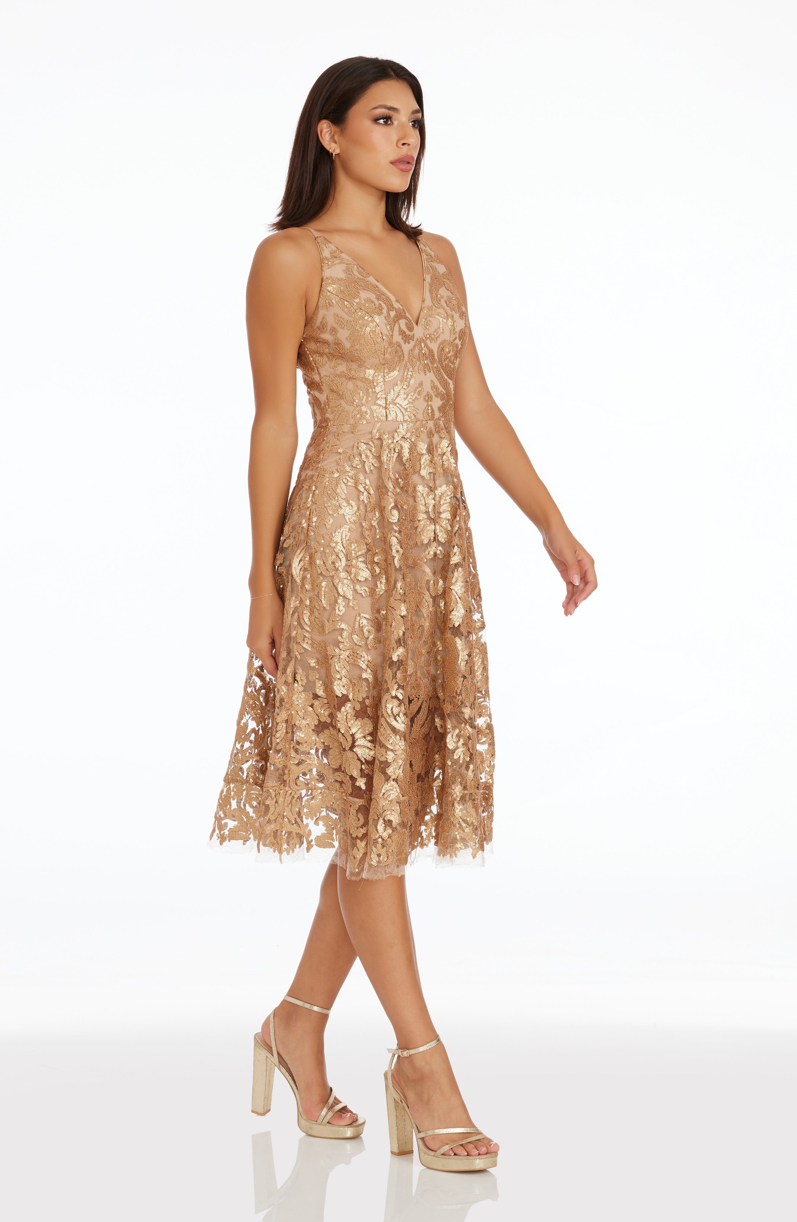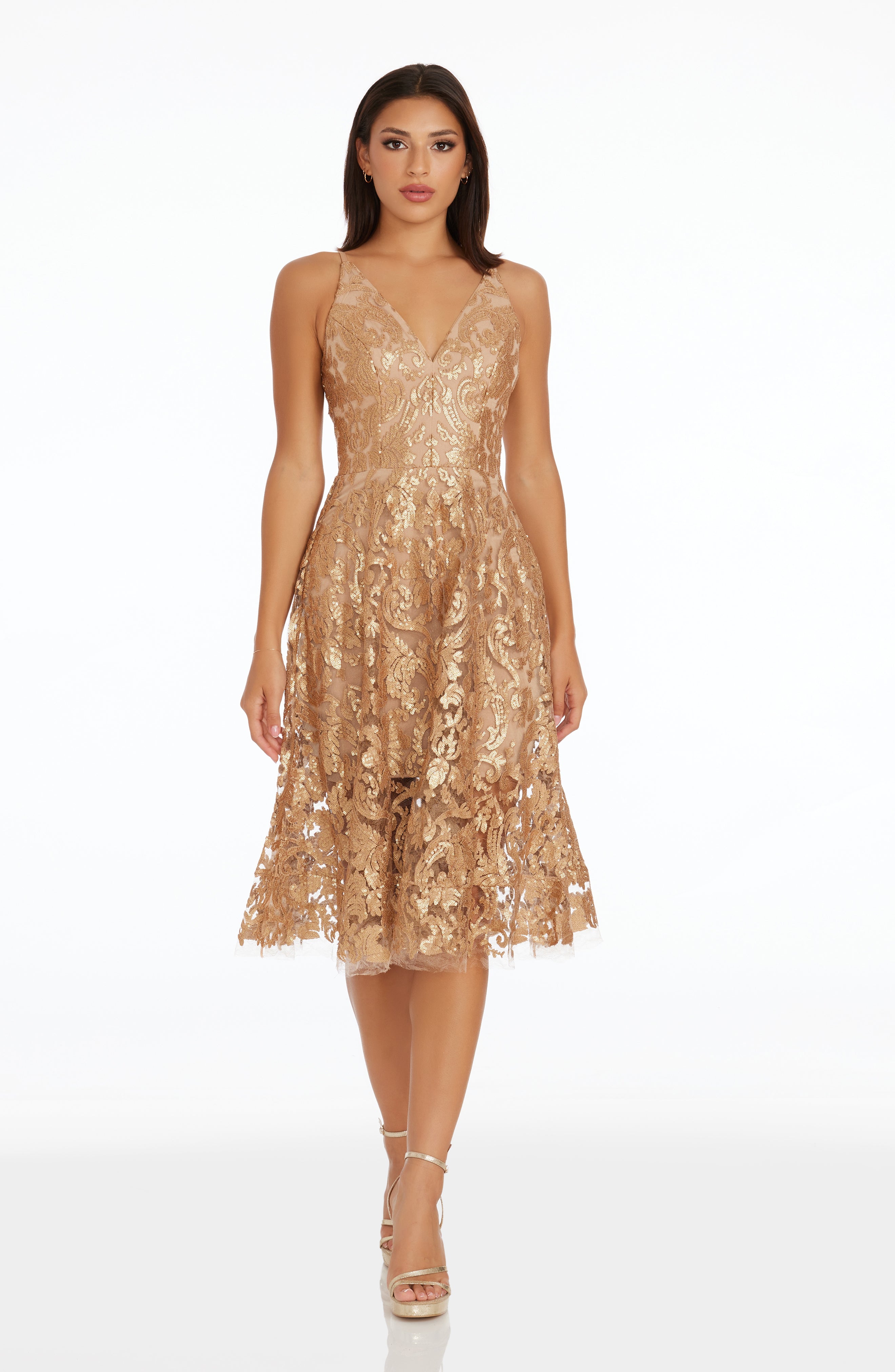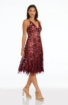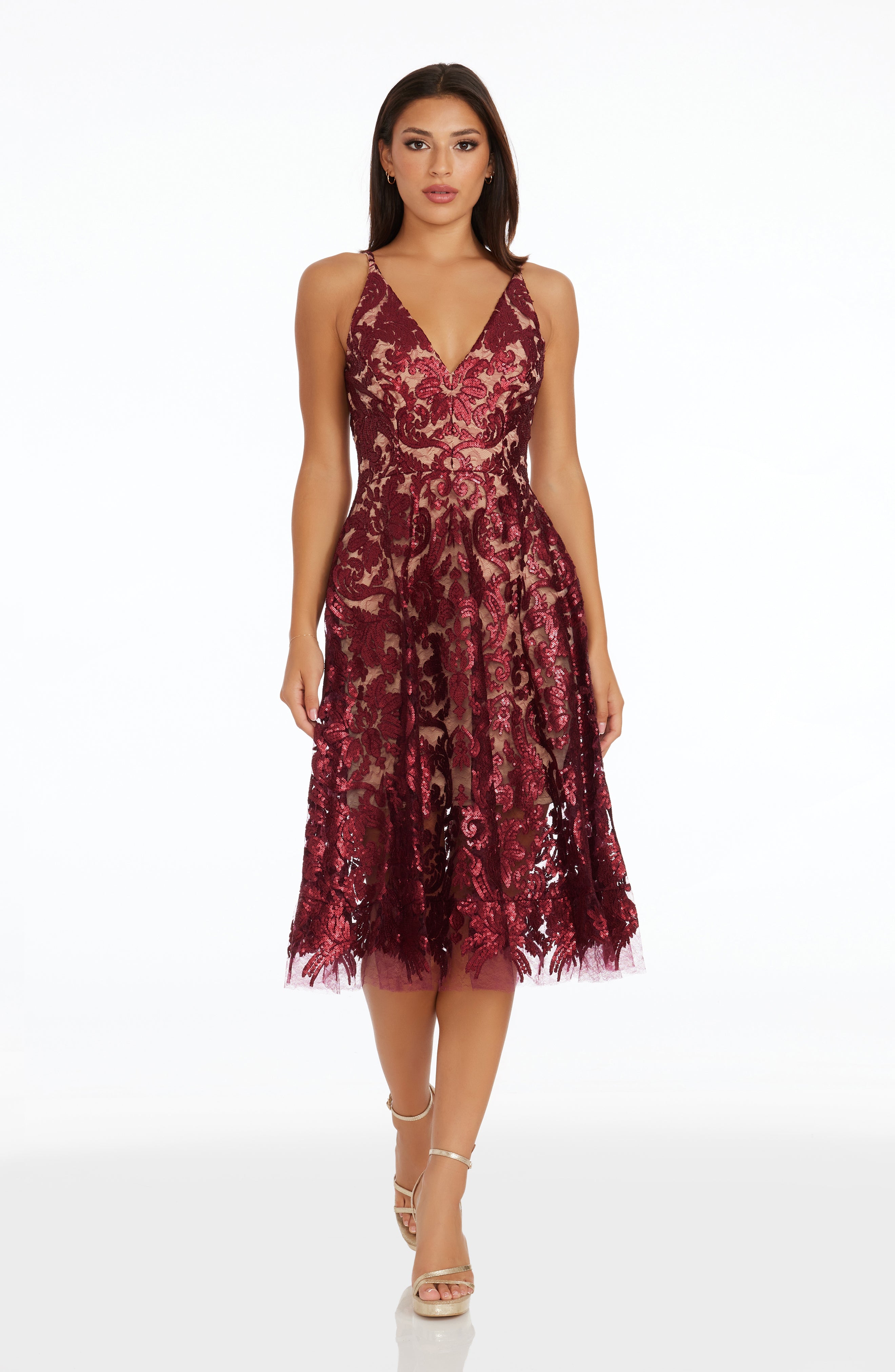 This floral lace overlay dress is chic and feminine. Blair has embroidered mesh lace detailing over a base with tiny sequins to add a subtle glimmer. This dress has a flattering classic silhouette, with a plunging neckline, delicate straps, and a curved v-back. This sleeveless dress is sophisticated with a flirty edge.