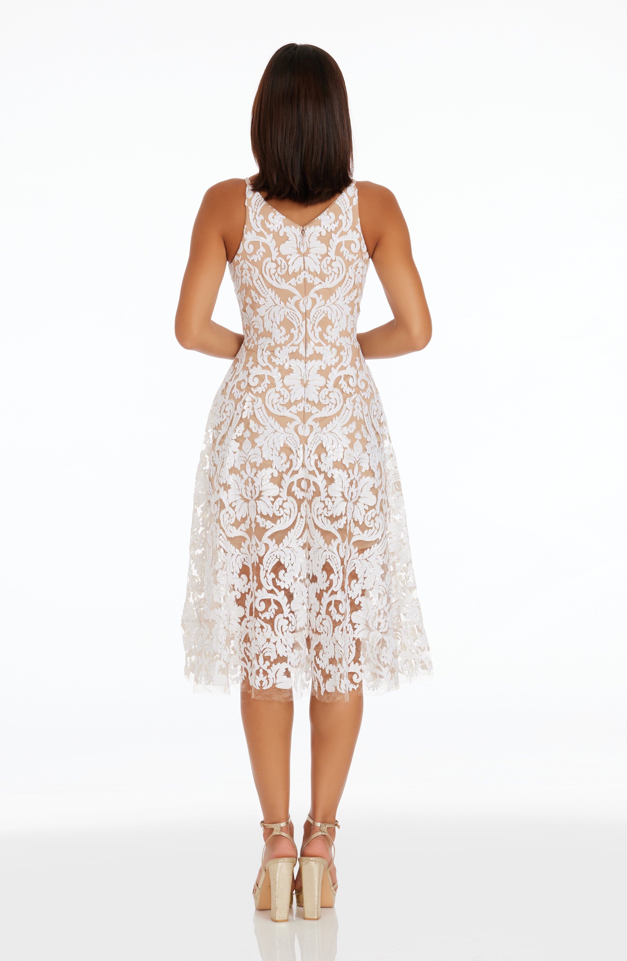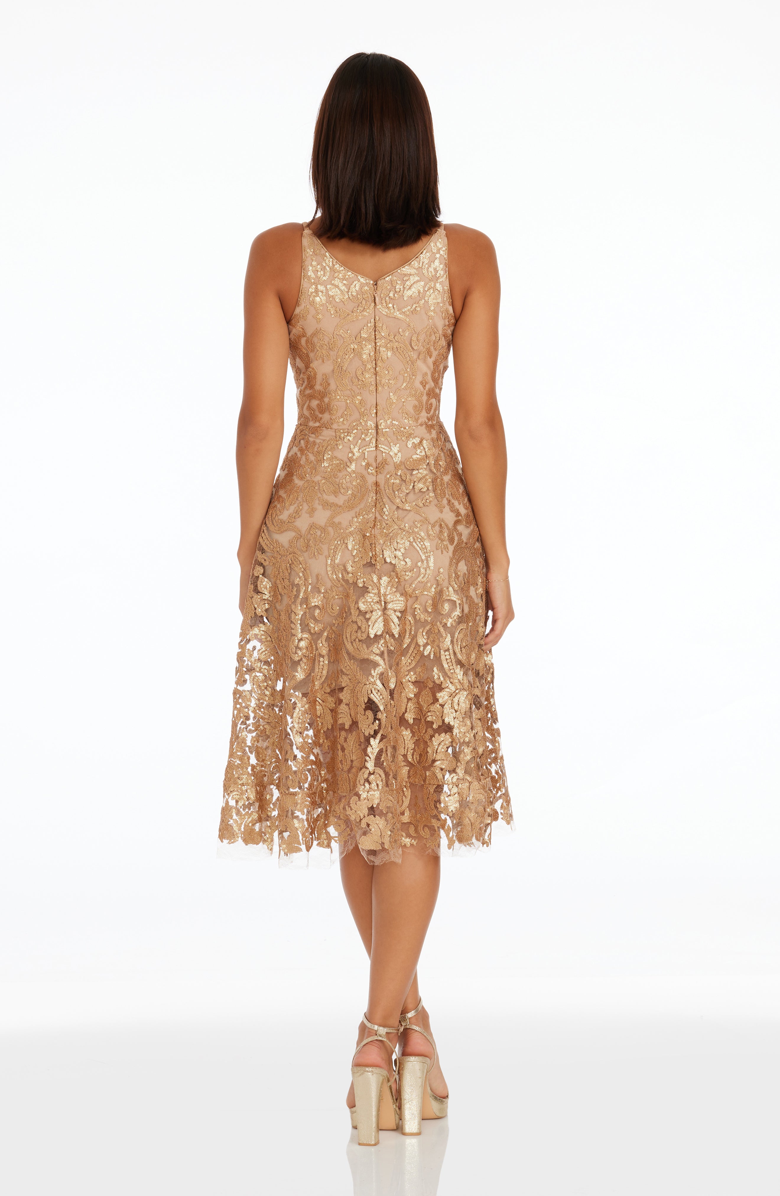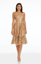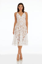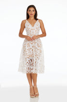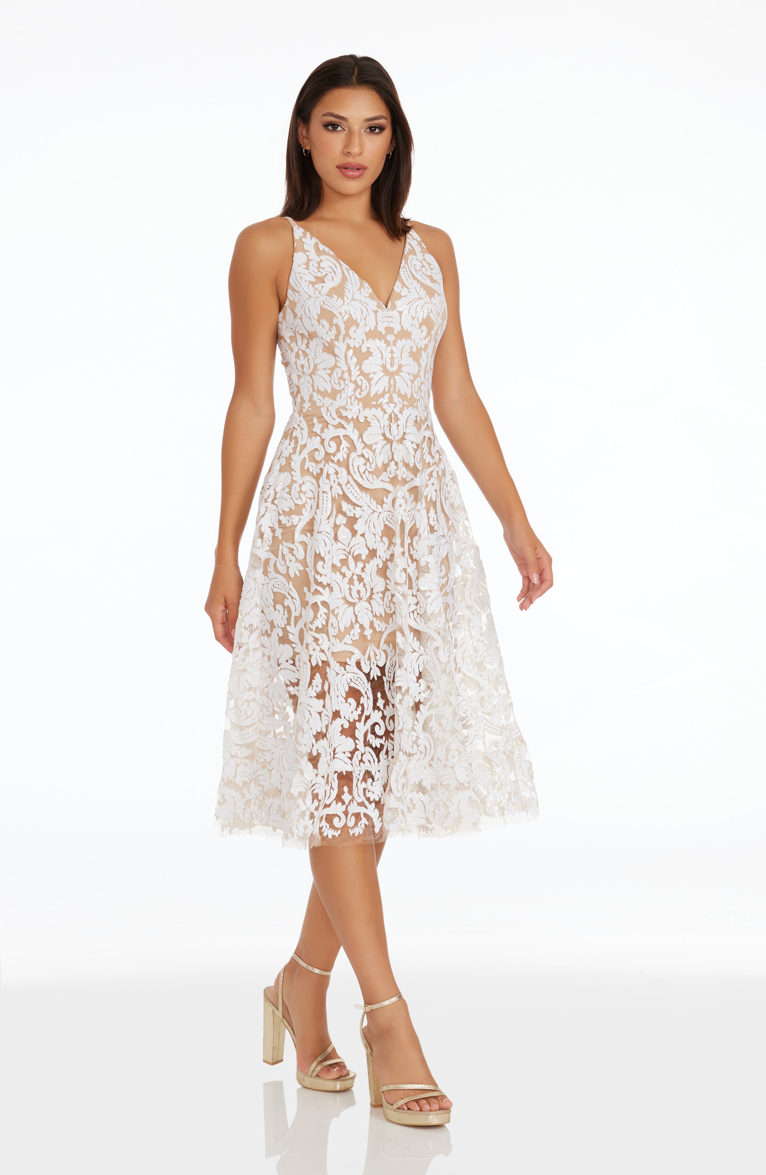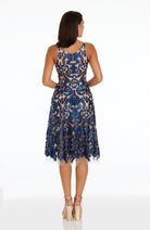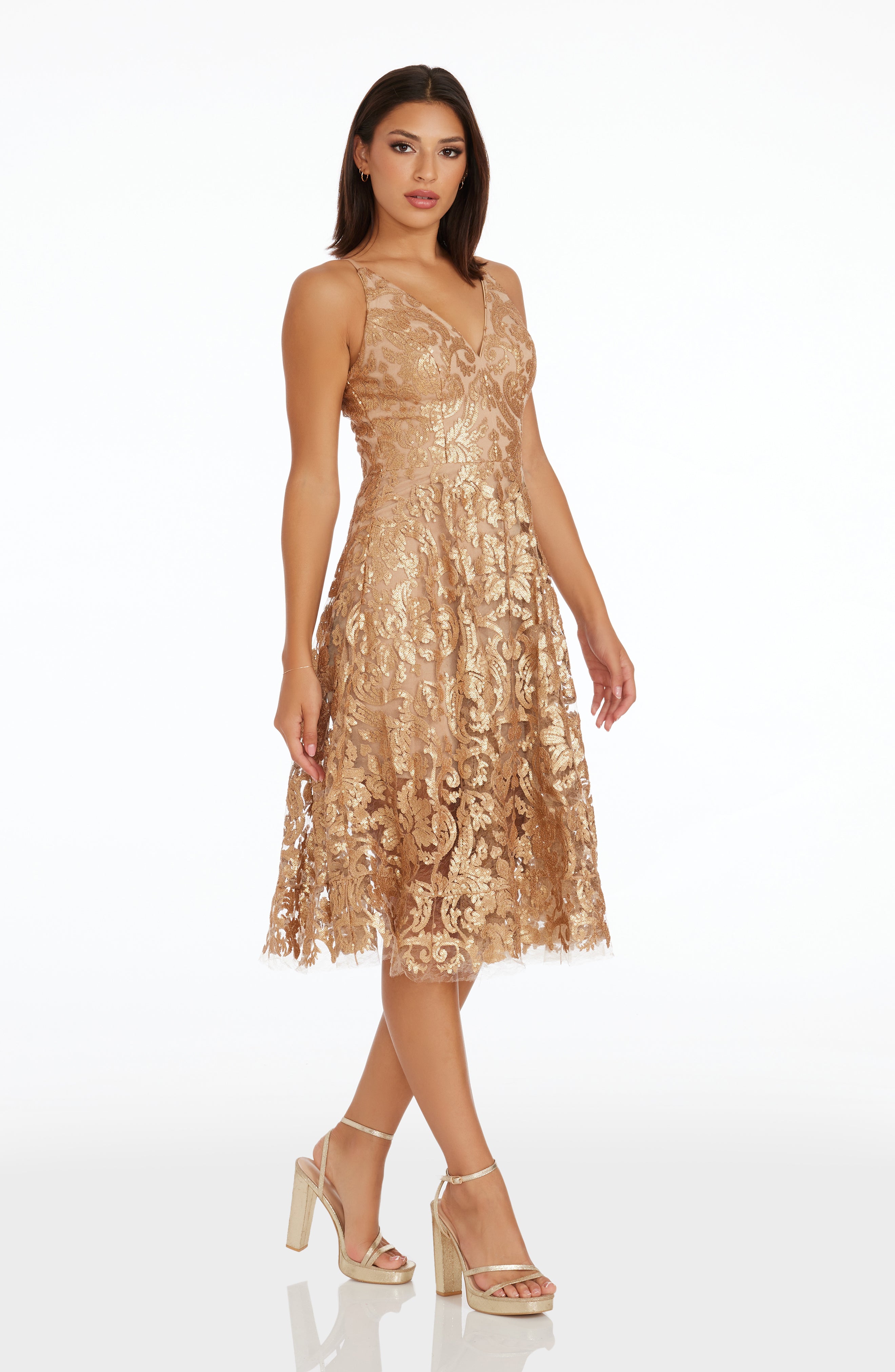 This floral lace overlay dress is chic and feminine. Blair has embroidered mesh lace detailing over a base with tiny sequins to add a subtle glimmer. This dress has a flattering classic silhouette, with a plunging neckline, delicate straps, and a curved v-back. This sleeveless dress is sophisticated with a flirty edge.