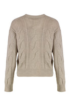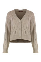 CARDIGAN CROP IN WOOL AND CASHMERE YARN WITH CABLE KNIT IN BEIGE COLOR. IT FEATURES A V-NECK, A FRONT CLOSURE WITH THREE VISIBLE BUTTONS, AND LONG SLEEVES WITH DROPPED SHOULDERS. THE SIMPLE AND ELEGANT DESIGN MAKES THIS GARMENT VERSATILE, SUITABLE FOR BOTH CASUAL AND MORE SOPHISTICATED OUTFITS. PERFECT FOR THE AUTUMN AND WINTER SEASONS, IT OFFERS COMFORT WITHOUT SACRIFICING STYLE.