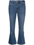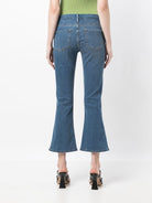 BLUE COTTON BLEND DARK WASH BELT LOOPS FRONT BUTTON AND ZIP FASTENING CLASSIC FIVE POCKETS CROPPED FLARED