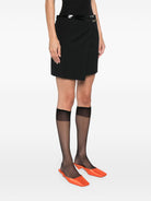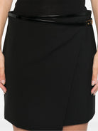 BLACK CREPE TEXTURE BELTED WAIST WRAP DESIGN DART DETAILING UNLINED ASYMMETRIC HEM THIGH-LENGTH