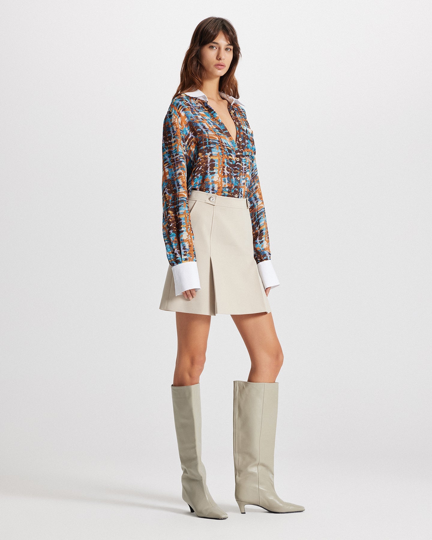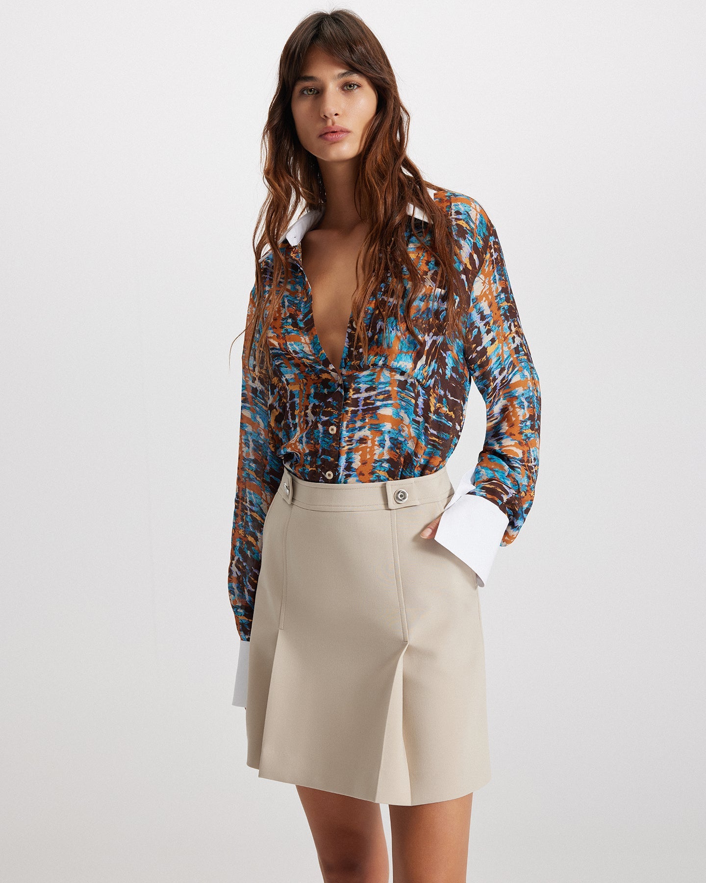 A high-waisted pleated A-line skirt with knife pleats and utilitarian detailing. Designed for work-to-weekend versatility, this tailored midi skirt flatters your frame while offering movement and structure. Features pockets and a soft stretch fabric for all-day comfort.