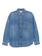 This Alexander Wang Grid-Pattern Denim Shirt features a unique patchwork grid design that adds contemporary edge to a classic silhouette.