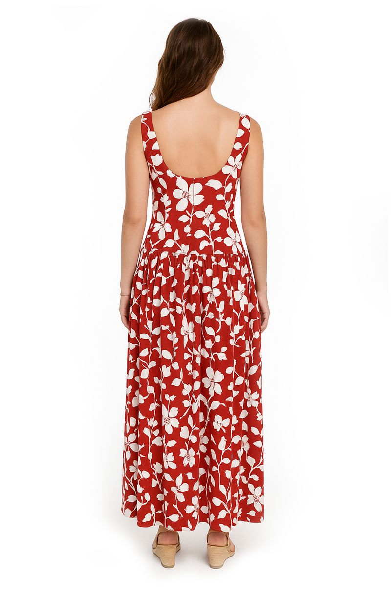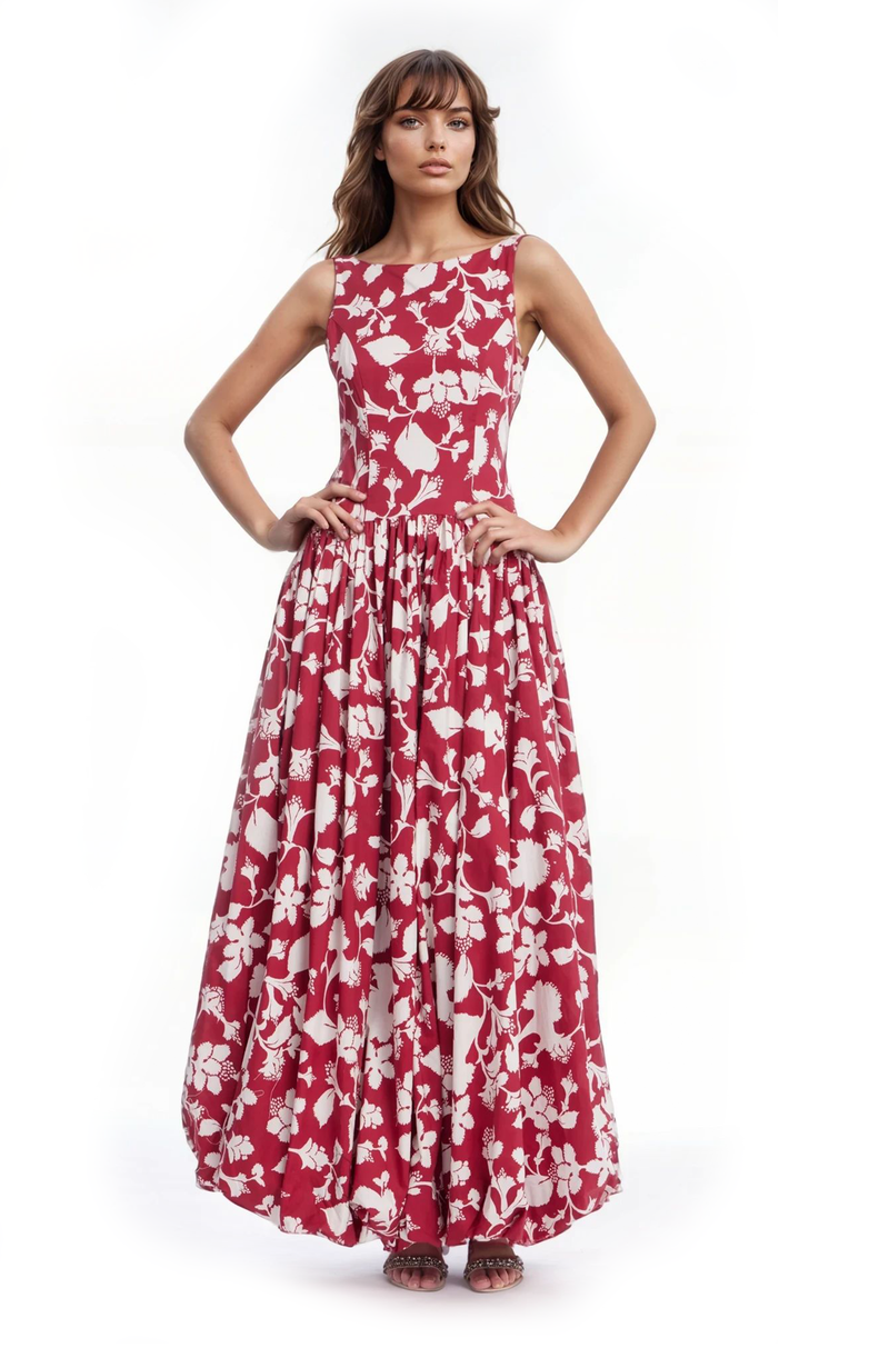 Introducing the Hayden Floral Drop Waist Maxi Dress by Jewel Badgley Mischka. This stunning red floral print day dress is perfect for any summer occasion. The sleeveless design and boat neck create a flattering silhouette, while the high neck adds a touch of sophistication. The drop waist silhouette and fitted bodice accentuate your figure, flowing into a pleated skirt with a playful bubble hem. This long, tea-length dress is crafted from comfortable cotton poplin, making it an ideal choice for warm weather. Looking for a gorgeous cocktail dress or a stylish sundress? The Hayden offers versatile styling options, from relaxed fit to slim and loose.