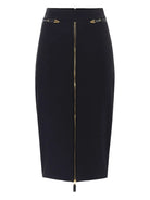 Elevate your wardrobe with this sophisticated longuette skirt from Elisabetta Franchi, crafted in luxurious lightweight crepe for all-day comfort and style. The fitted silhouette hugs your curves beautifully, while decorative zip motifs framed by tone-on-tone piping add a modern, edgy touch.