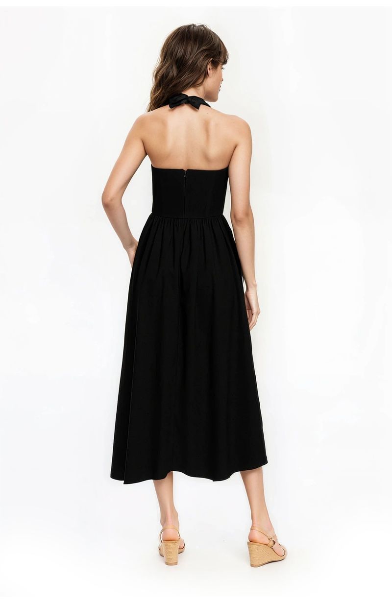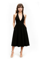 Looking for a dress that's both chic and comfortable? Meet the Justine Halter Neck Midi Dress by Jewel Badgley Mischka. This gorgeous fit & flare dress features a flattering hater neckline that flows into a deep v-neck, creating a sophisticated and stylish silhouette. The tea length is perfect for any semi-formal occasion. The a-line silhouette skims your body beautifully, while the back zip closure ensures a smooth, seamless fit. Whether you choose classic black or elegant white, this dress offers a timeless appeal. Crafted with stretch material, the Justine Halter Neck Midi Dress provides all-day comfort. You'll love the effortless style of this stunning dress. It's a classic fit with a touch of modern flair.