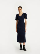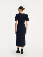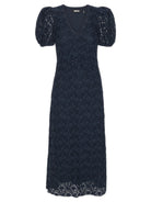 LACE DRESS WITH PUFF SLEEVES FITTED BODICE AND FLARED SKIRT V-NECK 50% NYLON, 40% COTTON, 10% SPANDEX MADE IN CHINA