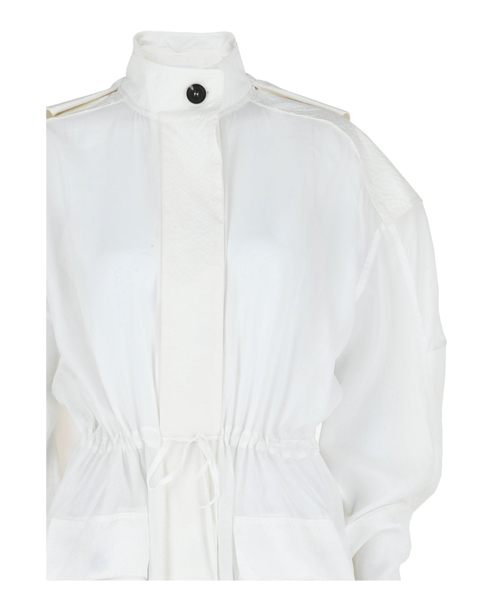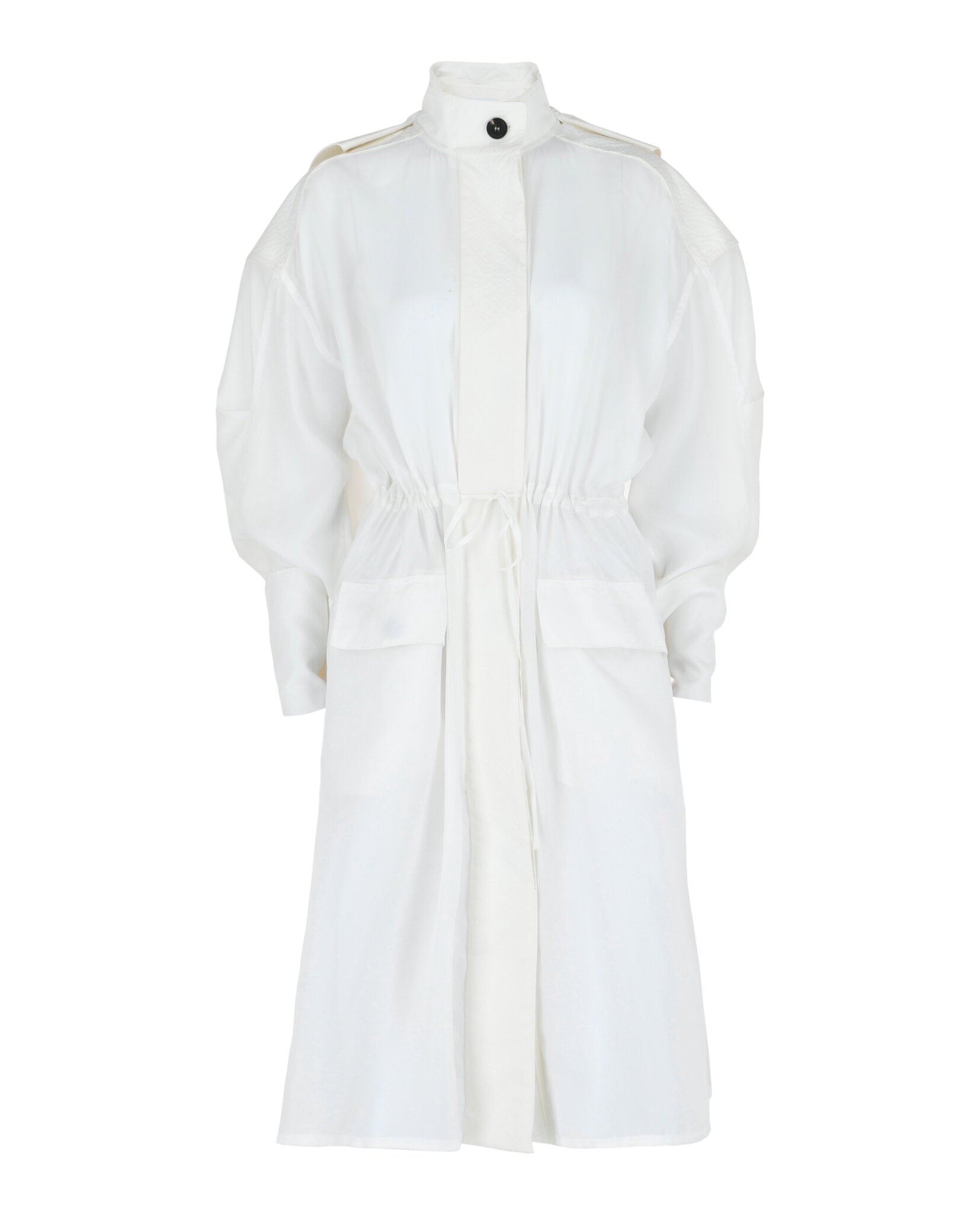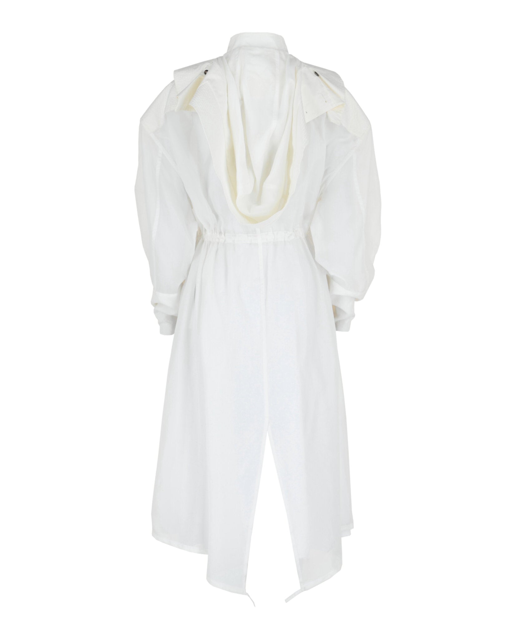 - Unlined sheer trench; Removable button hood; Two front flap pockets featuring hidden button closures