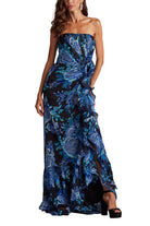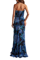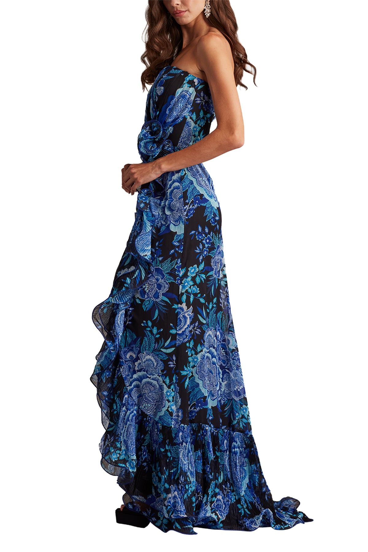 This strapless floral print chiffon gown exudes soft, flowing elegance. A striking pleated ruffle rosette cascades down one side, lending a dramatic and artistic flair. The single ruffled, tiered hemline adds a refined, stylish touch, enhancing the volume and movement of the design. Concealed back zip.