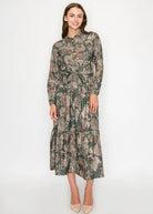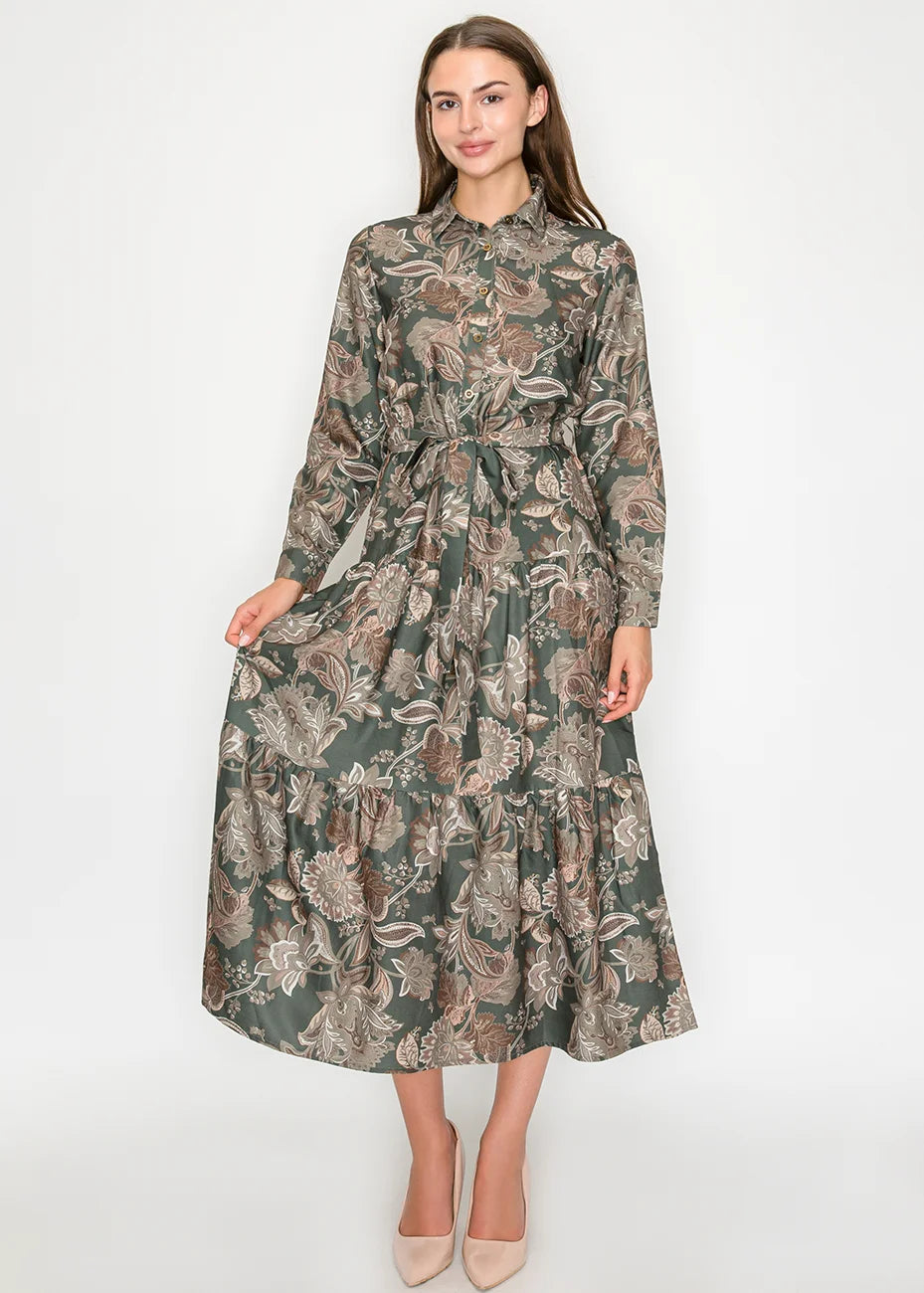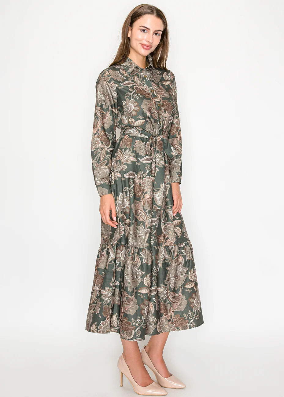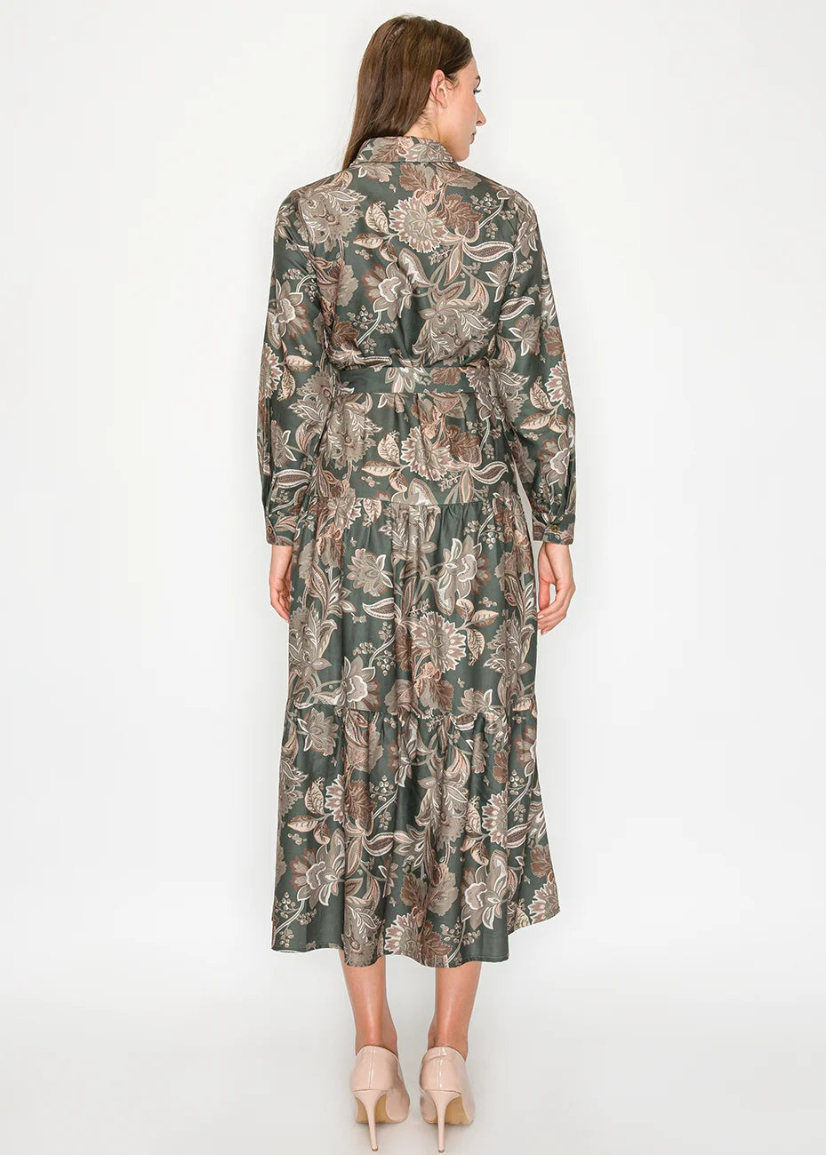 A button-front midi dress with a soft collar, waist tie, and flowing tiered skirt. Designed in a muted olive base with an allover floral print in warm neutrals.