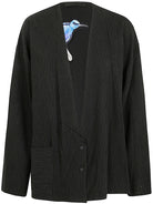 The standout detail is the beautiful blue hummingbird embellishment on the back, adding an unexpected artistic touch to this contemporary piece. With its classic crew neckline and button closure, this versatile jacket transitions seamlessly from office hours to weekend adventures.