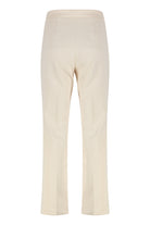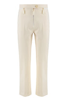 TROUSERS IN DOUBLE CRÊPE WITH A FITTED SILHOUETTE. THEY STAND OUT FOR THE DETAILS WITH A ZIPPER AT THE FRONT, FRAMED BY MATCHING PIPING. THE ENAMELED BUTTON WITH LOGO ADDS A LUMINOUS TOUCH. PART OF THE ESSENTIAL COLLECTION, TO BUILD THE PERFECT WARDROBE. MADE WITH HIGH-QUALITY FABRIC, THEY OFFER COMFORT AND DURABILITY OVER TIME.
