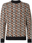 This stunning Fendi pullover features a bold geometric pattern in rich brown, black, and white tones that creates a striking retro-inspired aesthetic.