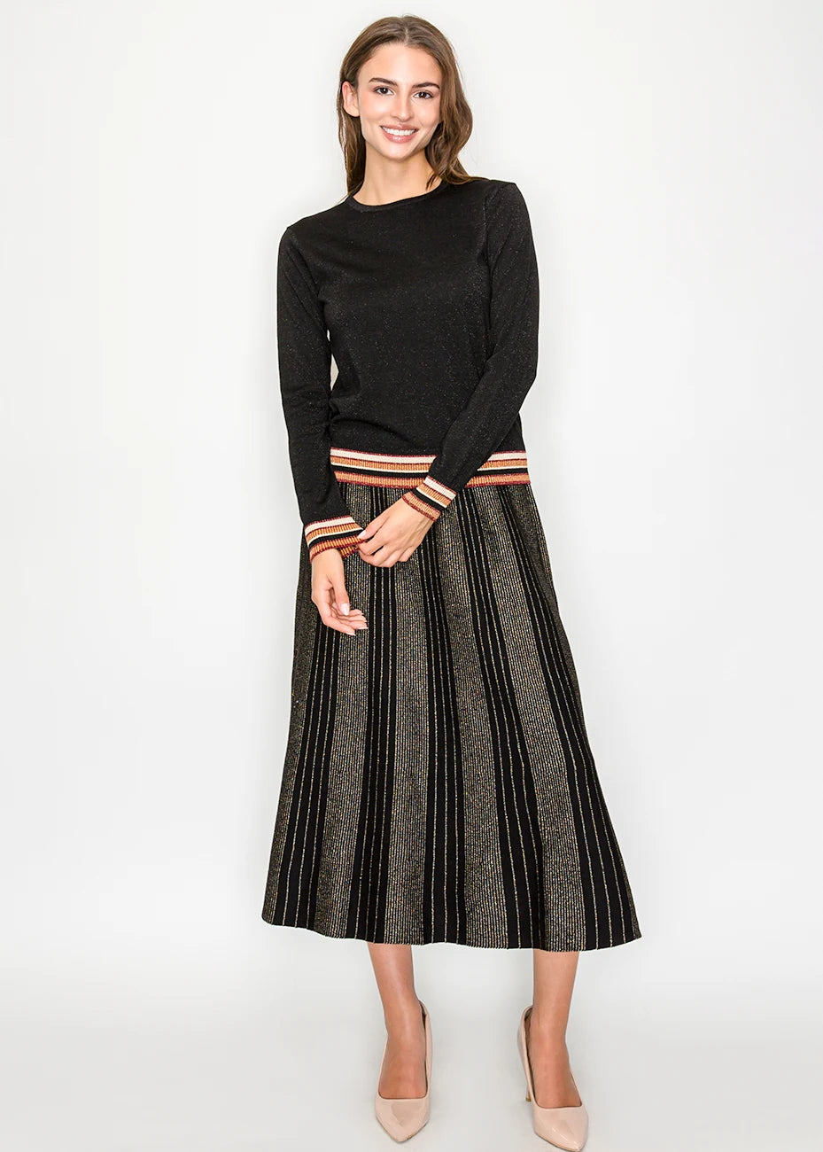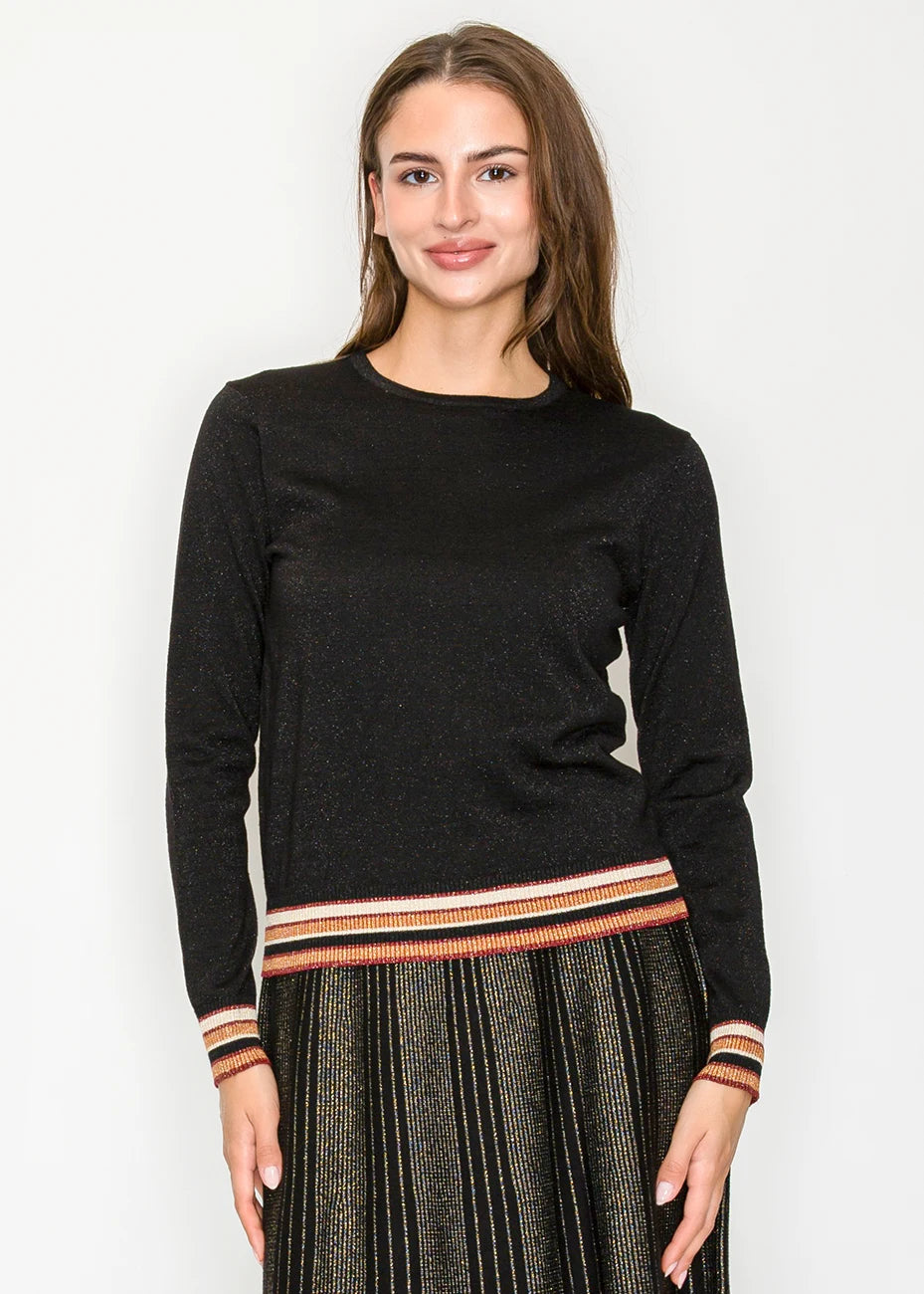 Bring quiet sparkle to your day. This lightweight pullover features a soft metallic finish and contrast ribbing in warm fall tones.