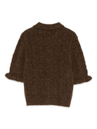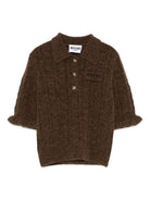 Elevate your knitwear collection with this luxuriously textured cardigan from Moschino Jeans. Crafted in a rich chocolate brown hue, this mixed-knit sweater features charming ruffled short sleeves and a classic button-front closure with a sophisticated shirt collar.