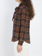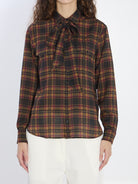 SAINT LAURENT LAVALLIERE TARTAN SHIRT BROWN BROWN CASSANDRE TARTAN DESIGN POINTED COLLAR REMOVABLE LAVALLIERE TIE FLAP PATCH POCKETS SINGLEBUTTON CUFFS WOOL SHIRTS TOPS CLOTHING WOMEN