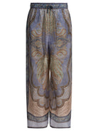 Elevate your warm-weather wardrobe with these stunning wide-leg trousers from Zimmermann. Featuring an exquisite paisley print in luxurious shades of blue, gold, and beige, these pants showcase the brand's signature bohemian elegance.