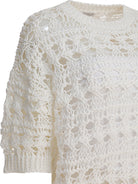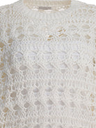 Elevate your knitwear collection with this exquisite White Jute Cotton Blend Knitwear from Brunello Cucinelli. Crafted from a luxurious blend of jute and cotton, this pullover features an intricate open-knit texture that exudes effortless sophistication and artisanal craftsmanship.