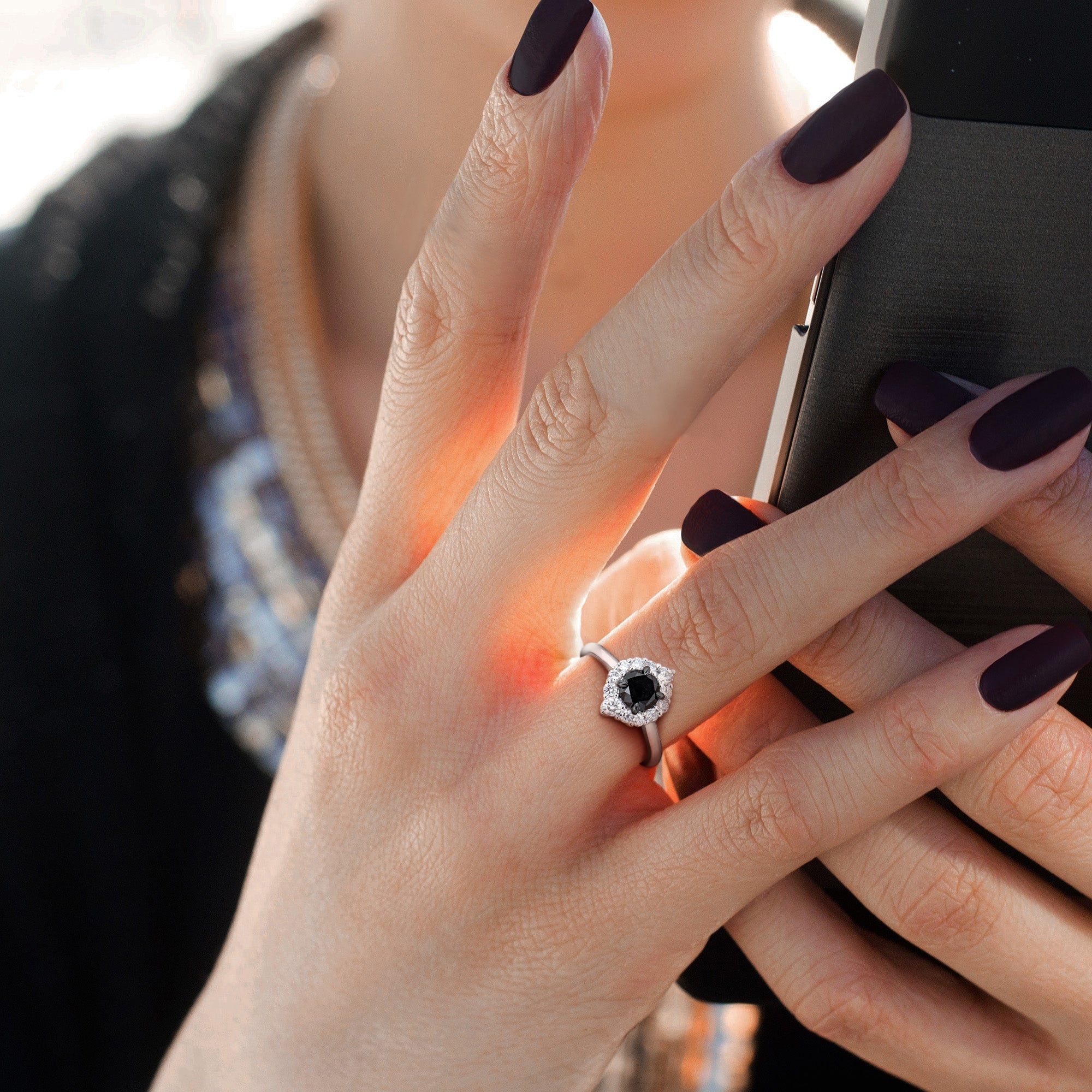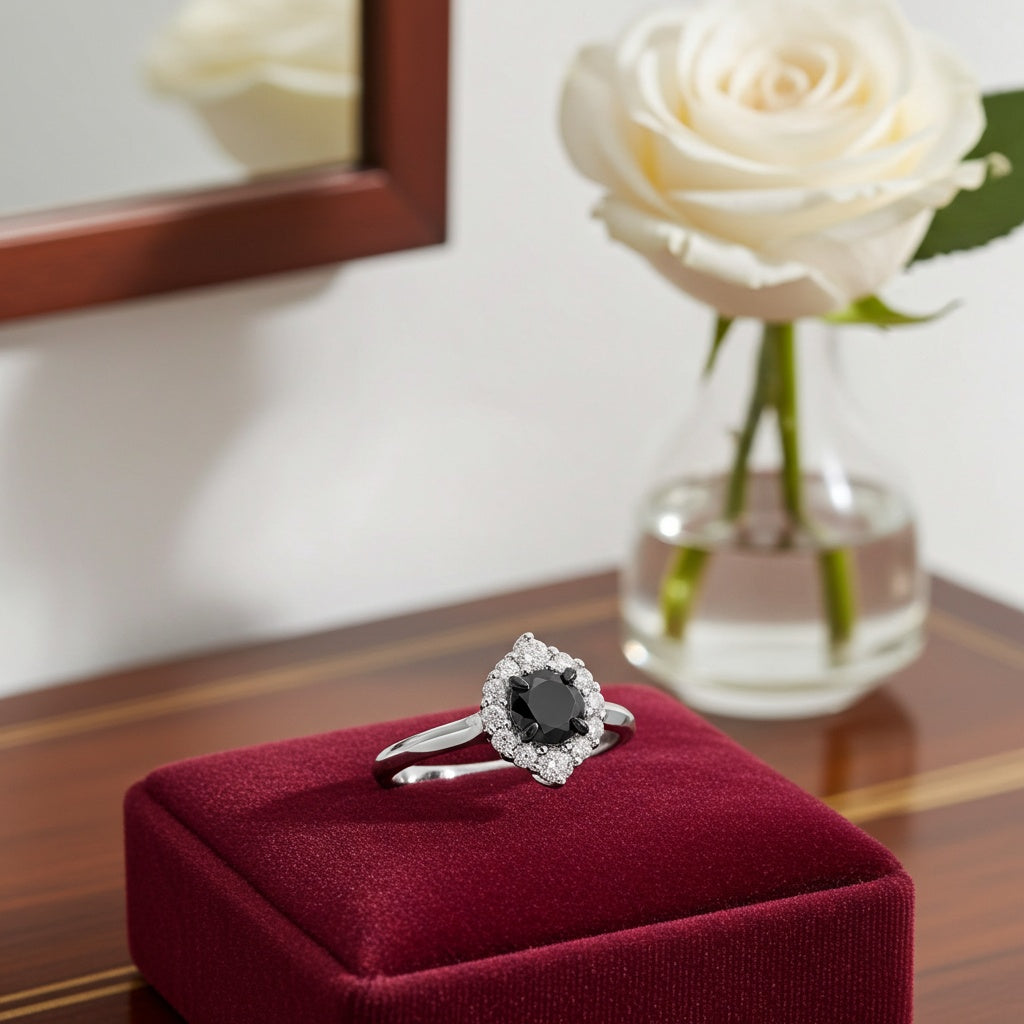 Celebrate your love with the striking Black and White Diamond Halo Engagement Ring. This stunning ring features a centerpiece of black and white diamonds set in a captivating halo design. Crafted with precision in luxurious 14k white gold, the ring exudes sophistication and modern elegance. Perfect for making a bold statement during a proposal or as a symbol of enduring commitment, this halo engagement ring combines the dramatic contrast of black and white diamonds with the timeless beauty of white gold, capturing attention with its striking design.