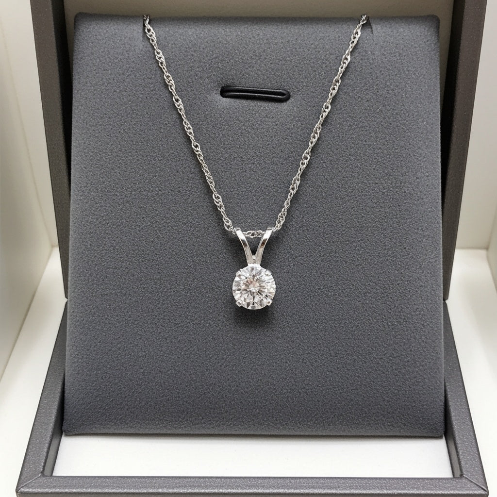 Discover timeless sophistication with our Lab-Grown Diamond Solitaire Pendant. Set in luminous 14k white gold, this pendant showcases a brilliant 1/2-carat lab-grown diamond, expertly cut to capture light and radiate an enchanting sparkle. The delicate 17-inch chain provides a refined backdrop to the diamond’s striking brilliance, making it a versatile and elegant choice for both everyday wear and special occasions. This piece embodies modern luxury, offering understated elegance that will never go out of style.