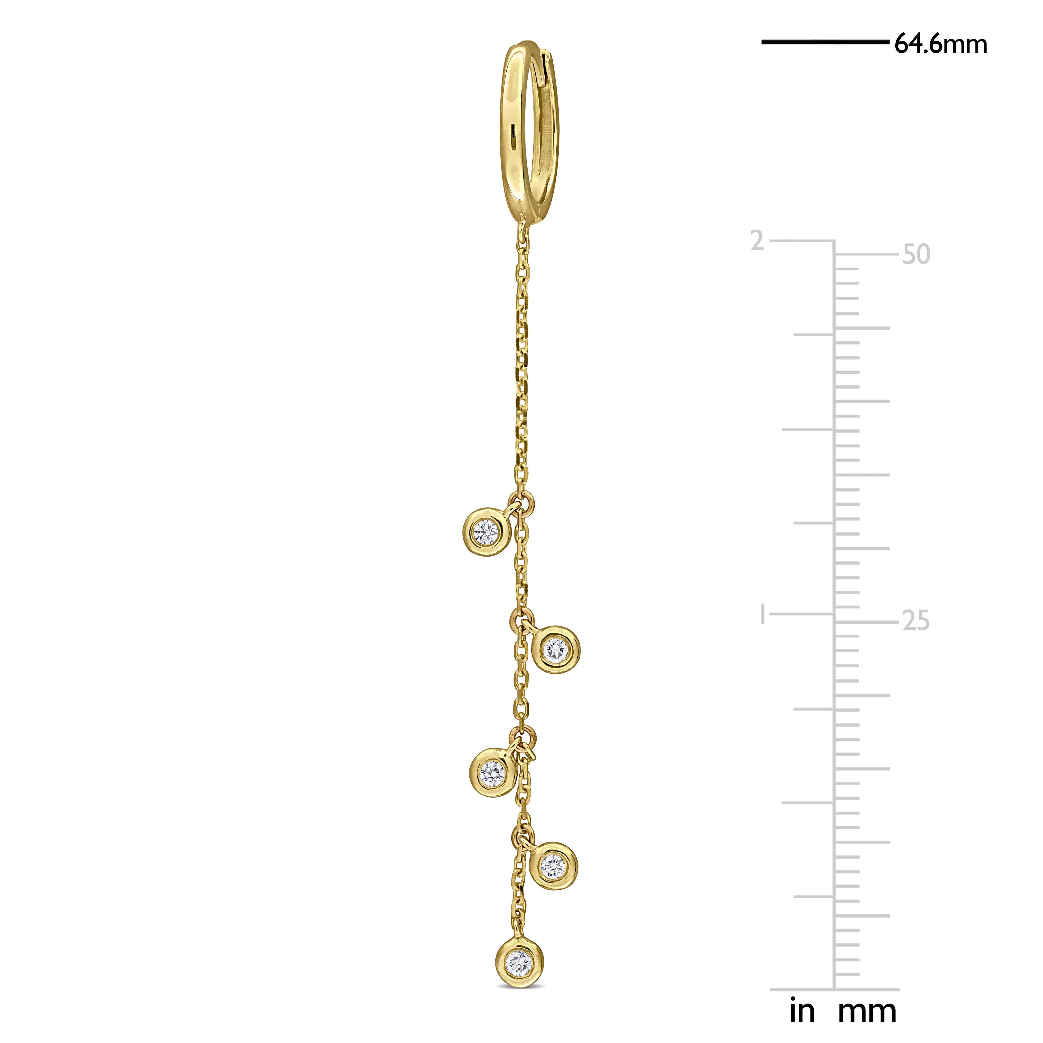 These sophisticated lab-grown diamond drop earrings in 14k yellow gold feature dazzling round bezel-set lab-grown diamonds beautifully station along the chain drop earrings creating an eye-catching sparkle. The 14k yellow gold setting enhances the brilliance of the diamonds, offering a luxurious and timeless appeal. Perfect for special occasions, these earrings add a touch of glamour to any outfit.