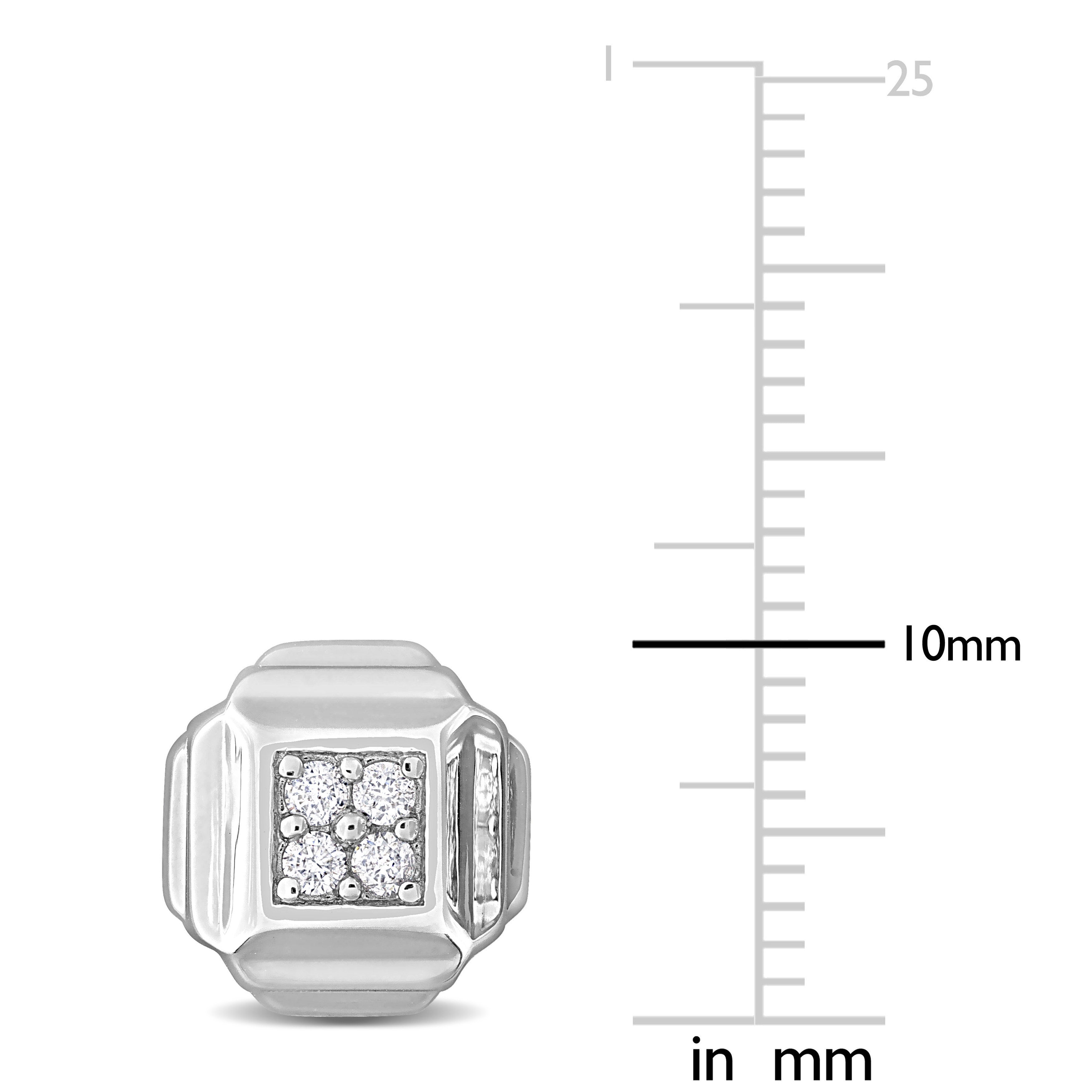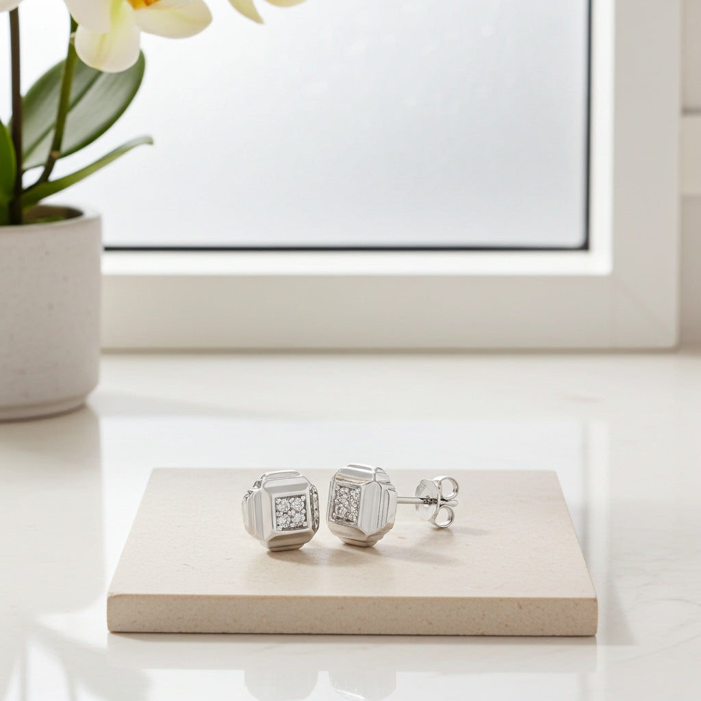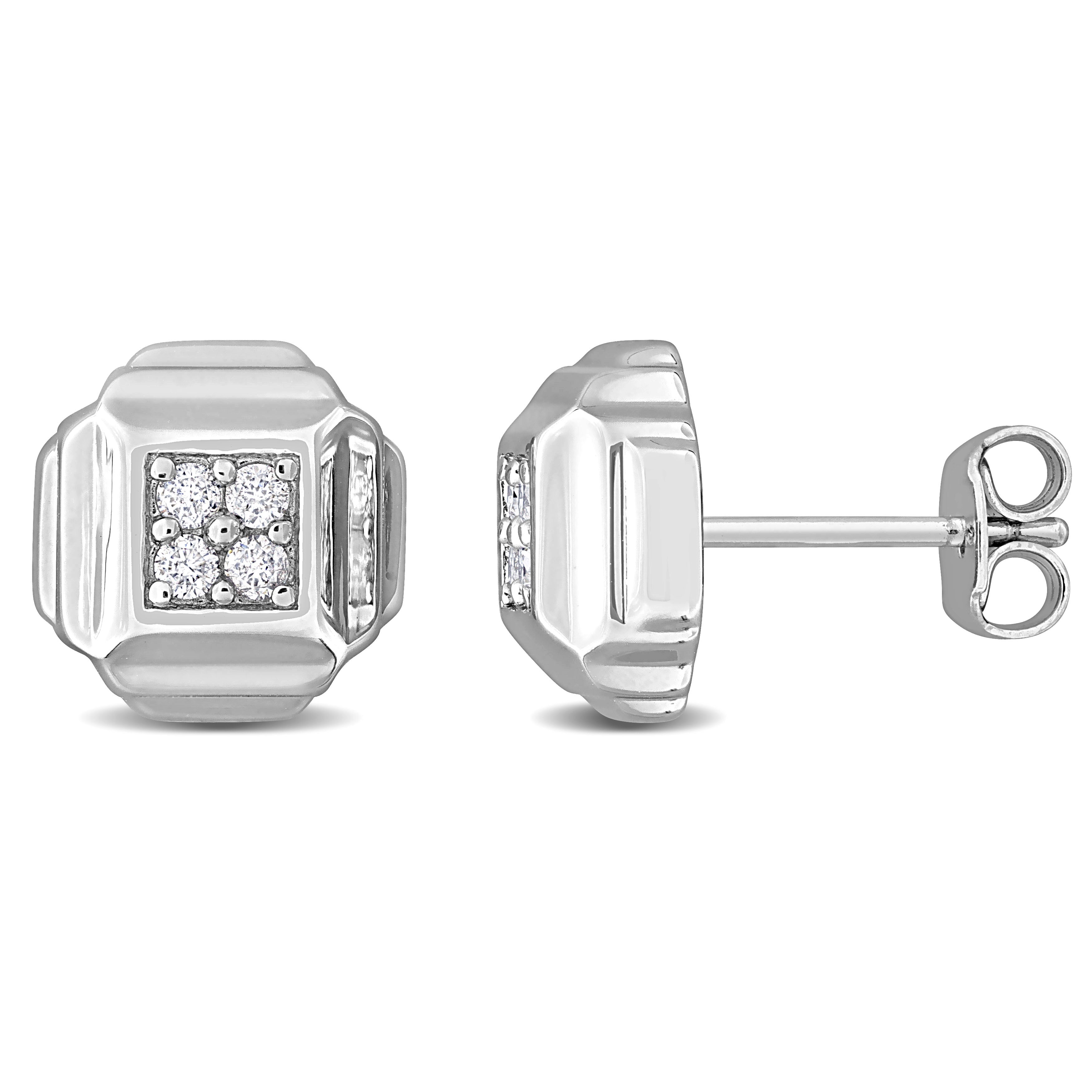 These lovely square stud earrings are crafted in sterling silver and features a total of eight dazzling diamonds in the center design. These earrings are enhanced with a high polish finish