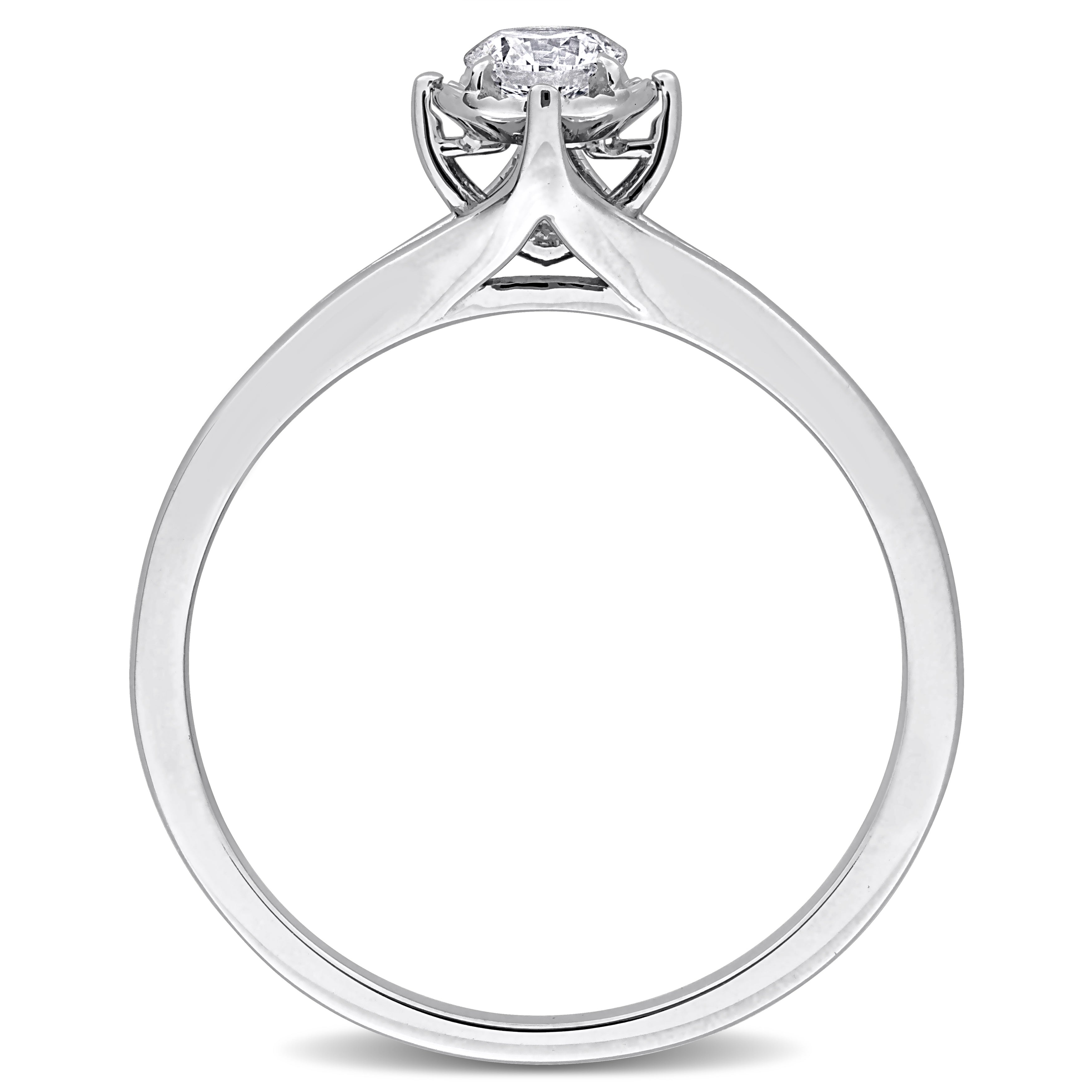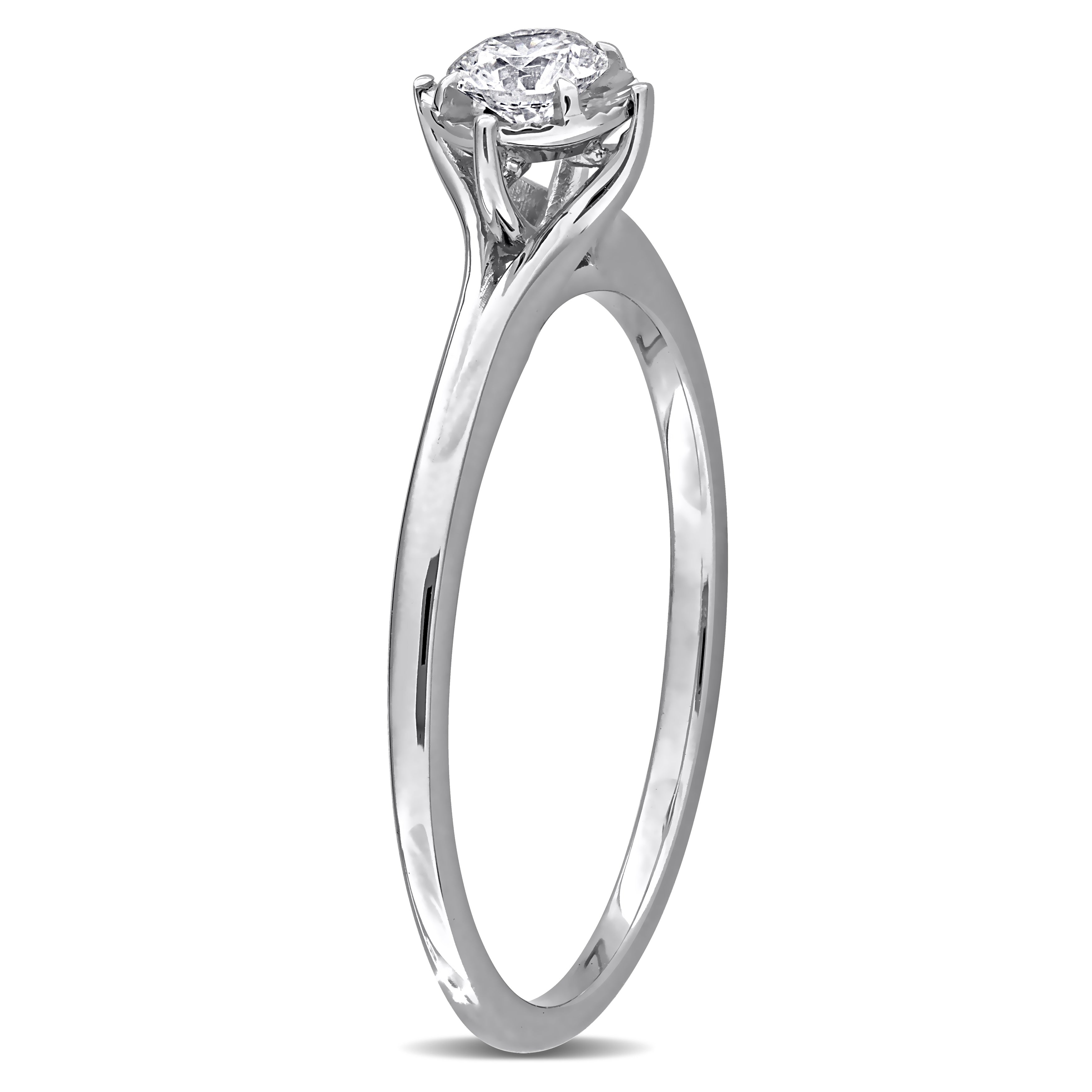 Bring feminine glamour to your everyday look with this beautiful solitaire engagement ring. Featuring a round-cut, multi-prong-set lab-grown diamond at the center on a sleek band crafted in 18k white gold. This classic ring is enhanced with a high polish finish.