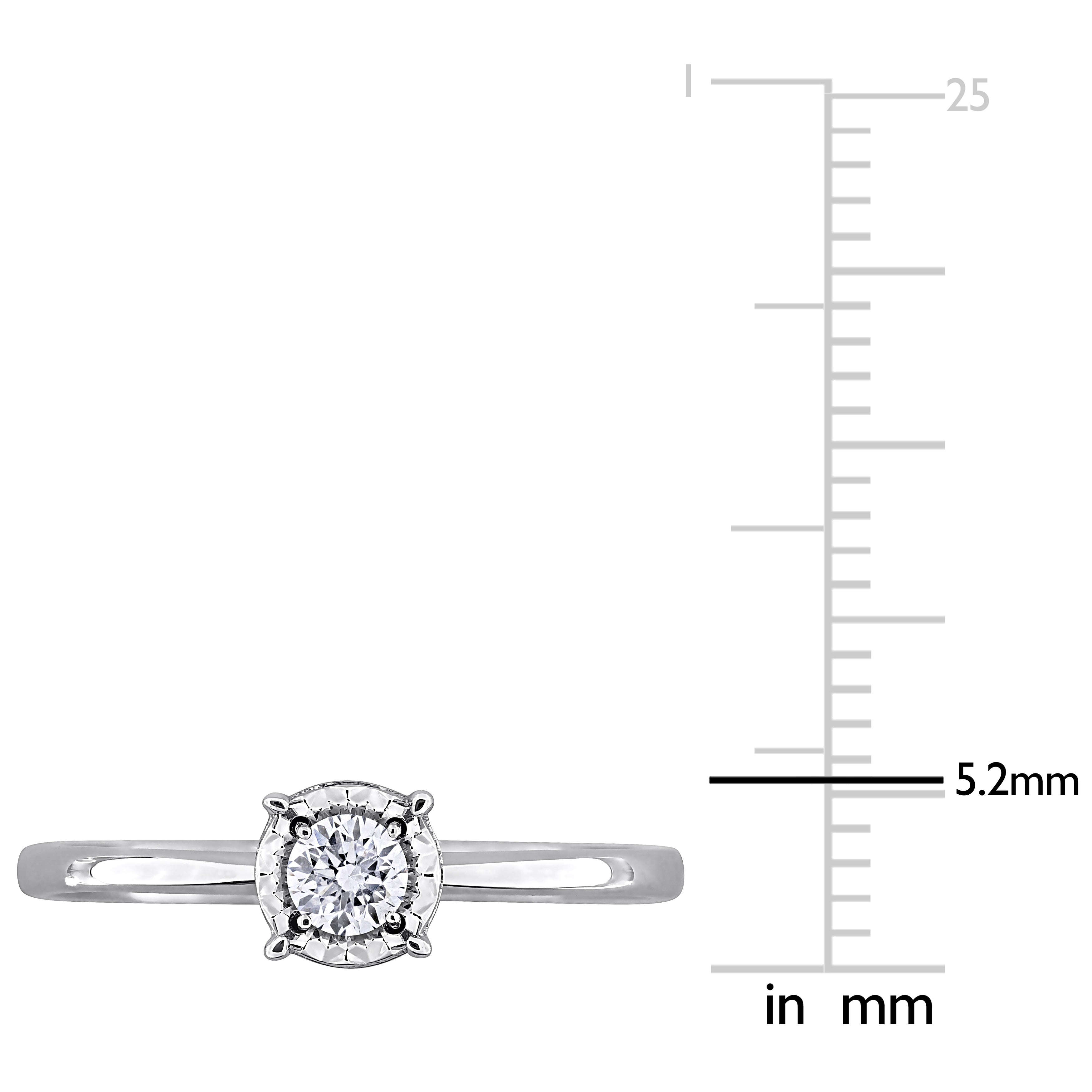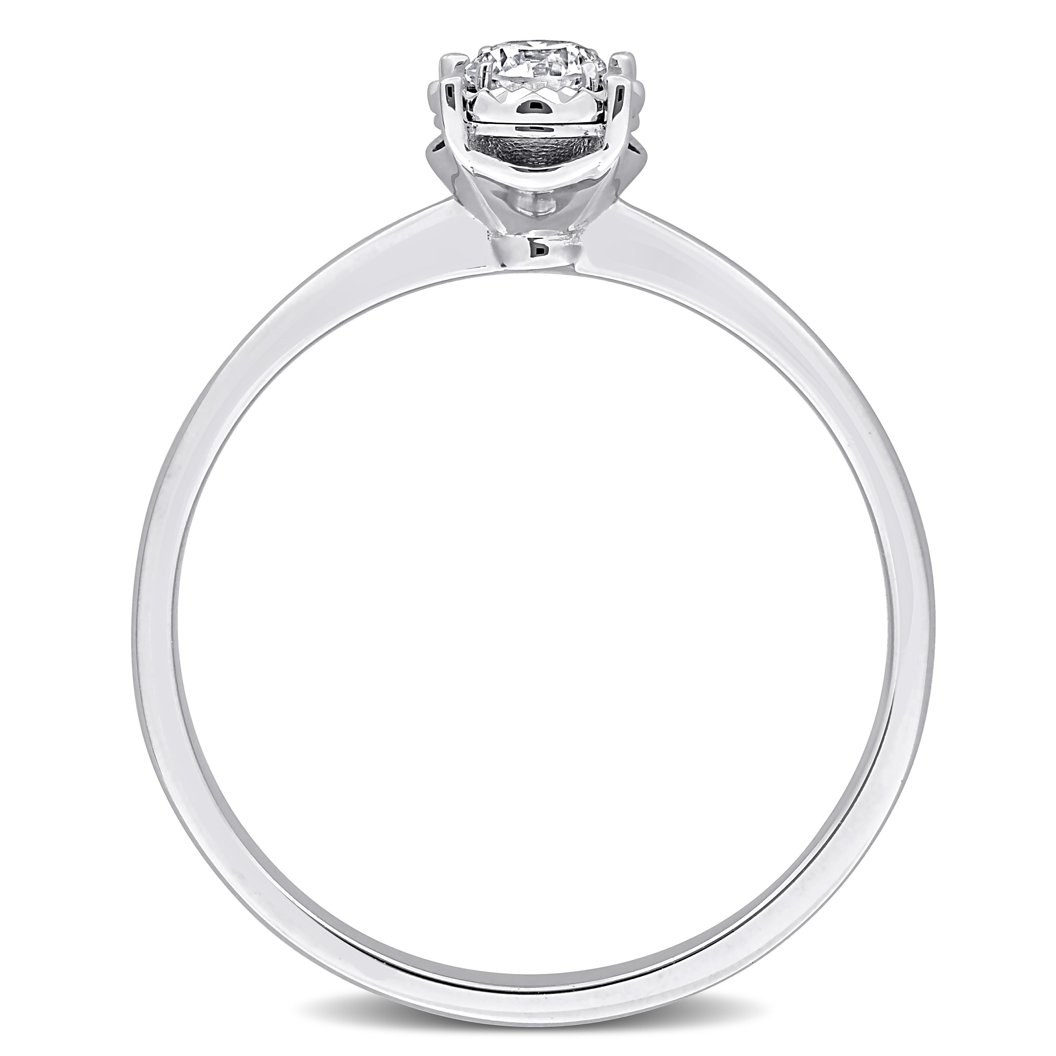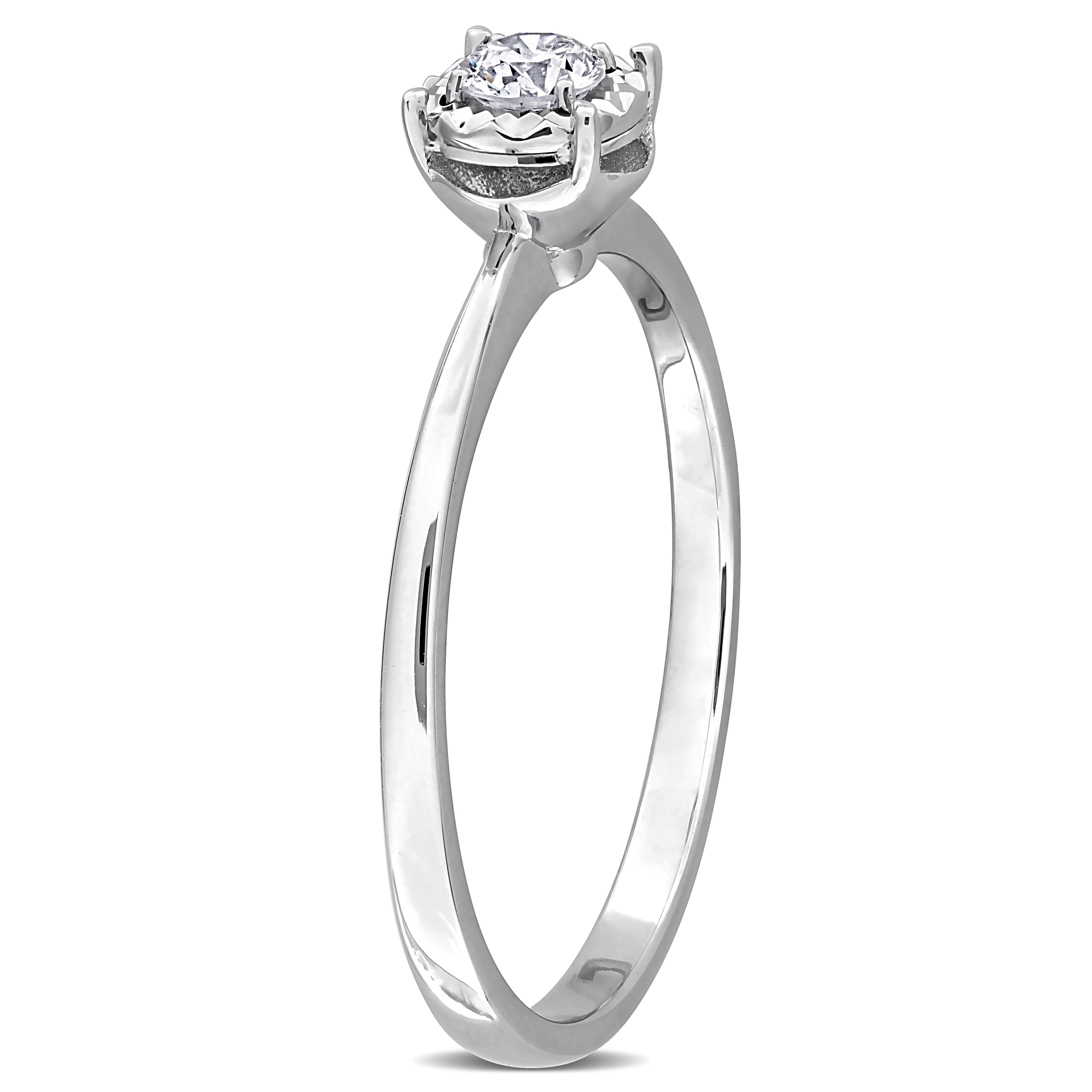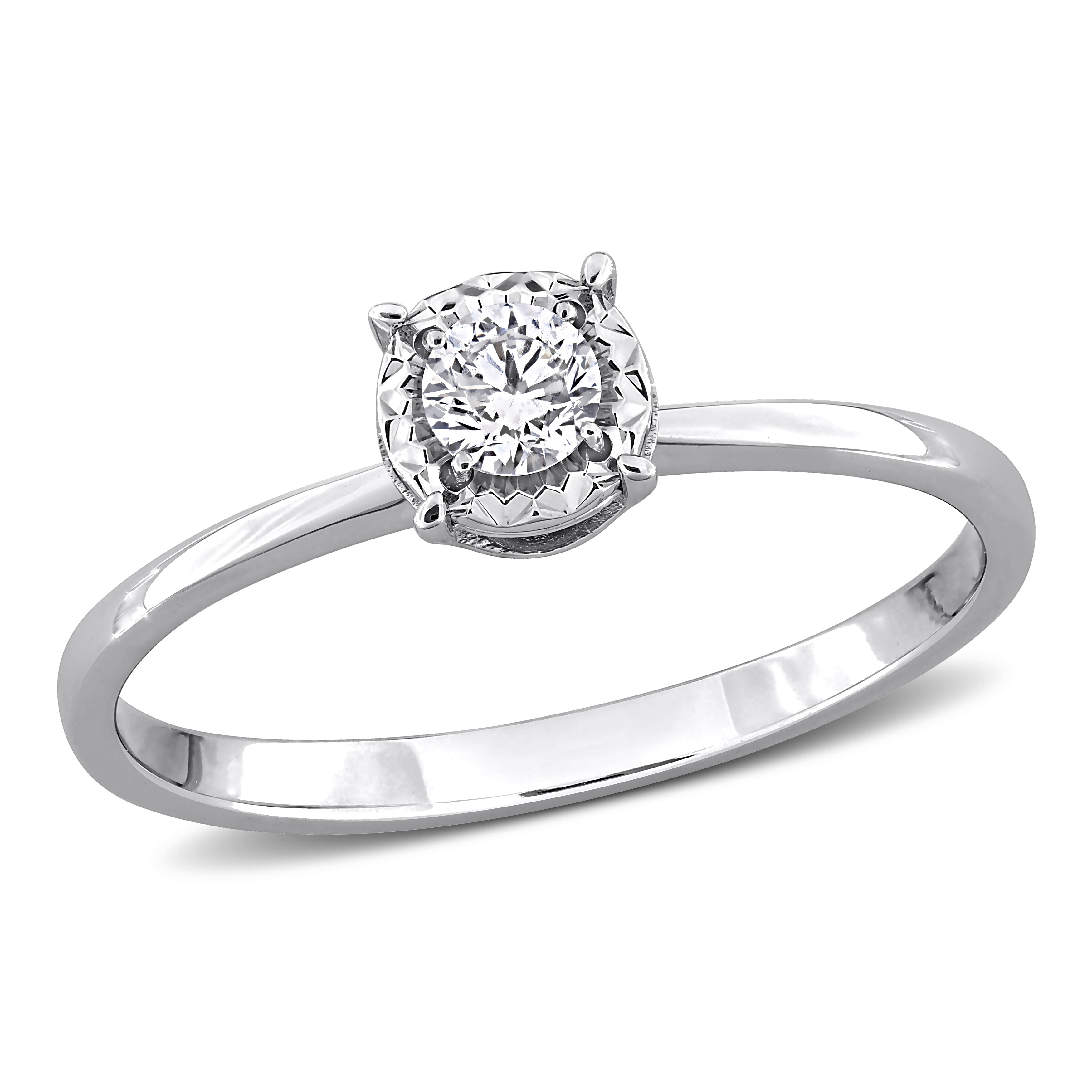 Bring feminine glamour to your everyday look with this beautiful solitaire engagement ring. Featuring a round-cut, 4-prong-set lab-grown diamond at the center halo design crafted in 18k white gold. This beautiful ring is enhanced with a high polish finish.