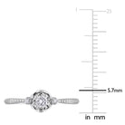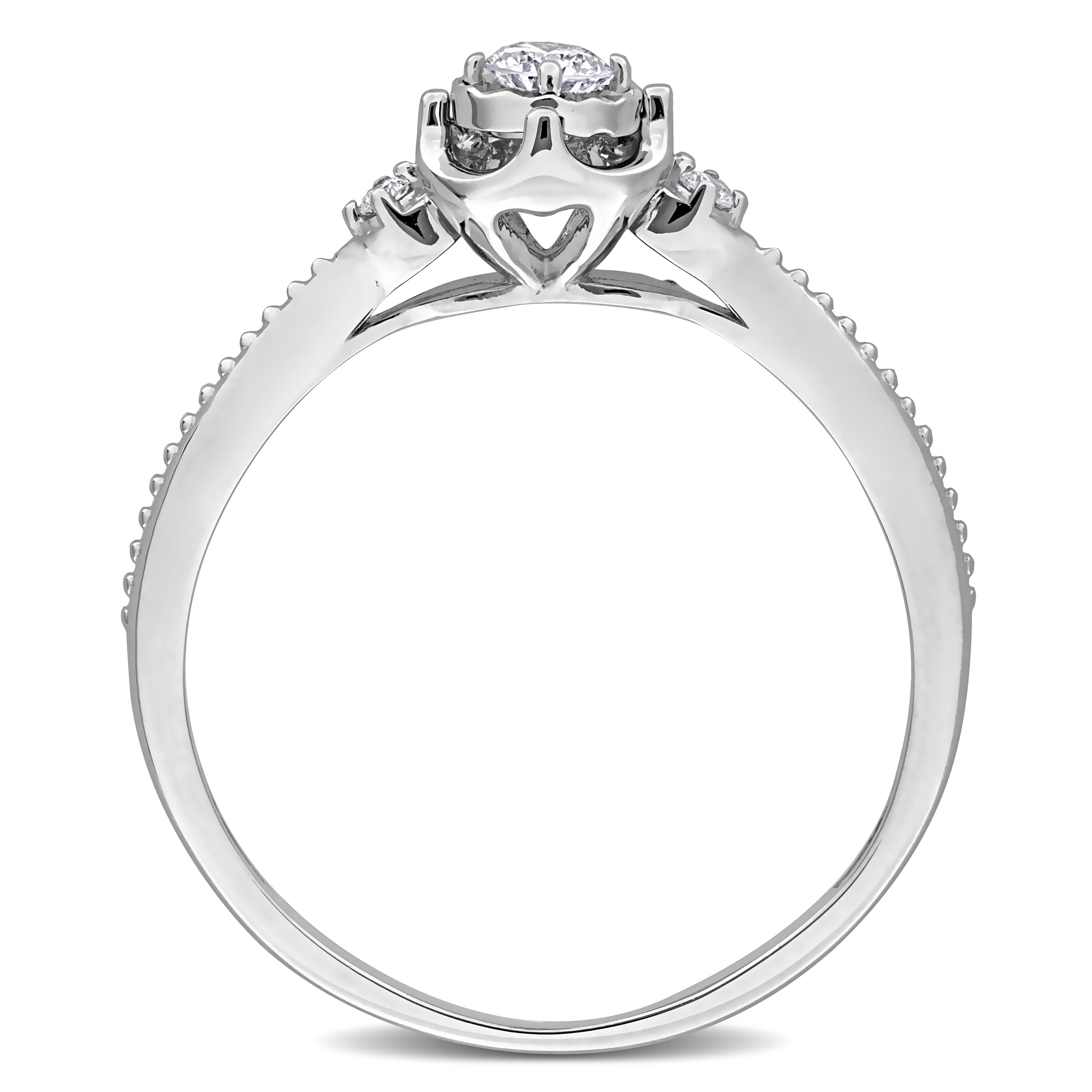 Present your loved one with this charming halo ring. Featuring a round-cut lab-grown diamond in the center halo design with a lab-grown diamond at each side of its elegant band crafted in 18k white gold. This beautiful ring is enhanced with a high polish finish.