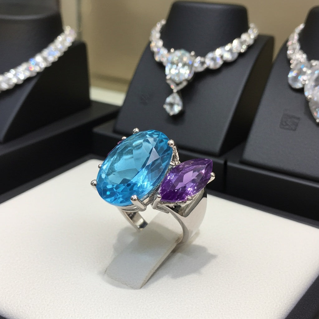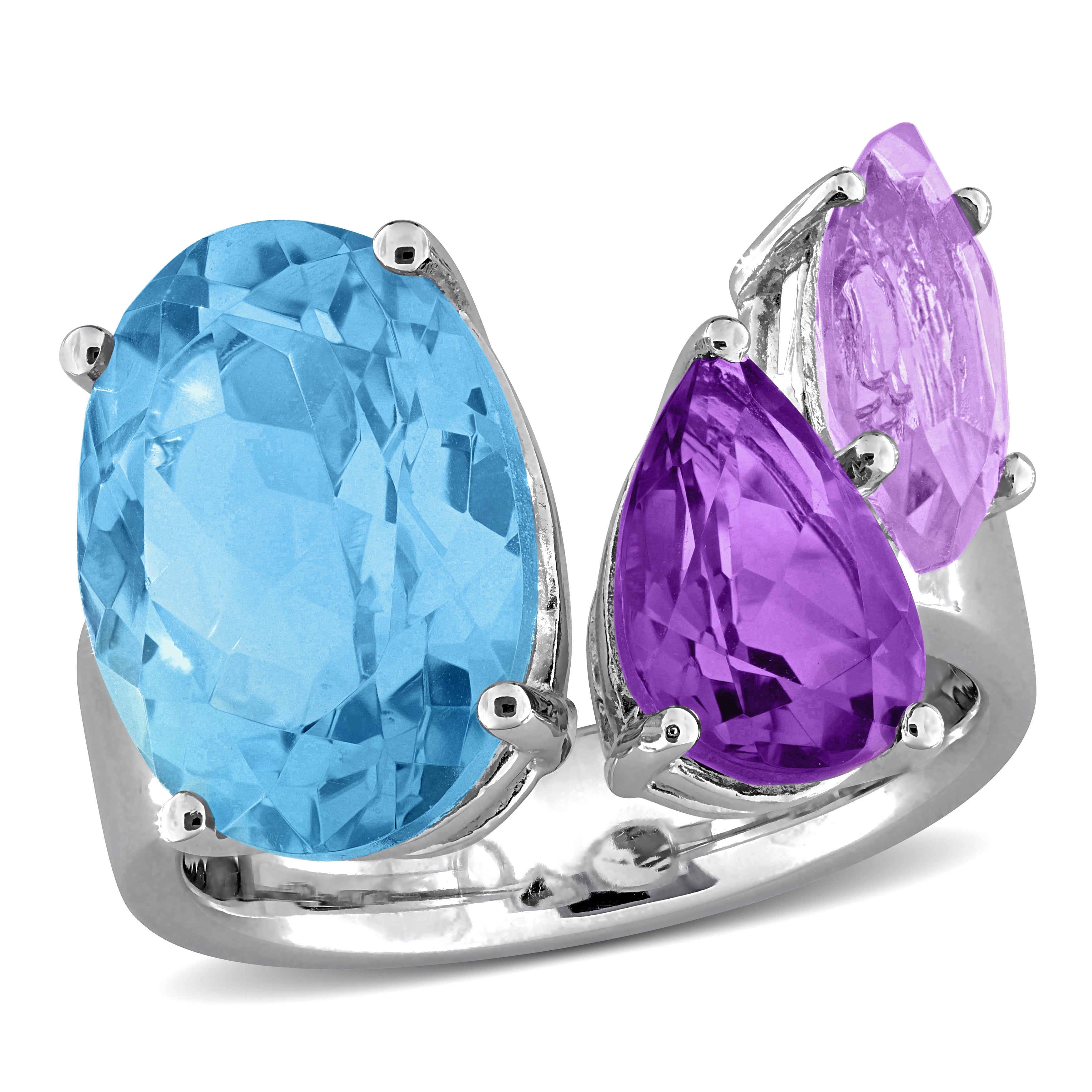 This beautiful ring is crafted in sterling silver and showcases a large oval-cut 14x10mm blue topaz gemstone at the center with a large pear-cut amethyst and a marquise-cut pink amethyst gemstones in an open cocktail design. This ring is enhanced with a high polish finish.