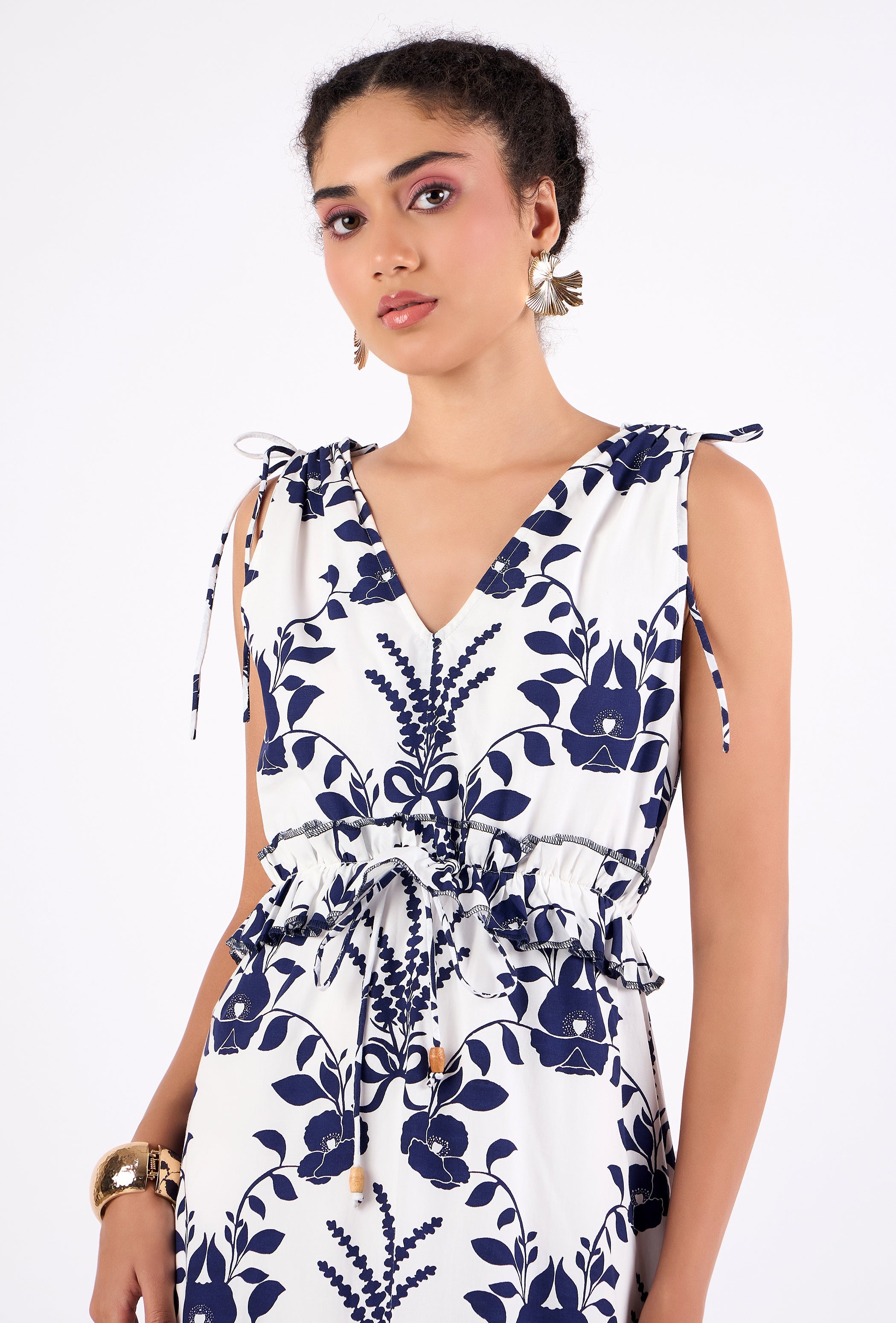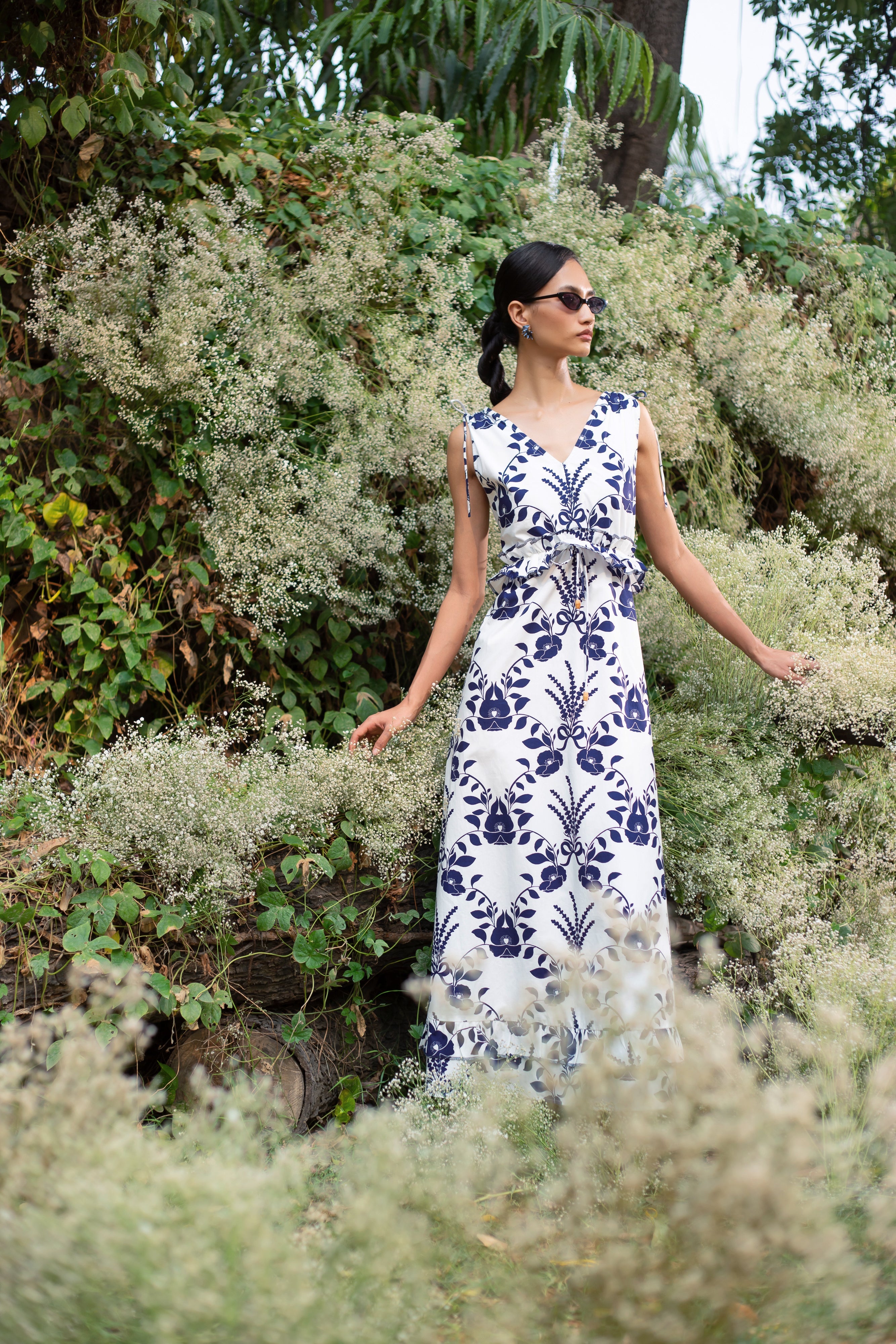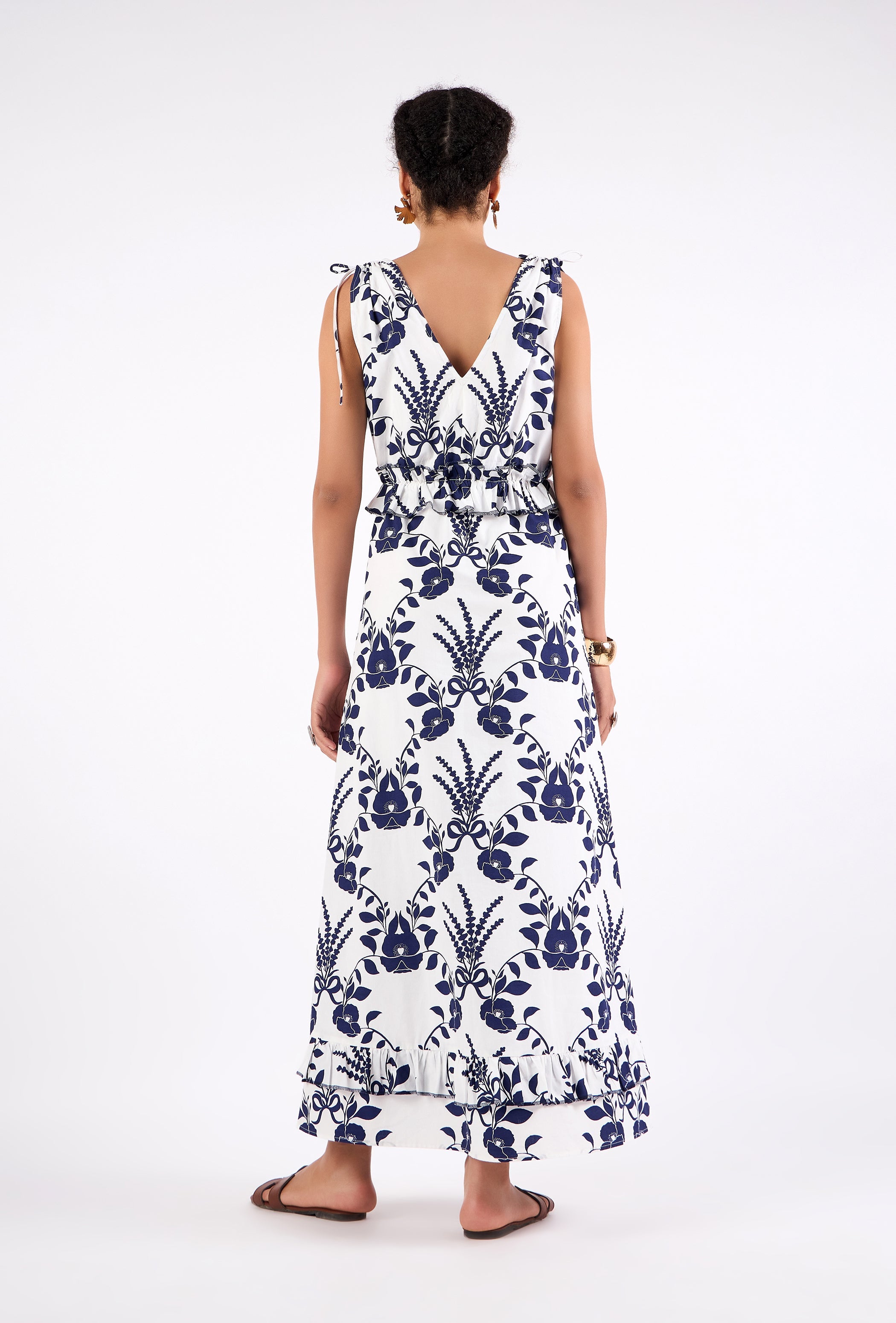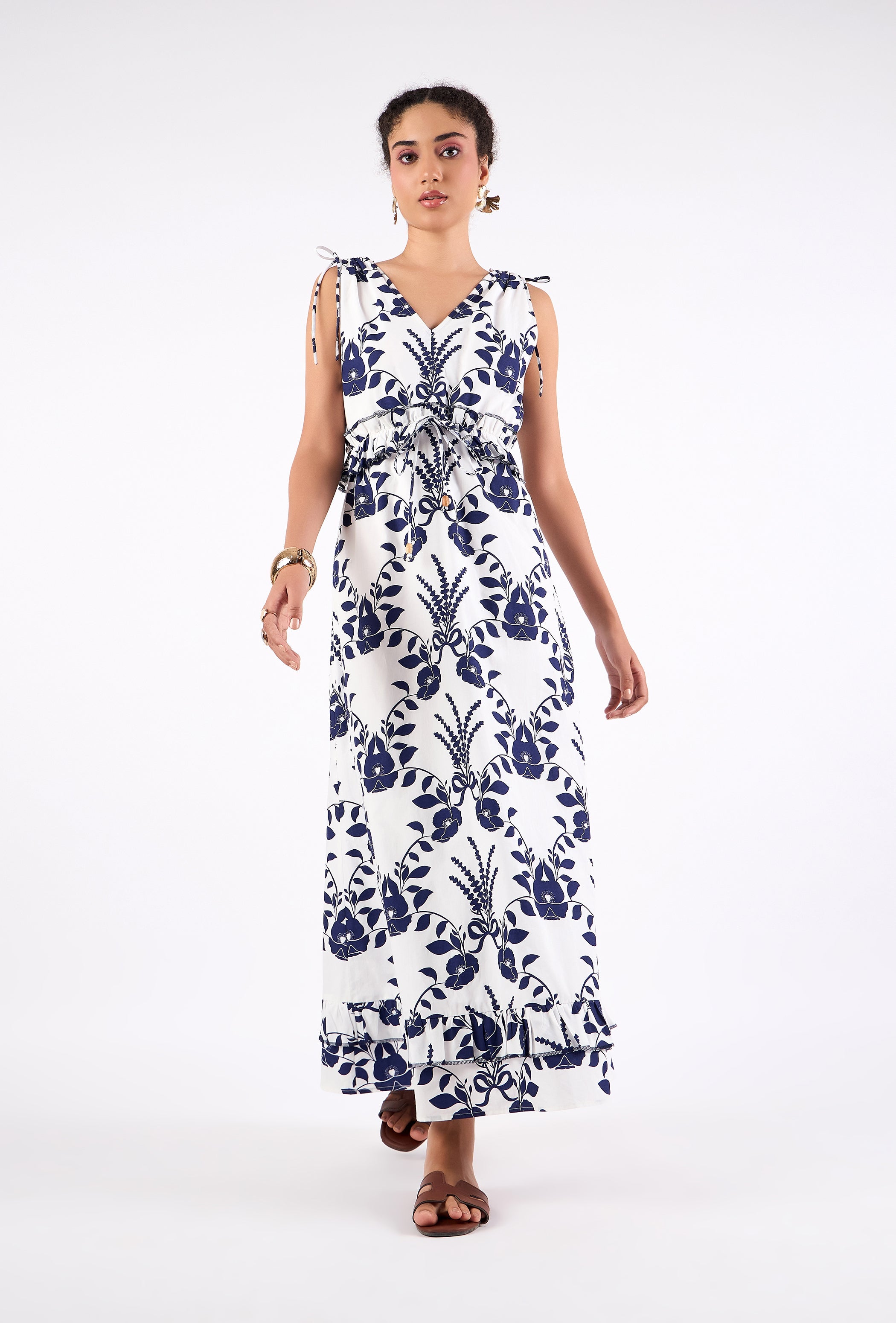 Stay cool and stylish in this airy dress, designed with drawstring ties at the shoulders and waist for a customizable fit. The chic A-line silhouette is enhanced by delicate ruffle details, making it a versatile piece that transitions seamlessly from casual days in sandals to elegant evenings in heels. Drew is crafted from breathable premium Cotton Poplin. This print design captures the serene beauty of Provence's endless poppy and lavender fields, where the air is filled with the soothing scent of spring.