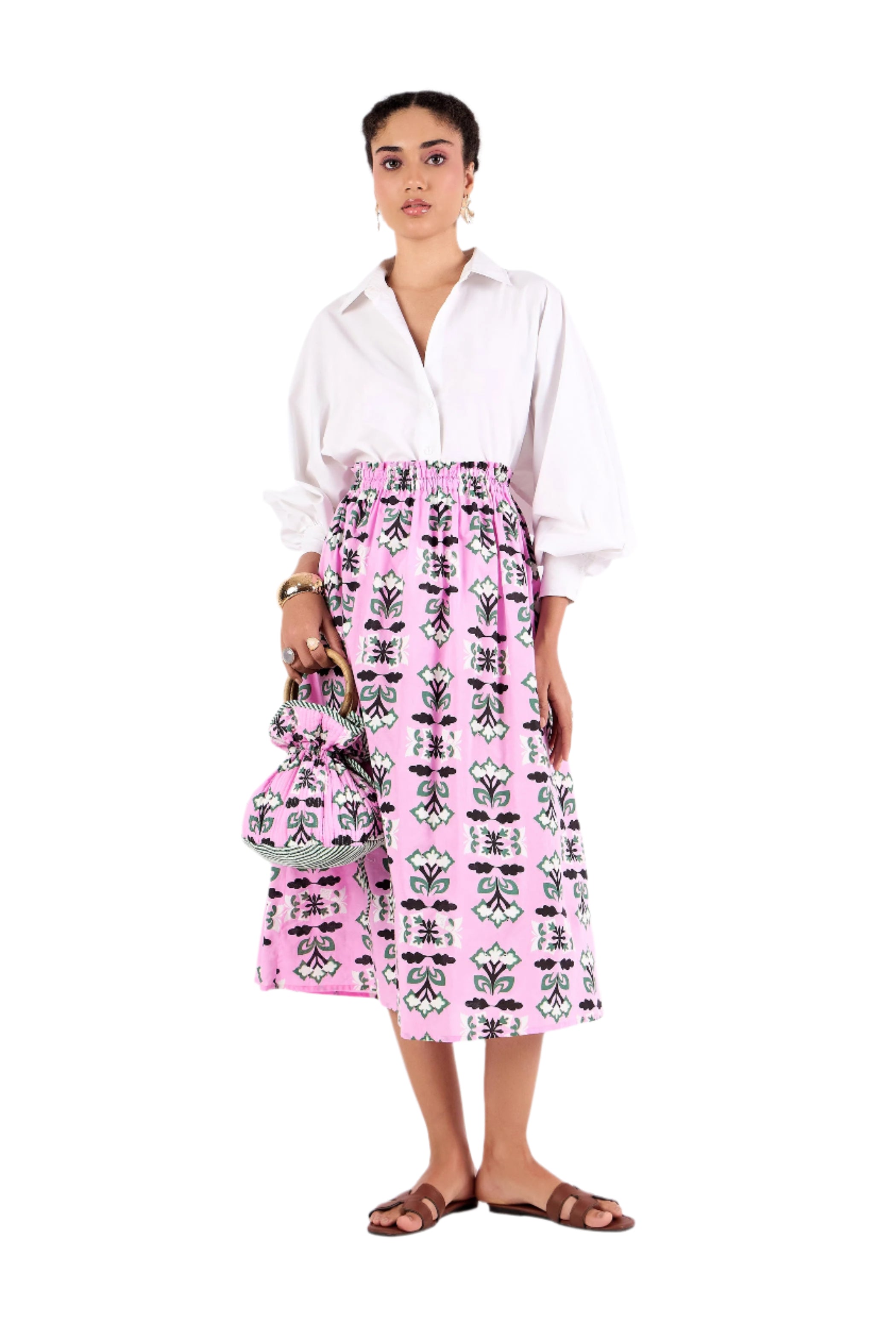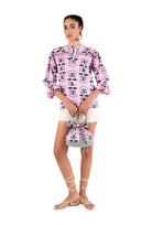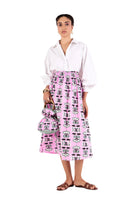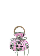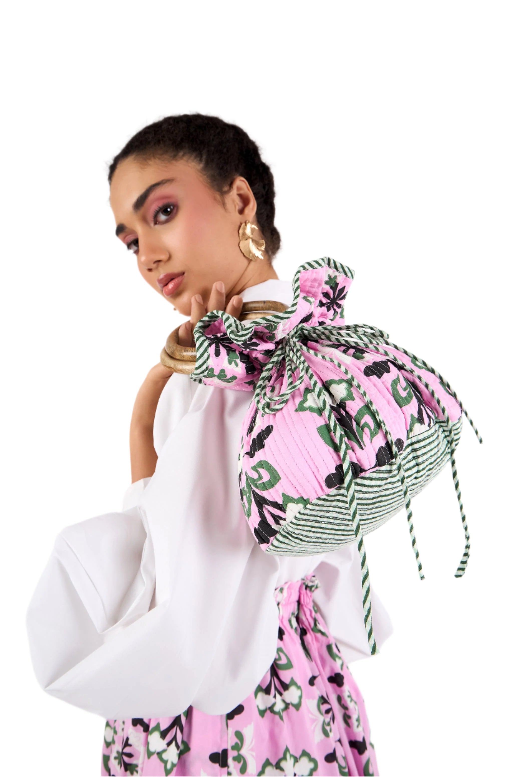 Bella's outer layer showcases our stunning hand-drawn print and is lined with recycled block-printed fabric. The drawstring closure adds a feminine touch, while the gathered fabric at the handles enhances its elegant design. Sturdy mango wood handles bring a natural, earthy element. This quilted bucket bag is a chic accessory that effortlessly elevates any outfit.